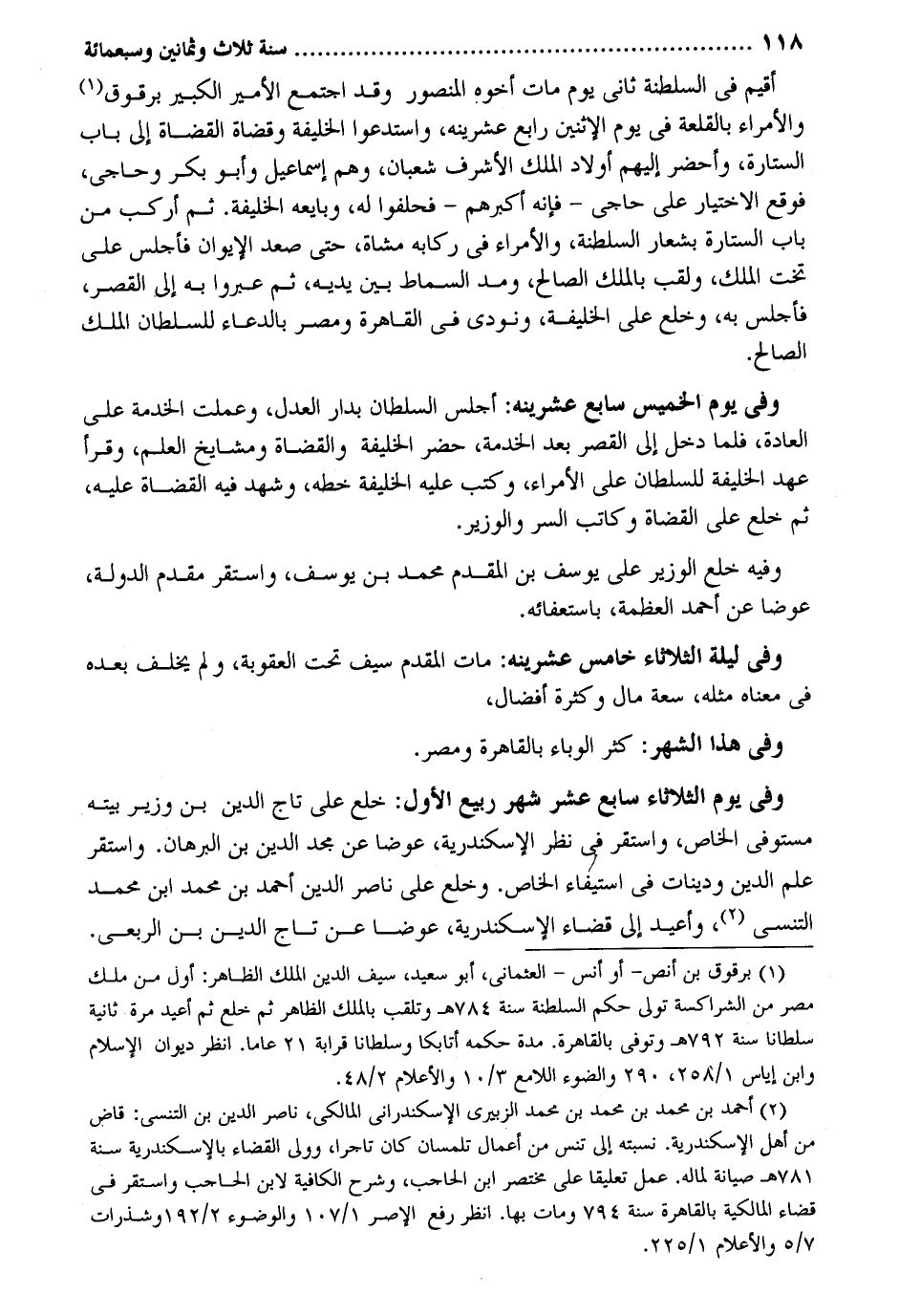 أقيم فِي السلطنة ثَانِي يَوْم مَاتَ أَخُوهُ الْمَنْصُور وَقد اجْتمع الْأَمِير الْكَبِير برقوق والأمراء بالقلعة فِي يَوْم الْإِثْنَيْنِ رَابِع عشرينه واستدعوا الْخَلِيفَة وقضاة الْقُضَاة إِلَى بَاب الستارة وأحضر إِلَيْهِم أَوْلَاد الْملك الْأَشْرَف شعْبَان وهم إِسْمَاعِيل وَأَبُو بكر وحاجي فَوَقع الِاخْتِيَار على حاجي - فَإِنَّهُ أكبرهم - فَحَلَفُوا لَهُ وَبَايَعَهُ الْخَلِيفَة. ثمَّ أركب من بَاب الستارة بشعار السلطنة والأمراء فِي ركابه مَشاهُ حَتَّى صعد الإيوان فأجلس على تخت الْملك ولقب بِالْملكِ الصَّالح وَمد السماط بَين يَدَيْهِ ثمَّ عبروا بِهِ إِلَى الْقصر فأجلس بِهِ وخلع على الْخَلِيفَة وَنُودِيَ فِي الْقَاهِرَة ومصر بِالدُّعَاءِ للسُّلْطَان الْملك الصَّالح. وَفِي يَوْم الْخَمِيس سَابِع عشرينه: أَجْلِس السُّلْطَان بدار الْعدْل وعملت الْخدمَة على الْعَادة فَلَمَّا دخل إِلَى الْقصر بعد الْخدمَة حضر الْخَلِيفَة والقضاة ومشايخ الْعلم وَقَرَأَ عهد الْخَلِيفَة للسُّلْطَان على الْأُمَرَاء وَكتب عَلَيْهِ الْخَلِيفَة خطه وَشهد فِيهِ الْقُضَاة عَلَيْهِ ثمَّ خلع على الْقُضَاة وَكَاتب السِّرّ والوزير وَفِيه خلع الْوَزير على يُوسُف بن الْمُقدم مُحَمَّد بن يُوسُف وَاسْتقر مقدم الدولة عوضا عَن أَحْمد العظمة باستعفائه. وَفِي لَيْلَة الثُّلَاثَاء خَامِس عشرينه: مَاتَ الْمُقدم سيف تَحت الْعقُوبَة وَلم يخلف بعده فِي مَعْنَاهُ وَفِي هَذَا الشَّهْر: كثر الوباء بِالْقَاهِرَةِ ومصر. وَفِي يَوْم الثُّلَاثَاء سَابِع عشر شهر ربيع الأول: خلع على تَاج الدّين بن وَزِير بَيته مُسْتَوْفِي الْخَاص وَاسْتقر فِي نظر الْإسْكَنْدَريَّة عوضا عَن مجد الدّين بن الْبُرْهَان. وَاسْتقر علم الدّين ودينات فِي اسْتِيفَاء الْخَاص. وخلع على نَاصِر الدّين أَحْمد بن مُحَمَّد ابْن مُحَمَّد التنسي وأعيد إِلَى قَضَاء الْإسْكَنْدَريَّة عوضا عَن تَاج الدّين بن الربعِي.