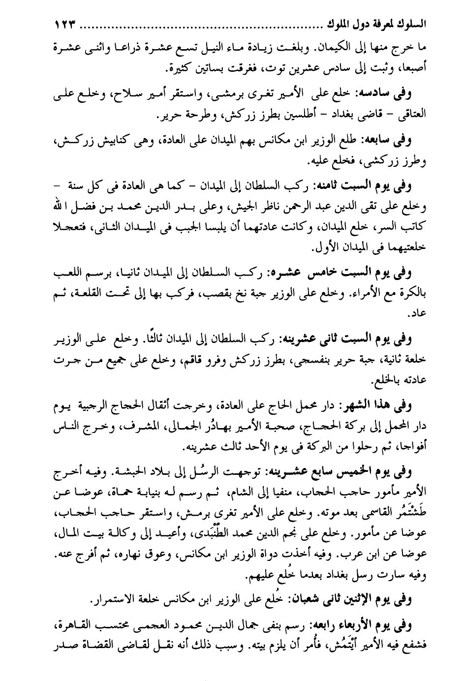 مَا خرج مِنْهَا إِلَى الكيمان. وَبَلغت زِيَادَة مَاء النّيل تسع عشرَة ذِرَاعا واثني عشرَة أصبعاً وَثَبت إِلَى سادس عشْرين توت فغرقت بساتين كَثِيرَة. وَفِي سادسه: خلع على الْأَمِير تغري برمشى وَاسْتقر أَمِير سلَاح وخلع على العتاقي - قَاضِي بَغْدَاد - أطلسين بطرز زركش وطرحة حَرِير. وَفِي سابعه: طلع الْوَزير ابْن مكانس بهم الميدان على الْعَادة وَهِي كنابيش زركش وطرز زركشي فَخلع عَلَيْهِ. وَفِي يَوْم السبت ثامنه: ركب السُّلْطَان إِلَى الميدان - كَمَا هِيَ الْعَادة فِي كل سنة - وخلع على تَقي الدّين عبد الرَّحْمَن نَاظر الْجَيْش وعَلى بدر الدّين مُحَمَّد بن فضل الله كَاتب السِّرّ خلع الميدان وَكَانَت عَادَتهمَا أَن يلبسا الجبب فِي الميدان الثَّانِي فتعجلا خلعتيهما فِي الميدان الأول. وَفِي يَوْم السبت خَامِس عشره: ركب السُّلْطَان إِلَى الميدان ثَانِيًا برسم اللّعب بالكرة مَعَ الْأُمَرَاء. وخلع على الْوَزير جُبَّة نخ بقصب فَركب بهَا إِلَى تَحت القلعة ثمَّ عَاد. وَفِي يَوْم السبت ثَمَانِي عشرينه: ركب السُّلْطَان إِلَى الميدان ثَالِثا. وخلع على الْوَزير خلعة ثَانِيَة جُبَّة حَرِير بنفسجي بطرز زركش وفرو قاقم وخلع على جَمِيع من جرت عَادَته بِالْخلْعِ. وَفِي هَذَا الشَّهْر: دَار محمل الْحَاج على الْعَادة وَخرجت أثقال الْحجَّاج الرجبية يَوْم دَار الْمحمل إِلَى بركَة الْحجَّاج صُحْبَة الْأَمِير بهادُر الجمالي المشرف وَخرج النَّاس أَفْوَاجًا ثمَّ رحلوا من الْبركَة فِي يَوْم الْأَحَد ثَالِث عشرينه. وَفِي يَوْم الْخَمِيس سَابِع عشرينه: تَوَجَّهت الرسُل إِلَى بِلَاد الْحَبَشَة. وَفِيه أخرج الْأَمِير مَأْمُور حَاجِب الْحجاب منفياً إِلَى الشَّام ثمَّ رسم لَهُ بنيابة حماة عوضا عَن طَشتمر القاسمي بعد مَوته. وخلع على الْأَمِير تغري برمش وَاسْتقر حَاجِب الْحجاب عوضا عَن مَأْمُور. وخلع على نجم الدّين مُحَمَّد الطنبَدي وأعيد إِلَى وكَالَة بَيت المَال عوضا عَن ابْن عرب. وَفِيه أخذت دَوَاة الْوَزير ابْن مكانس وعوق نَهَاره ثمَّ أفرج عَنهُ. وَفِيه سارترسل بَغْدَاد بَعْدَمَا خُلع عَلَيْهِم. وَفِي يَوْم الْإِثْنَيْنِ ثَانِي شعْبَان: خُلع على الْوَزير ابْن مكانس خلعة الِاسْتِمْرَار. وَفِي يَوْم الْأَرْبَعَاء رابعه: رسم بِنَفْي جمال الدّين مَحْمُود العجمي محتسب الْقَاهِرَة فشفع فِيهِ الْأَمِير أيتمش فَأمر أَن يلْزم بَيته. وَسبب ذَلِك أَنه نقل لقَاضِي الْقُضَاة صدر