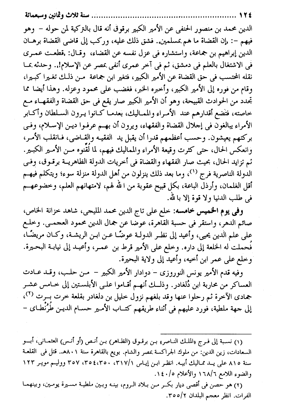 الدّين مُحَمَّد بن مَنْصُور الْحَنَفِيّ عَن الْأَمِير الْكَبِير برقوق أَنه قَالَ بالتركية لمن حوله - وَهُوَ - فيهم -: إِن الْقُضَاة مَا هم. بمسلمين. فشق ذَلِك عَلَيْهِ وَركب إِلَى قَاضِي الْقُضَاة برهَان الدّين إِبْرَاهِيم بن جمَاعَة واستشاره فِي عزل نَفسه عَن الْقَضَاء وَقَالَ: قطعت عمري فِي الِاشْتِغَال بِالْعلمِ فِي دمشق ثمَّ فِي آخر عمري أنفى بِمصْر عَن الْإِسْلَام. وحدثه. بِمَا نَقله الْمُحْتَسب فِي حق الْقُضَاة عَن الْأَمِير الْكَبِير فَتغير ابْن جمَاعَة من ذَلِك تغيراً كَبِيرا وَقَامَ من فوره إِلَى الْأَمِير الْكَبِير وَأخْبرهُ الْخَبَر فَغَضب على مَحْمُود وعزله. وَهَذَا أَيْضا مِمَّا تجدّد من الْحَوَادِث القبيحة وَهُوَ أَن الْأَمِير الْكَبِير صَار يَقع فِي حق الْقُضَاة وَالْفُقَهَاء مَعَ خاصته فتضع أقدارهم عِنْد الْأُمَرَاء والمماليك بَعْدَمَا كَانُوا يرَوْنَ السُّلْطَان وأكابر الْأُمَرَاء ييالغون فِي إجلال الْقُضَاة وَالْفُقَهَاء ويرون أَن بهم عرفُوا دين الْإِسْلَام وَفِي بركتهم يعيشون. وَحسب أعظمهم قدرا أَن يقبل يَد الْفَقِيه وَالْقَاضِي فَانْقَلَبَ الْأَمر وانعكس الْحَال حَتَّى كثرت وقيعة الْأُمَرَاء والمماليك فيهم لما لُقِّنوه من الْأَمِير الْكَبِير. ثمَّ تزايد الْحَال بِحَيْثُ صَار الْفُقَهَاء والقضاة فِي أخريات الدولة الظَّاهِرِيَّة برقوق وَفِي الدولة الناصرية فرج وَمَا بعد ذَلِك ينزلون من أهل الدولة منزلَة سوء وَيتَكَلَّم فيهم أقل الغلمان وأرذل الباعة بِكُل قَبِيح عُقُوبَة من الله لَهُم لامتهانهم الْعلم وخضوعهم فِي طلب الدُّنْيَا وَلَا قُوَّة إِلَّا بِاللَّه. وَفِي يَوْم الْخَمِيس خامسه: خلع على تَاج الدّين مُحَمَّد المليجي شَاهد خزانَة الْخَاص صَائِم الدَّهْر وَاسْتقر فِي حسبَة الْقَاهِرَة عوضا عَن جمال الدّين مَحْمُود العجمي. وخلع على علم الدّين يحيى وأعيد إِلَى نظر الدولة عوضا عَن ابْن الريشة وَكَانَ مَرِيضا فُحملت لَهُ الخلعة إِلَى دَاره. وخلع على الْأَمِير قرط بن عمر وأعيد إِلَى نِيَابَة الْبحيرَة. وخلع على عمر ابْن أَخِيه وأعيد إِلَى ولَايَة الْبحيرَة. وَفِيه قدم الْأَمِير يُونُس النوروزي - دوادار الْأَمِير الْكَبِير - من حلب وَقد عَادَتْ العساكر من محاربة ابْن دلغادر. وَذَلِكَ أَنهم أَقَامُوا على الأبلستين إِلَى خَامِس عشر جُمَادَى الْآخِرَة ثمَّ رحلوا عَنْهَا وَقد بَلغهُمْ نزُول خَلِيل بن دلغادر بقلعة خرت برت إِلَى جِهَة ملطية فورد عَلَيْهِم فِي أثْنَاء طريقهم كتاب الْأَمِير حسام الدّين طُرنطاي -