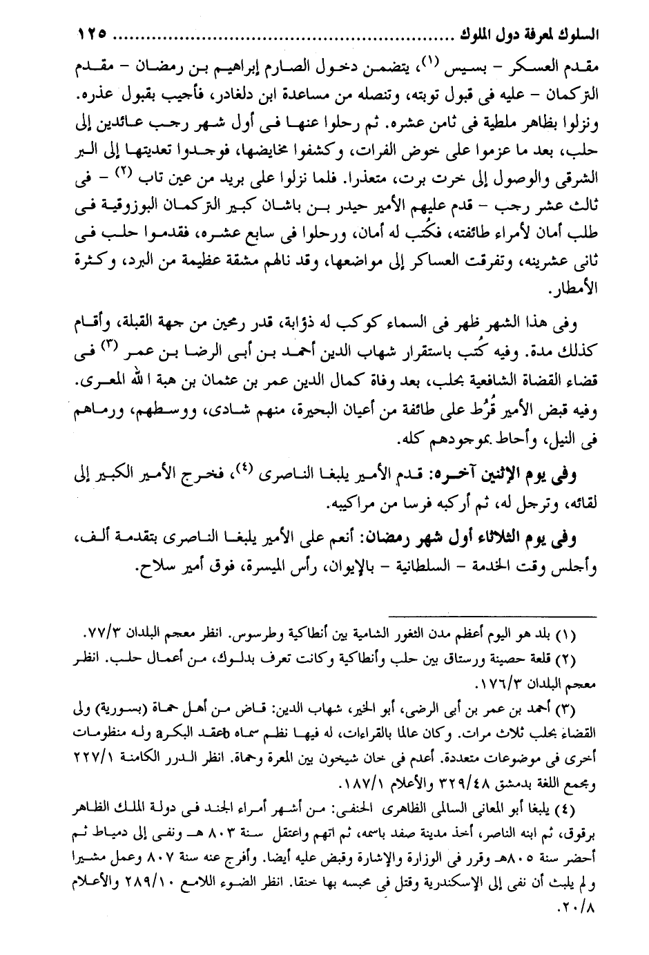 مقدم الْعَسْكَر - بسيس يتَضَمَّن دُخُول الصارم إِبْرَاهِيم بن رَمَضَان - مقدم التركمان - عَلَيْهِ فِي قبُول تَوْبَته وتنصله من مساعدة ابْن دلغادر فَأُجِيب بِقبُول عذره. ونزلوا بِظَاهِر ملطية فِي ثامن عشره. ثمَّ رحلوا عَنْهَا فِي أول شهر رَجَب عائدين إِلَى حلب بَعْدَمَا عزموا على خوض الْفُرَات وكشفوا مخايضها فوجدوا تعديتها إِلَى الْبر والوصول إِلَى خرت برت متعذراً. فَلَمَّا نزلُوا على بريد من عين تَابَ - فِي ثَالِث عشر رَجَب - قدم عَلَيْهِم الْأَمِير حيدر بن باشان كَبِير التركمان البوزوقية فِي طلب الْأمان لأمراء طائفته فَكتب لَهُ أَمَان ورحلوا فِي سَابِع عشره فقدموا حلب فِي ثَانِي عشرينه وَتَفَرَّقَتْ العساكر إِلَى موَاضعهَا وَقد نالهم مشقة عَظِيمَة من الْبرد وَكَثْرَة الأمطار. وَفِي هَذَا الشَّهْر ظهر فِي السَّمَاء كَوْكَب لَهُ ذؤابة قدر رُمْحَيْنِ من جِهَة الْقبْلَة وَأقَام كَذَلِك مُدَّة. وَفِيه كُتب باستقرار شهَاب الدّين أَحْمد بن أبي الرِّضَا بن عمر فِي قَضَاء الْقُضَاة الشَّافِعِيَّة بحلب بعد وَفَاة كَمَال الدّين عمر بن عُثْمَان بن هبة الله المعري. وَفِيه قبض الْأَمِير قرط على طَائِفَة من أَعْيَان الْبحيرَة مِنْهُم شادي ووسطهم وَرَمَاهُمْ فِي النّيل وأحاط. بموجودهم كُله. وَفِي يَوْم الْإِثْنَيْنِ آخِره: قدم الْأَمِير يلبغا الناصري فَخرج الْأَمِير الْكَبِير إِلَى لِقَائِه وترجل لَهُ ثمَّ أركبه فرسا من مراكيبه. وَفِي يَوْم الثُّلَاثَاء أول شهر رَمَضَان: أنعم على الْأَمِير يلبغا الناصري بتقدمة ألف وأجلس وَقت الْخدمَة - السُّلْطَانِيَّة - بالإيوان رَأس الميسرة فَوق أَمِير سلَاح.