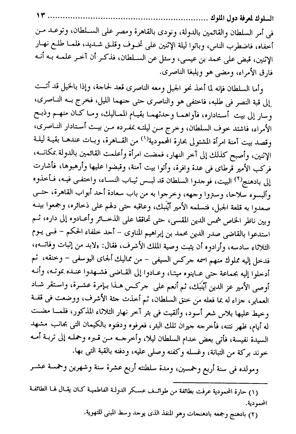 فِي أَمر السُّلْطَان والقائمين بالدولة وَنُودِيَ بِالْقَاهِرَةِ ومصر على السُّلْطَان وتوعد من أخفاه فاضطرب النَّاس وَبَاتُوا لَيْلَة الْإِثْنَيْنِ على تخوف وقلق شَدِيد فَلَمَّا طلع نَهَار الْإِثْنَيْنِ قبض على مُحَمَّد بن عِيسَى وَسُئِلَ عَن السُّلْطَان فَذكر أَن آخر علمه بِهِ أَنه فَارق الْأُمَرَاء وَمضى هُوَ ويلبغا الناصرى. وَأما السُّلْطَان فَإِنَّهُ لما أَخذ نَحْو الْجَبَل وَمَعَهُ الناصري قعد لحَاجَة وَإِذا بِالْخَيْلِ قد أَتَت إِلَى قبَّة النَّصْر فِي طلبه فاختفي هُوَ والناصرى حَتَّى جنهما اللَّيْل فَخرج بِهِ الناصري وَسَار إِلَى بَيت أستاداره فآواهما وحدثهما بِقِيَام المماليك وَمَا كَانَ مِنْهُم وَذبح الْأُمَرَاء فَاشْتَدَّ خوف السُّلْطَان وَخرج من ليلته. بمفرده من بَيت أستادار الناصري وَقصد بَيت آمِنَة امْرَأَة المشتولى بحارة المحمودية من الْقَاهِرَة وَبَات عِنْدهَا بَقِيَّة لَيْلَة الْإِثْنَيْنِ وَأصْبح كَذَلِك إِلَى أخر النَّهَار فمضت امْرَأَة وأعلمت القائمين بالدولة بمكانه فَركب الْأَمِير قرطاى فِي عدَّة وافرة وَأتوا بَيت أَمَنَة وقبضوا عَلَيْهَا وأرهبوها فَأَشَارَتْ إِلَى بادهنج الْبَيْت فوجدوا السُّلْطَان قد لبس ثِيَاب النِّسَاء واختفي فِيهِ فَأَخَذُوهُ وألبسوه سِلَاحا وستروا وَجهه وَخَرجُوا بِهِ من بَاب سَعَادَة أحد أَبْوَاب الْقَاهِرَة حَتَّى صعدوا بِهِ قلعة الْجَبَل فتسلمه الْأَمِير أينبك وعاقبه حَتَّى دلهم على ذخائره وجمعوا بَينه وَبَين نَاظر الْخَاص شمس الدّين المقسى حَتَّى تحاققا على الذَّخَائِر وأعادوه إِلَى دَاره ثمَّ استدعوا بِالْقَاضِي صدر الدّين مُحَمَّد بن إِبْرَاهِيم المناوى - أحد خلفاء الحكم - فِي يَوْم الثُّلَاثَاء سادسه وأرادوه أَن يثبت وَصِيَّة الْملك الْأَشْرَف فَقَالَ: لابد من إِثْبَات وَفَاته فَدخل إِلَيْهِ مَمْلُوك مِنْهُم اسْمه جركس السيفي - من مماليك ألجاى اليوسفي - وخنقه ثمَّ أدخلُوا إِلَيْهِ جمَاعَة حَتَّى عاينوه مَيتا وعادوا إِلَى القاضى فَشَهِدُوا عِنْده. بِمَوْتِهِ وَأَنه أوصى الْأَمِير عز الدّين أينبك ثمَّ أنعم على جركس هَذَا بإمرة عشرَة وَاسْتقر شاد العماير جَزَاء لَهُ. بِمَا فعله من خنق السُّلْطَان ثمَّ أخذت جثة الْأَشْرَف وَوضعت فِي قفة وخيط عَلَيْهَا بلاس شعر أسود وألقيت فِي بِئْر آخر نَهَار الثُّلَاثَاء الْمَذْكُور فَلَمَّا مَضَت لَهُ أَيَّام ظهر نَتنه فَأخْرجهُ جيران تِلْكَ الْبِئْر فعرفوه ودفنوه بالكيمان الَّتِي بِجَانِب مشْهد السيدة نفيسة فَأتى بعض خدام السُّلْطَان لَيْلًا وَأخرجه من قَبره وَحمله إِلَى تربة أمه خوند بركَة من التبانة وغسله وكفنه وَصلى عَلَيْهِ وَدَفنه بالقبة الَّتِي بهَا. ومولده فِي سنة أَربع وَخمسين وَمُدَّة سلطنته أَربع عشرَة سنة وشهرين وَخَمْسَة عشر
