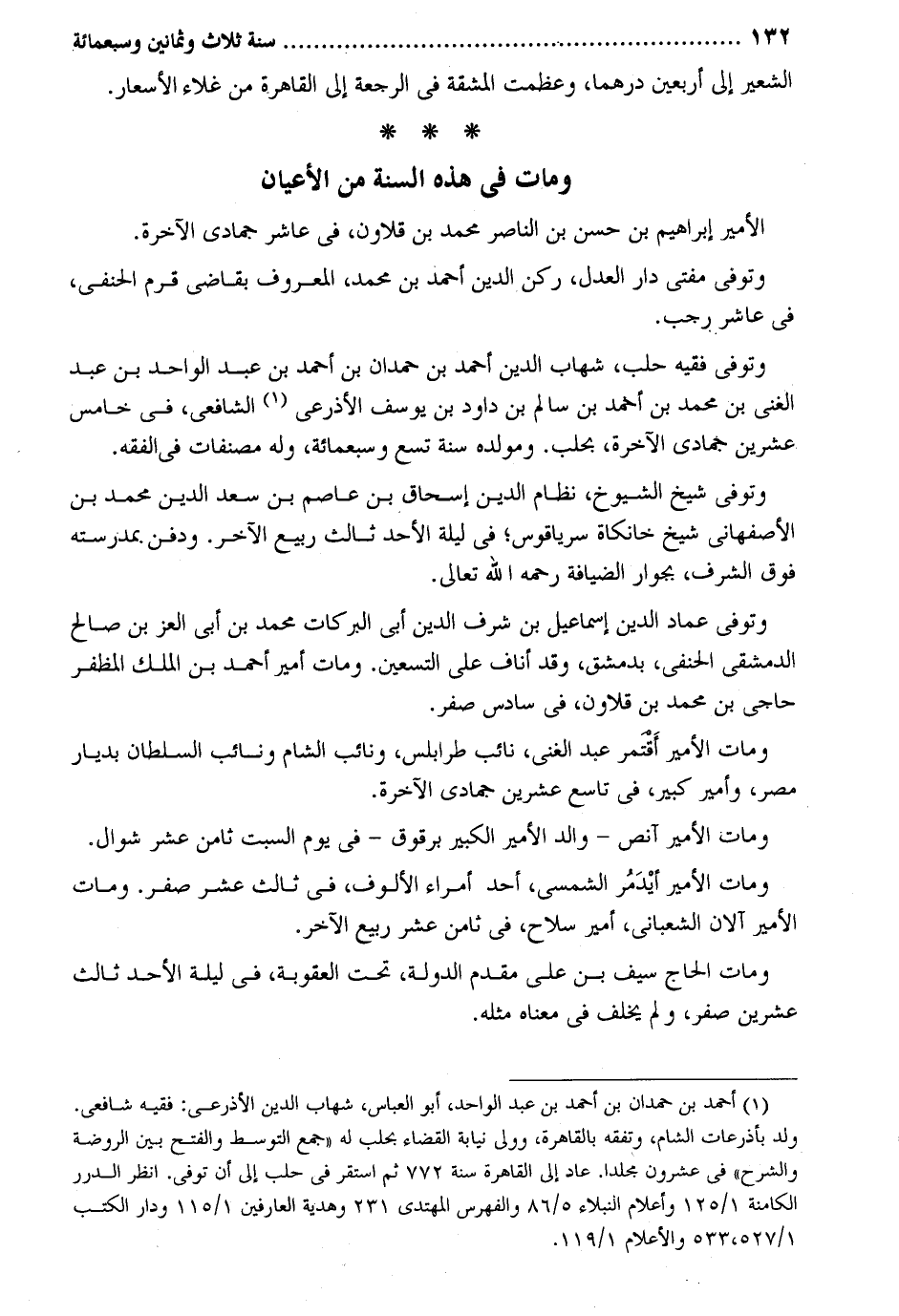 الشّعير إِلَى أَرْبَعِينَ درهما وعظمت الْمَشَقَّة فِي الرّجْعَة إِلَى الْقَاهِرَة من غلاء الأسعار. وَمَات فِي هَذِه السّنة من الْأَعْيَان الْأَمِير إِبْرَاهِيم بن حسن بن النَّاصِر مُحَمَّد بن قلاون فِي عَاشر جُمَادَى الْآخِرَة. وَتُوفِّي مفتى دَار الْعدْل ركن الدّين أَحْمد بن مُحَمَّد الْمَعْرُوف بقاضي قرم الْحَنَفِيّ فِي عَاشر رَجَب. وَتُوفِّي فَقِيه حلب شهَاب الدّين أَحْمد بن حمدَان بن أَحْمد بن عبد الْوَاحِد بن عبد الْغَنِيّ بن مُحَمَّد بن أَحْمد بن سَالم بن دَاوُد بن يُوسُف الْأَذْرَعِيّ الشَّافِعِي فِي خَامِس عشْرين جُمَادَى الْآخِرَة بحلب. ومولده سنة تسع وَسَبْعمائة وَله مصنفات فِي الْفِقْه. وَتُوفِّي شيخ الشُّيُوخ نظام الدّين إِسْحَاق بن عَاصِم بن سعد الدّين مُحَمَّد بن الْأَصْفَهَانِي شيخ خانكاة سرياقوس فِي لَيْلَة الْأَحَد ثَالِث ربيع الآخر. وَدفن. بمدرسته فَوق الشّرف بجوار الضِّيَافَة رَحمَه الله تَعَالَى. وَتُوفِّي عماد الدّين إِسْمَاعِيل بن شرف الدّين أبي البركات مُحَمَّد بن أبي الْعِزّ بن صَالح الدِّمَشْقِي الْحَنَفِيّ بِدِمَشْق وَقد أناف على التَسعين. وَمَات أَمِير أَحْمد بن الْملك المظفر حاجي بن مُحَمَّد بن قلاون فِي سادس صفر. وَمَات الْأَمِير أَقتمر عبد الْغَنِيّ نَائِب طرابلس ونائب الشَّام ونائب السُّلْطَان بديار مصر وأمير كَبِير فِي تَاسِع عشْرين جُمَادَى الْآخِرَة. وَمَات الْأَمِير آنص - وَالِد الْأَمِير الْكَبِير برقوق - فِي يَوْم السبت ثامن عشر شَوَّال. وَمَات الْأَمِير أيدمُر الشمسي أحد أُمَرَاء الألوف فِي ثَالِث عشر صفر. وَمَات الْأَمِير آلان الشَّعْبَانِي أَمِير سلَاح فِي ثامن عشر ربيع الآخر. وَمَات الْحَاج سيف بن عَليّ مقدم الدولة تَحت الْعقُوبَة فِي لَيْلَة الْأَحَد ثَالِث عشْرين صفر وَلم يخلف فِي مَعْنَاهُ مثله.