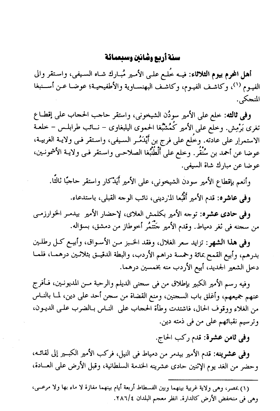 سنه أَربع وَثَمَانِينَ وَسَبْعمائة أهل الْمحرم بِيَوْم الثُّلَاثَاء: فِيهِ خُلع على الْأَمِير مُبارك شاه السيفي وَاسْتقر وَالِي الفيوم وَكَاشف الفيوم وَكَاشف البهنساوية والأطفيحية عوضا عَن أسنبغا المنجكي. وَفِي ثالثه: خلع على الْأَمِير سودُن الشيخوني وَاسْتقر حَاجِب الْحجاب على إقطاع تغري بَرمش. وخلع على الْأَمِير كُمُشبغا الْحَمَوِيّ اليلبغاوي - نَائِب طرابلس - خلعة الِاسْتِمْرَار على عَادَته. وخُلع على فرج بن أَيدَمُر السيفي وَاسْتقر فِي ولَايَة الغربية عوضا عَن أَحْمد بن سُنقُر. وخلع على أَلطُنبُغا الصلاحي وَاسْتقر فِي ولَايَة الأشمونين عوضا عَن مبارك شَاة السيفي. وأنعم بإقطاع الْأَمِير سودن الشيخوني على الْأَمِير أيدكار وَاسْتقر حاجبًا ثَالِثا. وَفِي عاشره: قدم الْأَمِير أَقبُعا المارديني نَائِب الوجهالقبلي باستدعاء. وَفِي حادي عشره: توجه الْأَمِير بكلمش العلاي لإحضار الْأَمِير بيدمر الْخَوَارِزْمِيّ من سجنه فِي ثغر دمياط. وَقدم الْأَمِير جَتتمُر أَخُو طاز من دمشق بسؤاله. وَفِي هَذَا الشَّهْر: تزايد سعر الغلال وفقد الْخبز من الْأَسْوَاق وأبيع كل رطلين بدرهم وأبيع الْقَمْح. بِمِائَة وَخَمْسَة دَرَاهِم الأردب والبطة الدَّقِيق بِثَلَاثِينَ درهما فَلَمَّا دخل الشّعير الْجَدِيد وَفِيه رسم الْأَمِير الْكَبِير بِإِطْلَاق من فِي سجني الديلم والرحبة من المديونين فأفرج عَنْهُم جيعهم وأغلق بَاب السجنين وَمنع الْقُضَاة من سجن أحد على دين لما بِالنَّاسِ من الغلاء ووقوف الْحَال فاشتدت وَطْأَة الْحجاب على النَّاس بِالضَّرْبِ على الدُّيُون وترسيم نقبائهم على من فِي ذمَّته دين. وَفِي ثامن عشرَة: قدم ركب الْحَاج. وَفِي عشرينه: قدم الْأَمِير بيدمر من دمياط فِي النّيل فَركب الْأَمِير الْكَبِير إِلَى لِقَائِه وَحضر من الْغَد يَوْم الْإِثْنَيْنِ حادي عشرينه الْخدمَة السُّلْطَانِيَّة وَقبل الأَرْض على الْعَادة