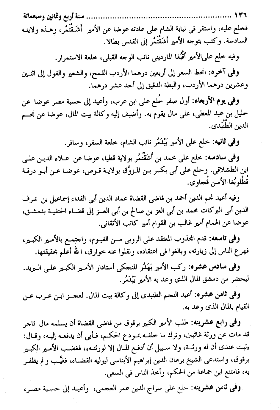 فَخلع عَلَيْهِ وَاسْتقر فِي نِيَابَة الشَّام على عَادَته عوضا عَن الْأَمِير أشَقتمُر وَهَذِه ولَايَته السَّادِسَة. وَكتب بتوجه الْأَمِير أَشَقتمر إِلَى الْقُدس بطالا. وَفِيه خلع على الْأَمِير أقبغا المارديني نَائِب الْوَجْه القبلي خلعة الِاسْتِمْرَار. وَفِي آخِره: انحط السّعر إِلَى أَرْبَعِينَ درهما الأردب الْقَمْح وَالشعِير والفول إِلَى اثْنَيْنِ وَعشْرين درهما الأردب والبطة الدَّقِيق إِلَى أحد عشر درهما. وَفِي يَوْم الْأَرْبَعَاء: أول صفر خُلع على ابْن عرب وأعيد إِلَى حسبَة مصر عوضا عَن خَلِيل بن عبد الْمُعْطِي على مَال يقوم بِهِ. وأضيف إِلَيْهِ وكَالَة بَيت المَال عوضا عَن نجم الدّين الطنبَدي. وَفِي سادسه: خلع على مُحَمَّد بن أَشَقتمُر بِولَايَة قطيا عوضا عَن عَلَاء الدّين على ابْن الطشلاقي. وخلع عَليّ أبي بكر بن المزوَّق بِولَايَة قرص عوضا عَن أَبُو درقة قُطلوبُغا الأسن قُجاوي. وَفِيه أُعِيد نجم الدّين أَحْمد بن قَاضِي الْقُضَاة عماد الدّين أبي الْفِدَاء إِسْمَاعِيل بن شرف الدّين أبي البركات مُحَمَّد بن أبي الْعِزّ بن صَالح بن أبي الْعِزّ إِلَى قَضَاء الْحَنَفِيَّة بِدِمَشْق عوضا عَن الْهمام أَمِير غَالب بن القوام أَمِير كَاتب الْأَتْقَانِيّ. وَفِي تاسعه: قدم المجذوب المعتقد على الروبي من الفيوم وَاجْتمعَ بالأمير الْكَبِير فهرع النَّاس إِلَى زيارته وبالغوا فِي اعْتِقَاده ونقلوا عَنهُ خوارق الله أعلم بحقيقتها. وَفِي سادس عشره: ركب الْأَمِير بَهَدُر المنجكي أستادار الْأَمِير الْكَبِير على الْبَرِيد. ليحضر من دمشق المَال الَّذِي وعد بِهِ الْأَمِير بَيدَمُر. وَفِي ثامن عشره: أُعِيد النَّجْم الطنبدي إِلَى وكَالَة بَيت المَال. لعجز ابْن عرب عَن الْقيام بِالْمَالِ الَّذِي وعد بِهِ. وَفِي رَابِع عشرينه: طلب الْأَمِير الْكَبِير برقوق من قَاضِي الْقُضَاة أَن يُسلمهُ مَال تَاجر قد مَاتَ عَن وَرَثَة غائبين وَترك مَا خَلفه. بمودع الحكم فَأبى أَن يَدْفَعهُ إِلَيْهِ وَقَالَ: ثَبت عِنْدِي أَن لَهُ وَرَثَة وَلَا سَبِيل أَن أدفَع المَال إِلَّا لوَرثَته فَغَضب الْأَمِير الْكَبِير برقوق واستدعى الشَّيْخ برهَان الدّين إِبْرَاهِيم الأبناسي ليوليه الْقَضَاء فغيَّب وَلم يظفر بِهِ فَامْتنعَ ابْن جمَاعَة من الحكم وَأخذ النَّاس فِي السَّعْي. وَفِي ثامن عشرينه: خلع على سراج الدّين عمر العجمي وأعيد إِلَى حبسة مصر
