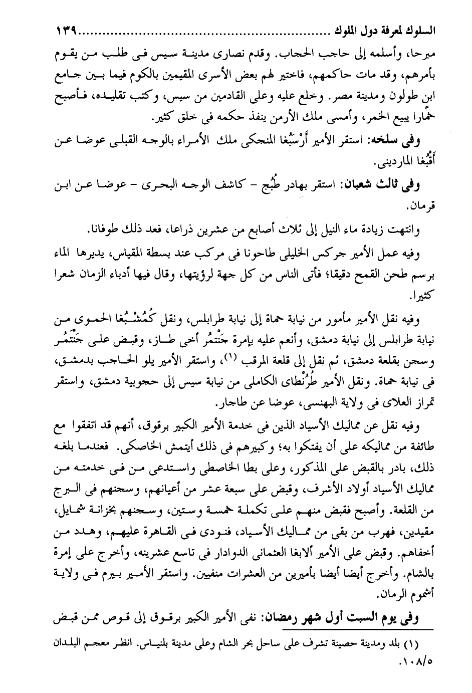 مبرحاً وأسلمه إِلَى حَاجِب الْحجاب. وَقدم نَصَارَى مَدِينَة سيس فِي طلب من يقوم بأمرهم وَقد مَاتَ حاكمهم فاختير لَهُم بعض الأسرى المقيمين بالكوم فِيمَا بَين جَامع ابْن طولون ومدينة مصر. وخلع عَلَيْهِ وعَلى القادمين من سيس وَكتب تَقْلِيده فَأصْبح خماراً يَبِيع الْخمر وَأمسى ملك الأرمن ينفذ حكمه فِي خلق كثير. وَفِي سلخه: اسْتَقر الْأَمِير أرسبغا المنجكي ملك الْأُمَرَاء بِالْوَجْهِ القبلي عوضا عَن أقبغا المارديني. وانتهت زِيَادَة مَاء النّيل إِلَى ثَلَاث أَصَابِع من عشْرين ذِرَاعا فعد ذَلِك طوفانا. وَفِيه عمل الْأَمِير جركس الخليلي طاحوناً فِي مركب عِنْد بسطة المقياس يديرها المَاء برسم طحن الْقَمْح دَقِيقًا فَأتى النَّاس من كل جِهَة لرؤيتها وَقَالَ فِيهَا أدباء الزَّمَان شعرًا كثيرا. وَفِيه نقل الْأَمِير مَأْمُور من نِيَابَة حماة إِلَى نِيَابَة طرابلس وَنقل كُمُشبُغا الْحَمَوِيّ من نِيَابَة طرابلس إِلَى نِيَابَة دمشق وأنعم عَلَيْهِ بإمرة جَنتمُر أخي طاز وَقبض على جَنتمُر وسجن بقلعة دمشق ثمَّ نقل إِلَى قلعة المرقب وَاسْتقر الْأَمِير يلو الْحَاجِب بِدِمَشْق فِي نِيَابَة حماة. وَنقل الْأَمِير طُرنطاي الكاملي من نِيَابَة سيس إِلَى حجوبية دمشق وَاسْتقر تمراز العلاي فِي ولَايَة البهنسي عوضا عَن طاجار. وَفِيه نقل عَن مماليك الأسياد الَّذين فِي خدمَة الْأَمِير الْكَبِير برقوق أَنهم قد اتَّفقُوا مَعَ طَائِفَة من مماليكه على أَن يفتَكوا بِهِ وَكَبِيرهمْ فِي ذَلِك أيتمش الخاصكي. فعندما بلغه ذَلِك بَادر بِالْقَبْضِ على الْمَذْكُور وعَلى بطا الخاصطي واستدعى من فِي خدمته من مماليك الأسياد أَوْلَاد الْأَشْرَف وَقبض على سَبْعَة عشر من أعيانهم وسجنهم فِي البرج من القلعة. وَأصْبح فَقبض مِنْهُم على تَكْمِلَة خَمْسَة وَسِتِّينَ وسجنهم بخزانة شمايل مقيدين فهرب من بَقِي من مماليك الأسياد فَنُوديَ فِي الْقَاهِرَة عَلَيْهِم وهدد من أخفاهم. وَقبض على الْأَمِير ألابغا العثماني الدوادار فِي تَاسع عشرينه وَأخرج على إمرة بِالشَّام. وَأخرج أَيْضا أَيْضا بأميرين من العشرات منفيين. وَاسْتقر الْأَمِير بيرم فِي ولَايَة أشموم الرُّمَّان. وَفِي يَوْم السبت أول شهر رَمَضَان: نفي الْأَمِير الْكَبِير برقوق إِلَى قوص مِمَّن قبض