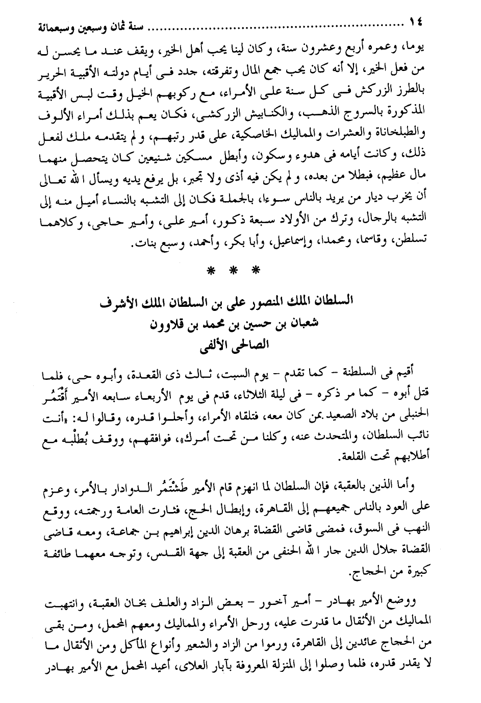 يَوْمًا وعمره أَربع وَعِشْرُونَ سنة وَكَانَ لينًا يحب أهل الْخَيْر وَيقف عِنْد مَا يحسن لَهُ من فعل الْخَيْر إِلَّا أَنه كَانَ يحب جمع المَال وتفرقته جدد فِي أَيَّام دولته الأقبية الْحَرِير بالطرز الزركش فِي كل سنة على الْأُمَرَاء مَعَ ركوبهم الْخَيل وَقت لبس الأقبية الْمَذْكُورَة بالسروج الذَّهَب والكنابيش الزركشى فَكَانَ يعم بذلك أُمَرَاء الألوف والطبلخاناة والعشرات والمماليك الخاصكية على قدر رتبهم وَلم يتقدمه ملك لفعل ذَلِك وَكَانَت أَيَّامه فِي هدوء وَسُكُون وأبطل مِسْكين شنيعين كَانَ يتَحَصَّل مِنْهُمَا مَال عَظِيم فبطلا من بعده وَلم يكن فِيهِ أَذَى وَلَا تجبر بل يرفع يَدَيْهِ وَيسْأل الله تعإلى أَن يخرب ديار من يُرِيد بِالنَّاسِ سوءا بِالْجُمْلَةِ فَكَانَ إِلَى التَّشَبُّه بِالنسَاء أميل مِنْهُ إِلَى التَّشَبُّه بِالرِّجَالِ وَترك من الْأَوْلَاد سَبْعَة ذُكُور أَمِير عَليّ وأمير حاجى وَكِلَاهُمَا تسلطن وَقَاسما ومحمدا وَإِسْمَاعِيل وَأَبا بكر وَأحمد وَسبع بَنَات. السُّلْطَان الْملك الْمَنْصُور عَليّ السُّلْطَان الْملك الْمَنْصُور عَليّ بن السُّلْطَان الْملك الْأَشْرَف شعْبَان بن حُسَيْن بن مُحَمَّد بن قلاوون الصالحى الألفي. أقيم فِي السلطنة - كَمَا تقدم - يَوْم السبت ثَالِث ذِي الْقعدَة وَأَبوهُ حَيّ فَلَمَّا قتل أَبوهُ - كَمَا مر ذكره - فِي لَيْلَة الثُّلَاثَاء قدم فِي يَوْم الْأَرْبَعَاء سابعه الْأَمِير آقتمر الْحَنْبَلِيّ من بِلَاد الصَّعِيد. بِمن كَانَ مَعَه فَتَلقاهُ الْأُمَرَاء وأجلوا قدره وَقَالُوا لَهُ: أَنْت نَائِب السُّلْطَان والمتحدث عَنهُ وكلنَا من تَحت أَمرك فوافقهم ووقف بِطَلَبِهِ مَعَ أطلابهم تَحت القلعة. وَأما الَّذين بِالْعقبَةِ فَإِن السُّلْطَان لما انهزم قَامَ الْأَمِير طشتمر الدوادار بِالْأَمر وعزم على الْعود بِالنَّاسِ جَمِيعهم إِلَى الْقَاهِرَة وَإِبْطَال الْحَج فثارت الْعَامَّة ورجمته وَوَقع النهب فِي السُّوق فَمضى قاضى الْقُضَاة برهَان الدّين إِبْرَاهِيم بن جمَاعَة وَمَعَهُ قاضى الْقُضَاة جلال الدّين جَار الله الْحَنَفِيّ من الْعقبَة إِلَى جِهَة الْقُدس وَتوجه مَعَهُمَا طَائِفَة كَبِيرَة من الْحجَّاج. وَوضع الْأَمِير بهادر - أَمِير أخور - بعض الزَّاد والعلف بخان الْعقبَة وانتهبت المماليك من الأثقال مَا قدرت عَلَيْهِ ورحل الْأُمَرَاء والمماليك وَمَعَهُمْ الْمحمل وَمن بقى من الْحجَّاج عائدين إِلَى الْقَاهِرَة ورموا من الزَّاد وَالشعِير وأنواع المأكل وَمن الأثقال مَا لَا يقدر قدره فَلَمَّا وصلوا إِلَى الْمنزلَة الْمَعْرُوفَة بأبار العلاى أُعِيد الْمحمل مَعَ الْأَمِير بهادر