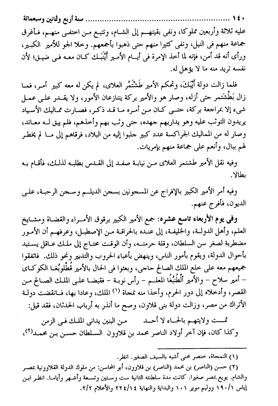 عَلَيْهِ ثَلَاثَة وَأَرْبَعين مَمْلُوكا وَنفي بَقِيَّتهمْ إِلَى الشَّام وتتبع من اختفي مِنْهُم فأغرق جمَاعَة مِنْهُم فِي النّيل وَنفي كثيرا مِنْهُم حَتَّى ذَهَبُوا بأجمعهم. وخلا الجو للأمير الْكَبِير وَرَأى أَنه قد أَمن فَإِنَّهُ لما أَخذ الإمرة فِي أَيَّام الْأَمِير أَينَبَك كَانَ مَعَه فِي ضيق لِأَن نَفسه تُرِيدُ مِنْهُ مَا لَا يؤهل لَهُ. فَلَمَّا زَالَت دولة أينبكَ وتحكم الْأَمِير طَشتَمُر العلاي لم يكن لَهُ مَعَه كَبِير أَمر فَمَا زَالَ بَطشَتمر حَتَّى أزله وَصَارَ هُوَ والأمير بركَة يتنازعان الْأُمُور وَلَا يقدر على عمل شَيْء إِلَّا. بمراجعة بركَة حَتَّى كَانَ من أمره مَا قد ذكر فَصَارَت مماليك الأسياد يُرِيدُونَ التوثب عَلَيْهِ وَهُوَ يداريهم جهده حَتَّى وثب بهم وَأَخذهم فَم يبْق لَهُ معاند وَصَارَ لَهُ من المماليك الجراكسة عدد كَبِير جلبوا إِلَيْهِ من الْبِلَاد فرقاهم إِلَى مَا لم يخْطر لَهُم ببال وأنعم على جمَاعَة مِنْهُم بإمريات. وَفِيه نقل الْأَمِير طشتمر العلاي من نِيَابَة صفد إِلَى الْقُدس بِطَلَبِهِ لذَلِك فَأَقَامَ بِهِ بطالا. وَفِيه أَمر الْأَمِير الْكَبِير بالإفراج عَن المسجونين بسجن الديلم وسجن الرحبة على الدُّيُون فأفرج عَنْهُم.