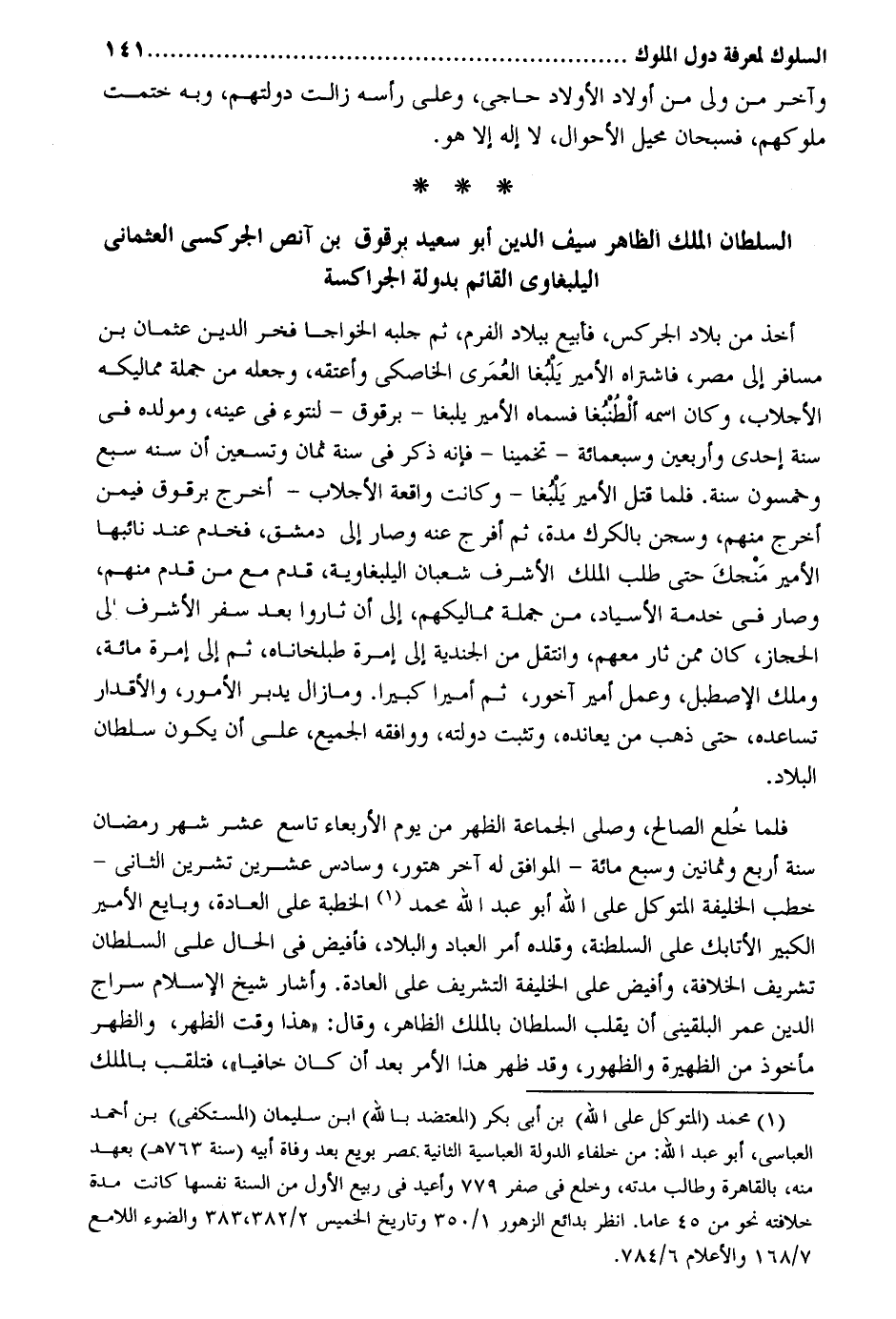وَآخر من ولي من أَوْلَاد الْأَوْلَاد حاجي وعَلى رَأسه زَالَت دولتهم وَبِه ختمت مُلُوكهمْ فسبحان محيل الْأَحْوَال لَا إِلَه إِلَّا هُوَ. السُّلْطَان سيف الدّين أَبُو سعيد السُّلْطَان الْملك الظَّاهِر سيف الدّين أَبُو سعيد برقوق بن آنص الجركسي العثماني اليلبغاوي الْقَائِم بدولة الجراكسة أَخذ من بِلَاد الجركس فأبيع بِبِلَاد الفرم ثمَّ جلبه الخواجا فَخر الدّين عُثْمَان بن مُسَافر إِلَى مصر فَاشْتَرَاهُ الْأَمِير يلبُغا العُمَري الخاصكي وَأعْتقهُ وَجعله من جملَة مماليكه الأجلاب وَكَانَ اسْمه ألطنبغا فَسَماهُ الْأَمِير يلبغا - برقوق - لنتوء فِي عينه ومولده فِي سنة إِحْدَى وَأَرْبَعين وَسَبْعمائة - تخمينا - فَإِنَّهُ ذكر فِي سنة ثَمَان وَتِسْعين أَن سنه سبع وَخَمْسُونَ سنة. فَلَمَّا قتل الْأَمِير يلبغا - وَكَانَت وَاقعَة الأجلاب - أخرج برقوق فِيمَن أخرج مِنْهُم وسجن بالكرك مُدَّة ثمَّ أفرج عَنهُ وَصَارَ إِلَى دمشق فخدم عِنْد نائبها الْأَمِير مَنجكَ حَتَّى طلب الْملك الْأَشْرَف شعْبَان اليلبغاوية قدم مَعَ من قدم مِنْهُم وَصَارَ فِي خدمَة الأسياد من جملَة مماليكهم إِلَى أَن ثَارُوا بعد سفر الْأَشْرَف إِلَى الْحجاز كَانَ مِمَّن ثار مَعَهم وانتقل من الجندية إِلَى إمرة طبلخاناه ثمَّ إِلَى إمرة مائَة وَملك الإصطبل وَعمل أَمِير آخور ثمَّ أَمِيرا كَبِيرا. ومازال يدبر الْأُمُور والأقدار تساعده حَتَّى ذهب من يعانده وَتثبت دولته وَوَافَقَهُ الْجَمِيع على أَن يكون سُلْطَان الْبِلَاد. فَلَمَّا خُلع الصَّالح وَصلى الْجَمَاعَة الظّهْر من يَوْم الْأَرْبَعَاء تَاسِع عشر شهر رَمَضَان سنة أَربع وَثَمَانِينَ وَسبع مائَة - الْمُوَافق لَهُ آخر هتور وسادس عشْرين تشرين الثَّانِي - خطب الْخَلِيفَة المتَوَكل على الله أَبُو عبد الله مُحَمَّد الْخطْبَة على الْعَادة وَبَايع الْأَمِير الْكَبِير الأتابك على السلطنة وقلده أَمر الْعباد والبلاد فأفيض فِي الْحَال على السُّلْطَان تشريف الْخلَافَة وأفيض على الْخَلِيفَة التشريف على الْعَادة. وَأَشَارَ شيخ الْإِسْلَام سراج الدّين عمر البُلْقِينِيّ أَن يقلب السُّلْطَان بِالْملكِ الظَّاهِر وَقَالَ: هَذَا وَقت الظّهْر وَالظّهْر مَأْخُوذ من الظهيرة والظهور وَقد ظهر هَذَا الْأَمر بعد أَن كَانَ خافيا فتلقب بِالْملكِ