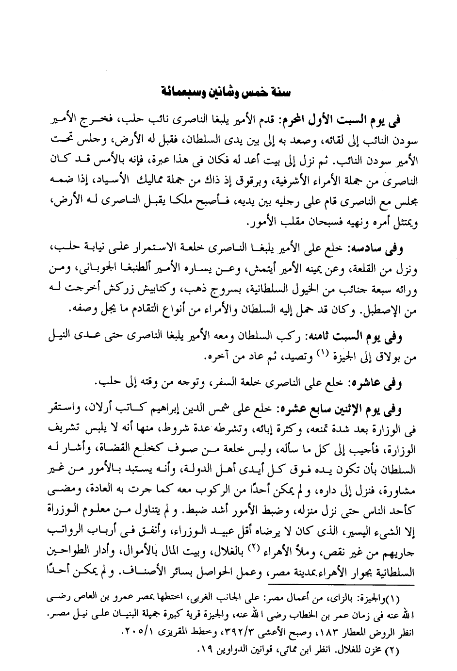سنة خمس وَثَمَانِينَ وَسَبْعمائة فِي يَوْم السبت الأول الْمحرم: قدم الْأَمِير يلبغا الناصري نَائِب حلب فَخرج الْأَمِير سودان النَّائِب إِلَى لِقَائِه وَصعد بِهِ إِلَى بَين يَدي السُّلْطَان فَقبل لَهُ الأَرْض وَجلسَ تَحت الْأَمِير سودن النَّائِب. ثمَّ نزل إِلَى بَيت أعد لَهُ فَكَانَ فِي هَذَا عِبْرَة فَإِنَّهُ بلأمس قد كَانَ الناصري من جملَة الْأُمَرَاء الأشرفية وبرقوق إِذْ ذَاك من جملَة مماليك الأسياد إِذا ضمه مجْلِس مَعَ الناصري قَامَ على رجلَيْهِ بَين يَدَيْهِ فَأصْبح ملكا يقبل الناصري لَهُ الأَرْض أمره وَنَهْيه فسبحان مُقَلِّب الْأُمُور. وقِي سادسه: خلع على الْأَمِير يلبغا الناصري خلعة الِاسْتِمْرَار على نِيَابَة حلب وَنزل من القلعة وَعَن يَمِينه الْأَمِير أيتمش وَعَن يسَاره الْأَمِير ألطنبغا الجوباني وَمن وَرَاءه سَبْعَة جنائب من الْخُيُول السُّلْطَانِيَّة بسروج ذهب وكنابيش زركش أخرجت لَهُ من الإصطبل. وَكَانَ قد حمل إِلَيْهِ السُّلْطَان والأمراء من أَنْوَاع التقادم مَا يجل وَصفه. وَفِي يَوْم السبت ثامنه: ركب السُّلْطَان وَمَعَهُ الْأَمِير يلبغا الناصري حَتَّى عدى النّيل من بولاق إِلَى الجيزة وتصيد ثمَّ عَاد من آخِره. وَفِي عاشره: خلع على الناصري خلعة السّفر وَتوجه من وقته إِلَى حلب. وَفِي يَوْم الْإِثْنَيْنِ سَابِع عشره: خلع على شمس الدّين إِبْرَاهِيم كَاتب أرلان وَاسْتقر فِي الوزارة بغد سدة تَمنعهُ وَكَثْرَة إبائه وتشترط عدَّة شُرُوط مِنْهَا أَنه لَا يلبس تشريف الوزارة فَأُجِيب إِلَى كل مَا سَأَلَهُ وَلبس خلعة من صوف كخلع الْقُضَاة وَأَشَارَ لَهُ السُّلْطَان بِأَن تكون يَده فَوق كل أَيدي أهل الدولة وَأَنه يستبد بالأمور من غير مُشَاورَة فَنزل إِلَى دَاره وَلم يُمكن أحدا من الرّكُوب مَعَه كَمَا جرت بِهِ الْعَادة وَمضى النَّاس حَتَّى نزل منزله وَضبط الْأُمُور أَشد ضبط. وَلم يتَنَاوَل من مَعْلُوم الوزراة إِلَّا الشَّيْء الْيَسِير الَّذِي كَانَ لَا يرضاه أقل عبيد الوزراء وَأنْفق فِي أَرْبَاب الرَّوَاتِب جاريهم من غير نقص بالغلال وَبَيت المَال بالأموال وأدار الطواحين السُّلْطَانِيَّة بجوار الأهراء بِمَدِينَة مصر وَعمل الحواصل بِسَائِر الْأَصْنَاف. وَلم يُمكن أحدا