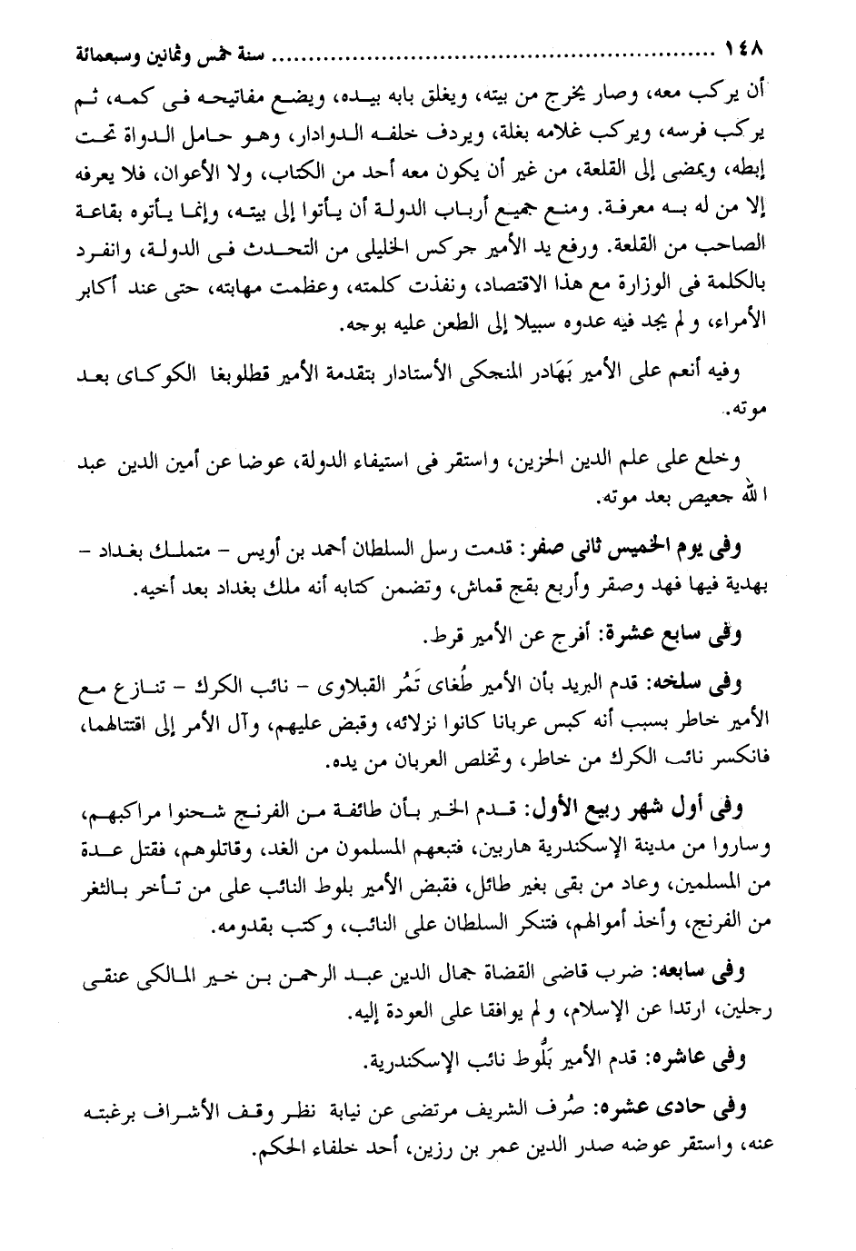أَن يركب مَعَه وَصَارَ يخرج من بَيته ويغلق بَابه بِيَدِهِ وَيَضَع مفاتيحه فِي كمه ثمَّ يركب فرسه ويركب غُلَامه بغلة ويردف خَلفه الدوادار وَهُوَ حَامِل الدواة تَحت إبطه ويمضى إِلَى القلعة من غير أَن يكون مَعَه أحد من الْكتاب وَلَا الأعوان فَلَا يعرفهُ إِلَّا من لَهُ بِهِ معرفَة. وَمنع جَمِيع أَرْبَاب الدولة أَن يَأْتُوا إِلَى بَيته وَإِنَّمَا يأتوه بقاعة الصاحب من القلعة. وَرفع يَد الْأَمِير جركس الخليلي من التحدث فِي الدولة وَانْفَرَدَ بِالْكَلِمَةِ فِي الوزارة مَعَ هَذَا الاقتصاد ونفذت كَلمته وعظمت مهابته حَتَّى عِنْد أكَابِر الْأُمَرَاء وَلم يجد فِيهِ عدوه سَبِيلا إِلَى الطعْن عَلَيْهِ بِوَجْه. وَفِيه أنعم على الْأَمِير بَهَادر المنجكي الأستادار بتقدمة الْأَمِير قطلوبغا الكوكاي بعد مَوته. وخلع على علم الدّين الحزين وَاسْتقر فِي اسْتِيفَاء الدولة عوضا عَن أَمِين الدّين عبد الله جعيص بعد مَوته. وَفِي يَوْم الْخَمِيس ثَانِي صفر: قدمت رسل السُّلْطَان أَحْمد بن أويس - متملك بَغْدَاد - بهدية فِيهَا فَهد وصقر وَأَرْبع بقج قماش وتضمن كِتَابه أَنه ملك بَغْدَاد بعد أَخِيه. وَفِي سَابِع عشرَة: أفرج عَن الْأَمِير قرط. وَفِي سلخه: قدم الْبَرِيد بِأَن الْأَمِير طُغاي تَمُر القبلاوي - نَائِب الكرك - تنَازع مَعَ الْأَمِير خاطر بِسَبَب أَنه كبس عربانا كَانُوا نزلائه وَقبض عَلَيْهِم وَآل الْأَمر إِلَى اقتتالهما فانكسر نَائِب الكرك من خاطر وتخلص العربان من يَده. وَفِي أول شهر ربيع الأول: قدم الْخَبَر بِأَن طَائِفَة من الفرنج شحنوا مراكبهم وَسَارُوا من مَدِينَة الْإسْكَنْدَريَّة هاربين فَتَبِعهُمْ الْمُسلمُونَ من الْغَد وقاتلوهم فَقتل عدَّة من الْمُسلمين وَعَاد من بَقِي بِغَيْر طائل فَقبض الْأَمِير بلوط النَّائِب على من تَأَخّر بالثغر من الفرنج وَأخذ أَمْوَالهم فتنكر السُّلْطَان على النَّائِب وَكتب بقدومه. وَفِي سابعه: ضرب قَاضِي الْقُضَاة جمال الدّين عبد الرَّحْمَن بن خير الْمَالِكِي عنقِي رجلَيْنِ ارتدا عَن الْإِسْلَام وَلم يوافقا على العودة إِلَيْهِ. وَفِي حادي عشره: صُرف الشريف مرتضى عَن نِيَابَة نظر وقف الْأَشْرَاف برغبته عَنهُ وَاسْتقر عوضه صدر الدّين عمر بن رزين أحد خلفاء الحكم.