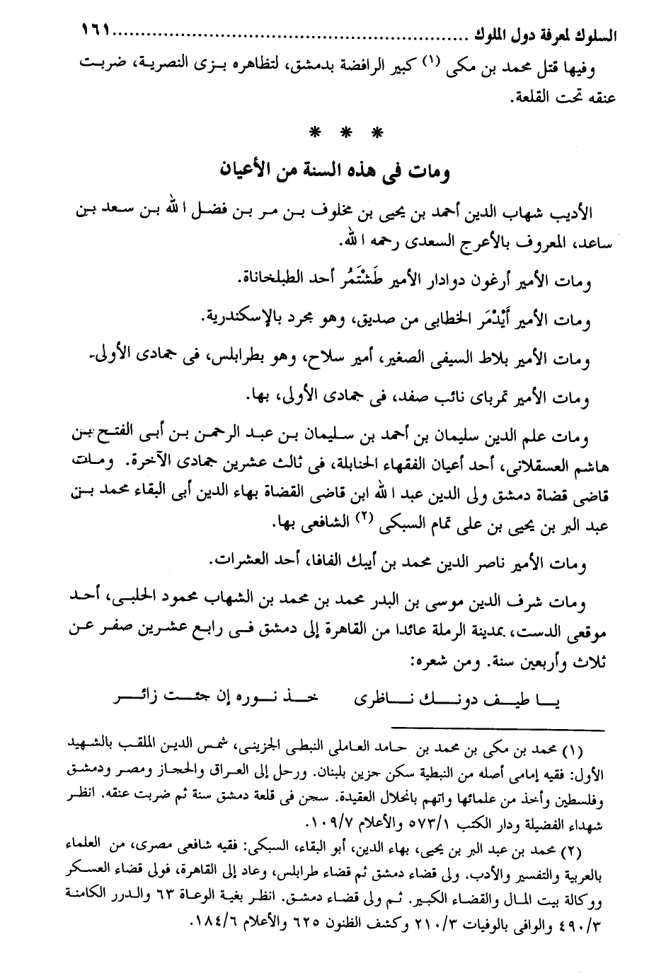 وفيهَا قتل مُحَمَّد بن مكي كَبِير الرافضة بِدِمَشْق لتظاهره بزِي النصرية ضربت عُنُقه تَحت القلعة. وَمَات فِي هَذِه السّنة من الْأَعْيَان الأديب شهَاب الدّين أَحْمد بن يحيى بن مخلوف بن مر بن فضل الله بن سعد بن ساعد الْمَعْرُوف بالأعرج السَّعْدِيّ رَحمَه الله. وَمَات الْأَمِير أرغون دوادار الْأَمِير طَشتَمُر أحد الطبلخاناة. وَمَات الْأَمِير أَيْدمَر الْخطابِيّ من صديق وَهُوَ مُجَرّد بالإسكندرية. وَمَات الْأَمِير بلاط السيفي الصَّغِير أَمِير سلَاح وَهُوَ بطرابلس فِي جُمَادَى الأولى. وَمَات الْأَمِير تمرباي نَائِب صفد فِي جُمَادَى الأولى بهَا. وَمَات علم الدّين سُلَيْمَان بن أَحْمد بن سُلَيْمَان بن عبد الرَّحْمَن بن أبي الْفَتْح بن هَاشم الْعَسْقَلَانِي أحد أَعْيَان الْفُقَهَاء الْحَنَابِلَة فِي ثَالِث عشْرين جُمَادَى الْآخِرَة. وَمَات قَاضِي قُضَاة دمشق ولى الدّين عبد الله ابْن قَاضِي الْقُضَاة بهاء الدّين أبي الْبَقَاء مُحَمَّد بن عبد الْبر بن يحيى بن على تَمام السُّبْكِيّ الشَّافِعِي بهَا. وَمَات الْأَمِير نَاصِر الدّين مُحَمَّد بن أيبك الفافا أحد العشرات. وَمَات شرف الدّين مُوسَى بن الْبَدْر مُحَمَّد بن مُحَمَّد بن الشهَاب مَحْمُود الْحلَبِي أحد موقعي الدست. بِمَدِينَة الرملة عَائِدًا من الْقَاهِرَة إِلَى دمشق فِي رَابِع عشْرين صفر عَن ثَلَاث وَأَرْبَعين سنة. وَمن شعره: طيف دُونك ناظري خُذ نوره إِن حئت زائر