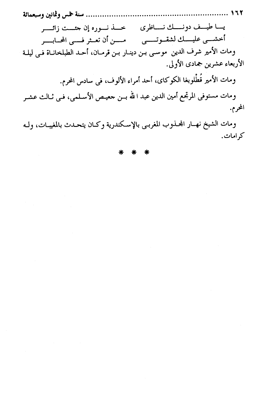 أخْشَى عَلَيْك لشقوتي من أَن تعثر فِي المحابر وَمَات الْأَمِير شرف الدّين مُوسَى بن دِينَار بن قرمان أحد الطبلخاناة فِي لَيْلَة الْأَرْبَعَاء عشْرين جُمَادَى الأولى. وَمَات الْأَمِير قُطْلوبغا الكوكاي أحد أُمَرَاء الألوف فِي سادس الْمحرم. وَمَات مُسْتَوْفِي المرتجع أَمِين الدّين عبد الله بن جعيص الْأَسْلَمِيّ فِي ثَالِث عشر الْمحرم. وَمَات الشَّيْخ نَهَار المجنوب المغربي بالإسكندرية وَكَانَ يتحدث بالمغيبات وَله كرامات.