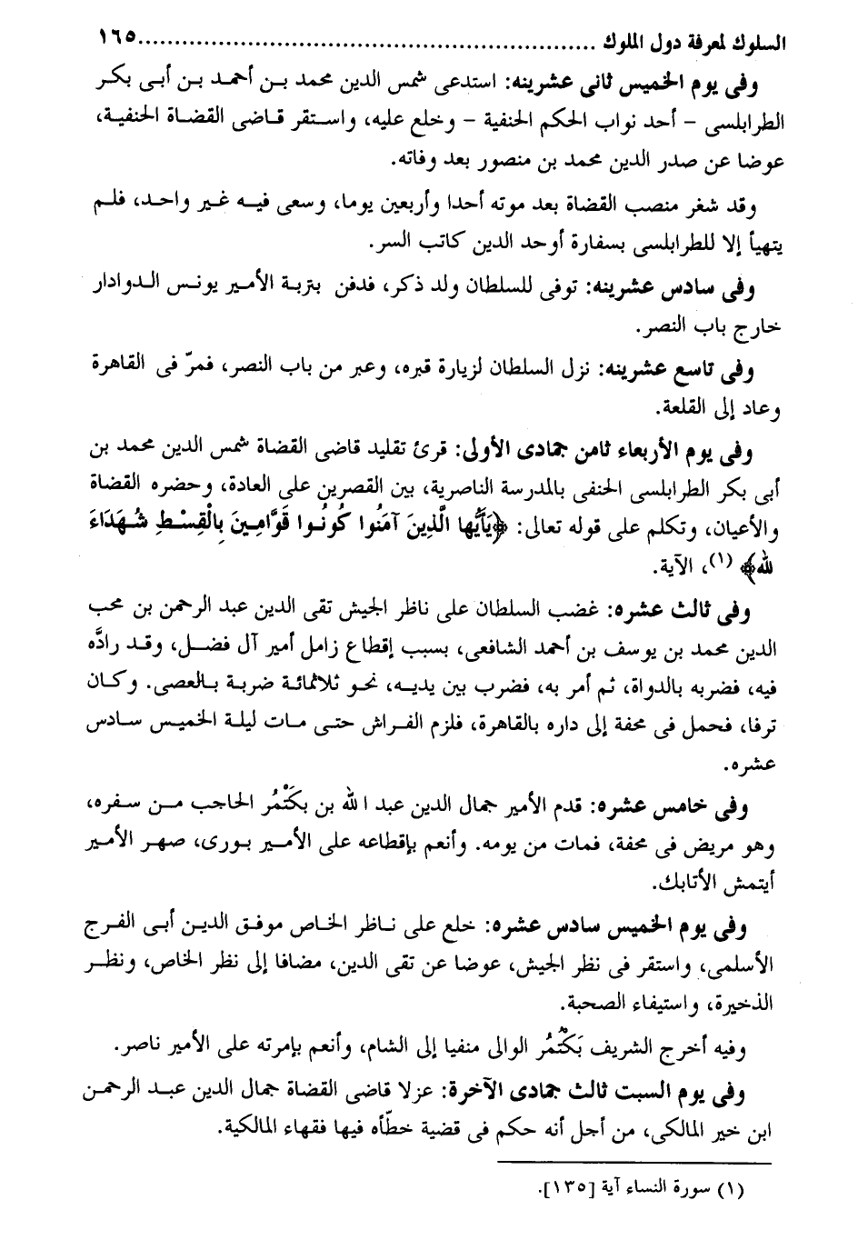 وَفِي يَوْم الْخَمِيس ثَانِي عشرينه: استدعى شمس الدّين مُحَمَّد بن أَحْمد بن أبي بكر الطرابلسي - أحد نواب الحكم الْحَنَفِيَّة - وخلع عَلَيْهِ وَاسْتقر قَاضِي الْقُضَاة الْحَنَفِيَّة عوضا عَن صدر الدّين مُحَمَّد بن مَنْصُور بعد وَفَاته. وَقد شغر منصب الْقُضَاة بعد مَوته أحدا وَأَرْبَعين يَوْمًا وسعى فِيهِ غير وَاحِد فَلم يتهيأ إِلَّا للطرابلسي بسفارة أوحد الدّين كَاتب السِّرّ. وَفِي سادس عشرينه: توفّي للسُّلْطَان ولد ذكر فَدفن بتربة الْأَمِير يُونُس الدوادار خَارج بَاب النَّصْر. وَفِي تَاسِع عشرينه: نزل السُّلْطَان لزيارة قَبره وَعبر من بَاب النَّصْر فمرّ فِي الْقَاهِرَة وَعَاد إِلَى القلعة. وَفِي يَوْم الْأَرْبَعَاء ثامن جُمَادَى الأولى: قرىء تَقْلِيد قَاضِي الْقُضَاة شمس الدّين مُحَمَّد بن أبي بكر الطرابلسي الْحَنَفِيّ بِالْمَدْرَسَةِ الناصرية بَين القصرين على الْعَادة وحضره الْقُضَاة والأعيان وَتكلم على قَوْله تَعَالَى: يأيها الَّذين آمنُوا كونُوا قوامين بِالْقِسْطِ شُهَدَاء لله وَفِي ثَالِث عشره: غضب السُّلْطَان على نَاظر الْجَيْش تَقي الدّين عبد الرَّحْمَن بن محب الدّين مُحَمَّد بن يُوسُف بن أَحْمد الشَّافِعِي بِسَبَب إقطاع زامل أَمِير آل فضل وَقد رادَّه فِيهِ فَضَربهُ بالدواة ثمَّ أَمر بِهِ فَضرب بَين يَدَيْهِ نَحْو ثَلَاثمِائَة ضَرْبَة بالعصى. وَكَانَ ترفا فَحمل فِي محفة إِلَى دَاره بِالْقَاهِرَةِ فَلَزِمَ الْفراش حَتَّى مَاتَ لَيْلَة الْخَمِيس سادس عشره. وَفِي خَامِس عشره: قدم الْأَمِير جمال الدّين عبد الله بن بكَتمُر الْحَاجِب من سَفَره وَهُوَ مَرِيض فِي محفة فَمَاتَ من يَوْمه. وأنعم بإقطاعه على الْأَمِير بورى صهر الْأَمِير أيتمش الأتابك. وَفِي يَوْم الْخَمِيس سادس عشره: خلع على نَاظر الْخَاص موفق الدّين أبي الْفرج الْأَسْلَمِيّ وَاسْتقر فِي نظر الْجَيْش عوضا عَن تَقِيّ الدّين مُضَافا إِلَى نظر الْخَاص وَنظر الذَّخِيرَة وَاسْتِيفَاء الصُّحْبَة. وَفِيه أخرج الشريف بَكتمُر الْوَالِي منفيا إِلَى الشَّام وأنعم بإمرته على الْأَمِير نَاصِر. وَفِي يَوْم السبت ثَالِث جُمَادَى الْآخِرَة: عزلا قَاضِي الْقُضَاة جمال الدّين عبد الرَّحْمَن ابْن خير الْمَالِكِي من أجل أَنه حكم فِي قَضِيَّة خطّأه فِيهَا فُقَهَاء الْمَالِكِيَّة.