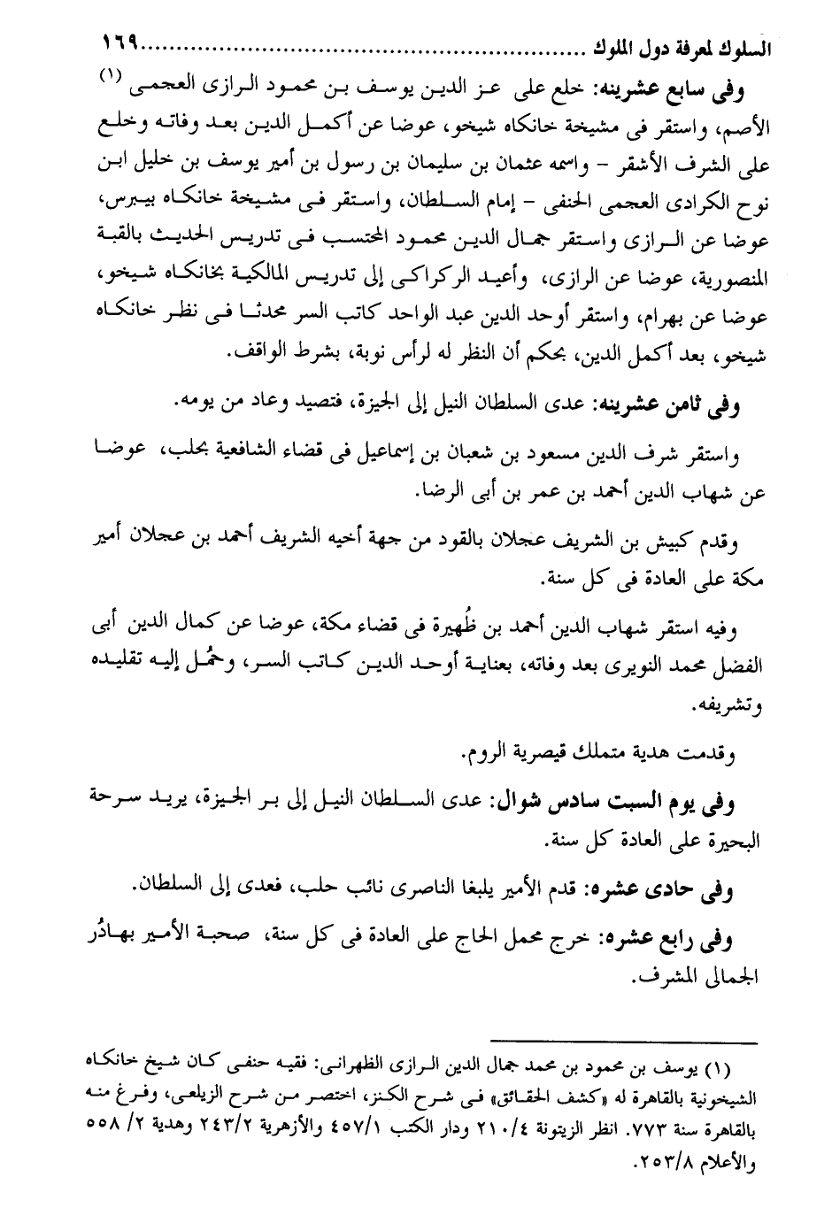 وَفِي سَابِع عشرينه: خلع على عز الدّين يُوسُف بن مَحْمُود الرَّازِيّ العجمي الْأَصَم وَاسْتقر فِي مشيخة خانكاه شيخو عوضا عَن أكمل الدّين بعد وَفَاته وخلع على الشّرف الْأَشْقَر - واسْمه عُثْمَان بن سُلَيْمَان بن رَسُول بن أَمِير يُوسُف بن خَلِيل ابْن نوح الكرادي العجمي الْحَنَفِيّ - إِمَام السُّلْطَان وَاسْتقر فِي مشيخة خانكاه بيبرس عوضا عَن الرَّازِيّ وَاسْتقر جمال الدّين مَحْمُود الْمُحْتَسب فِي تدريس الحَدِيث بالقبة المنصورية عوضا عَن الرَّازِيّ وأعيد الركراكي إِلَى تدريس الْمَالِكِيَّة بخانكاه شيخو عوضا عَن بهْرَام واستَقر أوحد الدّين عبد الْوَاحِد كَاتب السِّرّ مُحدثا فِي نظر خانكاه شيخو بعد أكمل الدّين بِحكم أَن النّظر لَهُ لرأس نوبَة بِشَرْط الْوَاقِف. وَفِي ثامن عشرينه: عدى السُّلْطَان النّيل إِلَى الجيزة فتَصيد وَعَاد من يَوْمه. وَاسْتقر شرف الدّين مَسْعُود بن شعْبَان بن إِسْمَاعِيل فِي قَضَاء الشَّافِعِيَّة بحلب عوضا عَن شهَاب الدّين أَحْمد بن عمر بن أبي الرِّضَا. وَقدم كبيش بن الشريف عجلَان بالقود من جِهَة أَخِيه الشريف أَحْمد بن عجلَان أَمِير مَكَّة على الْعَادة فِي كل سنة. وَفِيه اسْتَقر شهَاب الدّين أَحْمد بن ظُهيرة فِي قَضَاء مَكَّة عوضا عَن كَمَال الدّين أبي الْفضل مُحَمَّد النويري بعد وَفَاته بعناية أوحد الدّين كَاتب السِّرّ وحمُل إِلَيْهِ تَقْلِيده وتشريفه. وقدمت هَدِيَّة متملك قيصرية الرّوم. وَفِي يَوْم السبت سادس شَوَّال: عدى السُّلْطَان النّيل إِلَى بر الجيزة يُرِيد سرحة الْبحيرَة على الْعَادة كل سنة. وَفِي حادي عشره: قدم الْأَمِير يلبغا الناصري نَائِب حلب فَعدى إِلَى السُّلْطَان. وَفِي رَابِع عشره: خرج محمل الْحَاج على الْعَادة فِي كل سنة صُحْبَة الْأَمِير بهادر الجمالي المشرف
