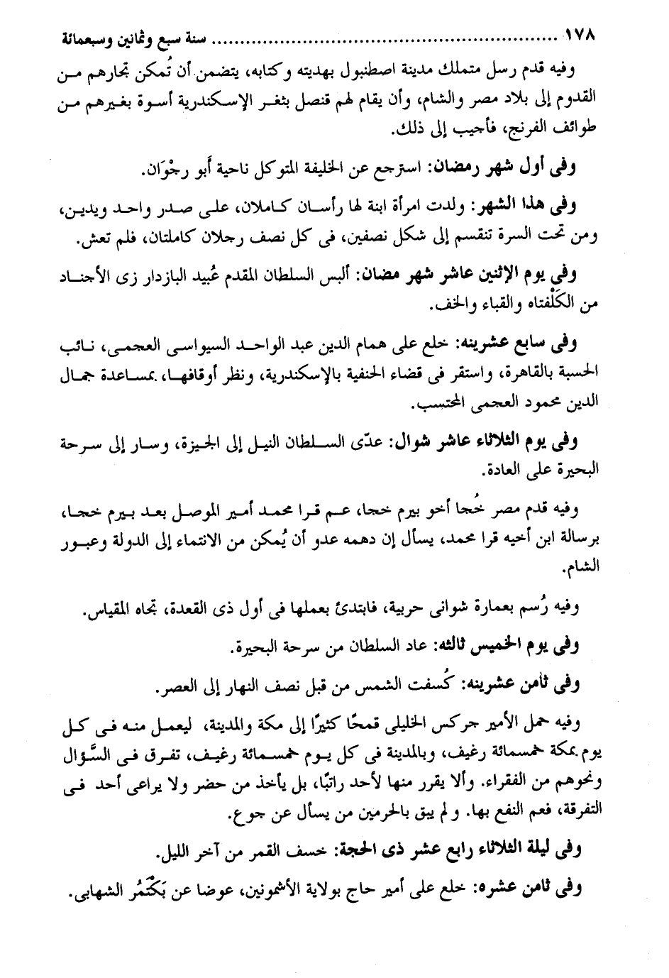 وَفِيه قدم رسل متملك مَدِينَة اصطنبول بهديته وَكتابه يتَضَمَّن. أَن تمكن تجارهم من الْقدوم إِلَى بِلَاد مصر وَالشَّام وَأَن يُقَام لَهُم قنصل بثغر الْإسْكَنْدَريَّة أُسْوَة بغيرهم من طوائف الفرنج فَأُجِيب إِلَى ذَلِك. وَفِي أول شهر رَمَضَان: اسْترْجع عَن الْخَلِيفَة المتَوَكل نَاحيَة أَبو رجْوَان. وَفِي هَذَا الشَّهْر: ولدت امْرَأَة ابْنة لَهَا رأسان كاملان على صدر وَاحِد ويدين وَمن تَحت السُّرَّة تَنْقَسِم إِلَى شكل نِصْفَيْنِ فِي كل نصف رجلَانِ كاملتان فَلم تعش وَفِي يَوْم الْإِثْنَيْنِ عَاشر شهر رَمَضَان: ألبس السُّلْطَان الْمُقدم عبيد البازدارزي الأجناد من الكَلْفتاه والقباء والخف. وَفِي سَابِع عشرينه: خلع على همام الدّين عبد الْوَاحِد السيواسي العجمي نَائِب الْحِسْبَة بِالْقَاهِرَةِ وَاسْتقر فِي قَضَاء الْحَنَفِيَّة بالإسكندرية وَنظر أوقافها. بمساعدة جمال الدّين مَحْمُود العجمي الْمُحْتَسب. وَفِي يَوْم الثُّلَاثَاء عَاشر شَوَّال: عدّى السُّلْطَان النّيل إِلَى الجيزة وَسَار إِلَى سرحة الْبحيرَة على الْعَادة. وَفِيه قدم مصر خُجا أَخُو بيرم خجا عَم قرا مُحَمَّد أَمِير الْموصل بعد بيرم خجا برسالة ابْن أَخِيه قرا محمل يسْأَل إِن دهمه عَدو أَن يُمكن من الانتماء إِلَى الدولة وعبور الشَّام. وَفِي يَوْم الْخَمِيس ثالثه: عَاد السُّلْطَان من سرحة الْبحيرَة. وَفِي ثامن عشرينه: كسفت الشَّمْس من قبل نصف النَّهَار إِلَى الْعَصْر. وَفِيه حمل الْأَمِير جركس الخليلي قمحًا كثيرا إِلَى مَكَّة وَالْمَدينَة ليعْمَل مِنْهُ فِي كل يَوْم. بِمَكَّة خَمْسمِائَة رغيف وبالمدينة فِي كل يَوْم خَمْسمِائَة رغيف تفرق فِي السُّؤَال وَنَحْوهم من الْفُقَرَاء. وَألا يُقرر مِنْهَا لأحد راتبًا بل يَأْخُذ من حضر وَلَا يُرَاعِي أحد فِي التَّفْرِقَة فَعم النَّفْع بهَا. وَلم يبْق بالحرمين من يسْأَل عَن جوع. وَفِي لَيْلَة الثُّلَاثَاء رَابِع عشر ذِي الْحجَّة: خسف الْقَمَر من آخر اللَّيْل. وَفِي ثامن عشره: خلع على أَمِير حَاج بِولَايَة الأشمونين عوضا عَن بَكتمُر الشهابي.