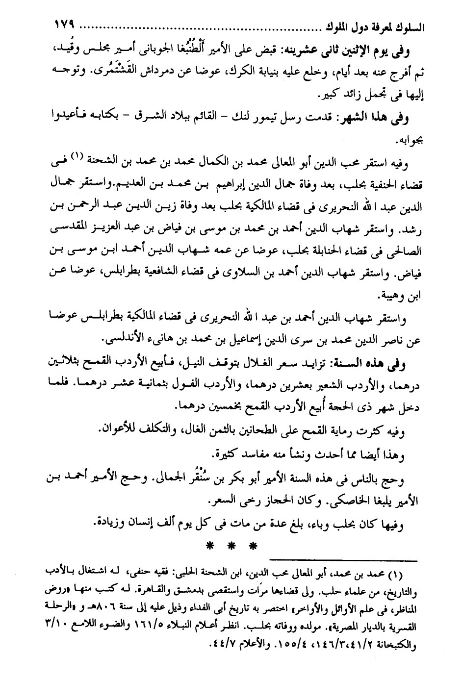 وَفِي يَوْم الْإِثْنَيْنِ ثَانِي عشرينه: قبض على الْأَمِير أَلْطنبُغا الجوباني أَمِير مجْلِس وقُيد ثمَّ أفرج عَنهُ بعد أَيَّام وخلع عَلَيْهِ بنيابة الكرك عوضا عَن دمرداش القَشتَمُري. وَتوجه إِلَيْهَا فِي تجمل زَائِد كَبِير. وَفِي هَذَا الشَّهْر: قدمت رسل تيمورلنك - الْقَائِم بِبِلَاد الشرق - بكتابه فأعيدوا بجوابه. وَفِيه اسْتَقر محب الدّين أَبُو الْمَعَالِي مُحَمَّد بن الْكَمَال مُحَمَّد بن مُحَمَّد بن الشّحْنَة فِي قَضَاء الْحَنَفِيَّة بحلب بعد وَفَاة جمال الدّين إِبْرَاهِيم بن مُحَمَّد بن العديم. وَاسْتقر جمال الدّين عبد الله النحريري فِي قَضَاء الْمَالِكِيَّة بحلب بعد وَفَاة زين الدّين عبد الرَّحْمَن بن رشد. وَاسْتقر شهَاب الدّين أَحْمد بن مُحَمَّد بن مُوسَى بن فياض بن عبد الْعَزِيز الْمَقْدِسِي الصَّالِحِي فِي قَضَاء الْحَنَابِلَة بحلب عوضا عَن عَمه شهَاب الدّين أَحْمد ابْن مُوسَى بن فياض. وَاسْتقر شهَاب الدّين أَحمد بن السلاوي فِي قَضَاء الشَّافِعِيَّة بطرابلس عوضا عَن ابْن وهيبة. وَاسْتقر شهَاب الدّين أَحْمد بن عبد الله النحريري فِي قَضَاء الْمَالِكِيَّة بطرابلس عوضا عَن نَاصِر الدّين مُحَمَّد بن سرى الدّين إِسْمَاعِيل بن مُحَمَّد بن هانىء الأندلسي. وَفِي هَذِه السّنة: تزايد سعر الغلال بتوقف النّيل فأبيع الأردب الْقَمْح بِثَلَاثِينَ درهما والأردب الشّجر بِعشْرين درهما والأردب الفول بِثمَانِيَة عشر درهما. فَلَمَّا دخل شهر ذِي الْحجَّة أُبيع الأردب الْقَمْح بِخَمْسِينَ درهما. وَفِيه كثرت رماية الْقَمْح على الطحانين بِالثّمن الغال والتكلف للأعوان. وَهَذَا أَيْضا مِمَّا أحدث وَنَشَأ مِنْهُ مفاسد كَثِيرَة. وَحج بِالنَّاسِ فِي هَذِه السّنة الْأَمِير أَبُو بكر بن سُنقُر الجمالي. وَحج الْأَمِير أَحْمد بن الْأَمِير يلبغا الخاصكي. وَكَانَ الْحجاز رخى السّعر. وفيهَا كَانَ بحلب وباء بلغ عدَّة من مَاتَ فِي كل يَوْم ألف إِنْسَان وَزِيَادَة.