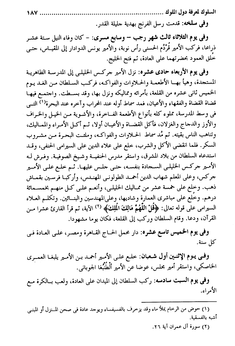 وَفِي سلخه: قدمت رسل الفرنج بهدية جليلة الْقدر. وَفِي يَوْم الثُّلَاثَاء ثَالِث شهر رَجَب - وسابع مسرى: - كَانَ وَفَاء النّيل سِتَّة عشر ذِرَاعا فَركب الْأَمِير قُرْدُم الحسني رَأس نوبَة والأمير يُونُس الدوادار إِلَى المقياس حَتَّى خُلق العمود بحضرتهما على الْعَادة ثمَّ فتح الخليج. وَفِي يَوْم الْأَرْبَعَاء حادي عشره: نزل الْأَمِير جركس الخليلي إِلَى الْمدرسَة الظَّاهِرِيَّة المستجدة وهيأ بهَا الْأَطْعِمَة والحلاوات والفواكه فَركب السُّلْطَان من الْغَد يَوْم الْخَمِيس ثَانِي عشره من القلعهّ بأمرائه ومماليكه وَنزل بهَا وَقد بسطت. وَاجْتمعَ فِيهَا قُضَاة الْقُضَاة وَالْفُقَهَاء والأعيِان فَمد سماط أَوله عِنْد الْمِحْرَاب وَآخره عِنْد البحرة الَّتِي فِي وسط الْمدرسَة مَمْلُوء كُله بأنواع الْأَطْعِمَة الفاخرة والأشوية من الْخَيل والخراف والأوز والدجاج والغزلان فَأكل الْقُضَاة والأعيِان أَولا ثمَّ أكل الْأُمَرَاء والمماليك وتناهب النَّاس بَقِيَّته. ثمَّ مُد سماط الحلاوات الْفَوَاكِه وملئت البحرة من مشروب السكر. فَلَمَّا انْقَضى الْأكل وَالشرب خلع على عَلَاء الدّين عَليّ السيرامي الْحَنَفِيّ وَقد استدعاه السُّلْطَان من بِلَاد الْمشرق وَاسْتقر مدرس الْحَنَفِيَّة وَشَيخ الصُّوفِيَّة. وفرش لَهُ الْأَمِير جركس الخليلي السجادة بِنَفسِهِ حَتَّى جلس عَلَيْهَا. ثمَّ خلع على الْأَمِير جركس وعَلى الْمعلم شهَاب الدّين أَحْمد الطولوني المهندس وأركبا فرسين بقماش ذهب وخلع على خَمْسَة عشر من مماليك الخليلي وأنعم على كل مِنْهُم بِخَمْسِمِائَة دِرْهَم. وخُلع على مباشري الْعِمَارَة وشاديها وعَلى المهندسين والبنائين. وَتكلم الْعَلَاء السيرامي على قَوْله تَعَالَى: قل اللَّهُمَّ ملك الْملك ثمَّ قَرَأَ الْقَارئ عشرا من الْقُرْآن ودعا. وَقَامَ السُّلْطَان وَركب إِلَى القلعة فَكَانَ يَوْمًا مشهوداً. وَفِي يَوْم الْخَمِيس تَاسِع عشره: دَار محمل الْحَاج الْقَاهِرَة ومصر على الْعَادة فِي كل سنة. وَفِي يَوْم الْإِثْنَيْنِ أول شعْبَان: خلع على الْأَمِير اً حمد بن الْأَمِير يلبغا الْعمريّ الخاصكي وَاسْتقر أَمِير مجْلِس عوضا عَن الْأَمِير ألطُنْبُغا الجوباني. وَفِي يَوْم السبت سادسه: ركب السُّلْطَان إِلَى الميدان على الْعَادة وَلعب بالكرة مَعَ الْأُمَرَاء.