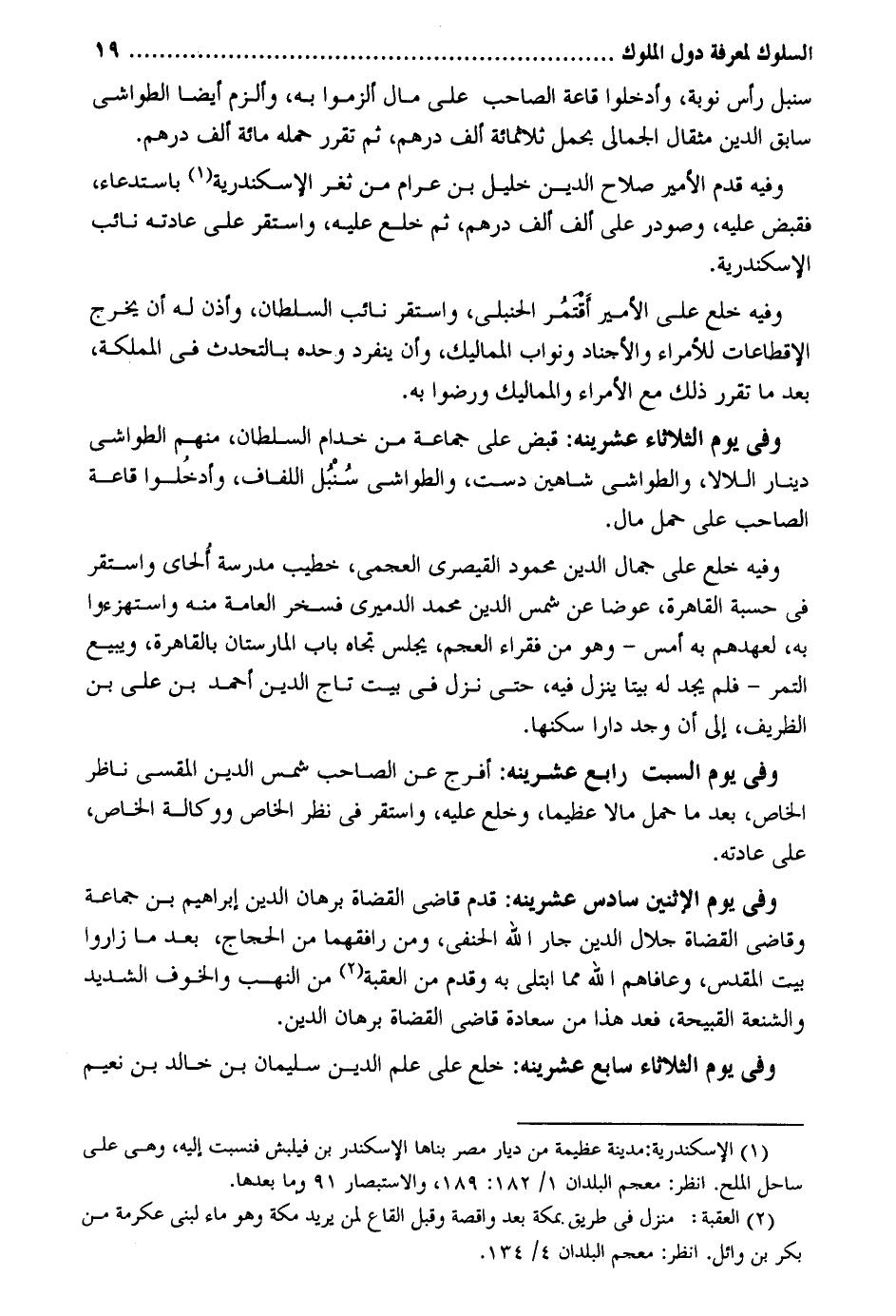 سنبل رَأس نوبَة وأدخلوا قاعة الصاحب على مَال ألزموا بِهِ وألزم أَيْضا الطواشي سَابق الدّين مِثْقَال الجمالي بِحمْل ثَلَاثمِائَة ألف دِرْهَم ثمَّ تقرر حمله مائَة ألف دِرْهَم. وَفِيه قدم الْأَمِير صَلَاح الدّين خَلِيل بن عرام من ثغر الْإسْكَنْدَريَّة باستدعاء فَقبض عَلَيْهِ وصودر على ألف ألف دِرْهَم ثمَّ خلع عَلَيْهِ وَاسْتقر على عَادَته نَائِب الْإسْكَنْدَريَّة. وَفِيه خلع على الْأَمِير آقتمر الْحَنْبَلِيّ وَاسْتقر نَائِب السُّلْطَان وَأذن لَهُ أَن يخرج الإقطاعات لِلْأُمَرَاءِ والأجناد ونواب المماليك وَأَن ينْفَرد وَحده بالتحدث فِي المملكة بعد مَا تقرر ذَلِك مَعَ الْأُمَرَاء والمماليك وَرَضوا بِهِ. وَفِي يَوْم الثُّلَاثَاء عشرينه: قبض على جمَاعَة من خدام السُّلْطَان مِنْهُم الطواشي دِينَار اللالا والطواشي شاهين دست والطواشي سنبل اللفاف وأدخلوا قاعة الصاحب على حمل مَال. وَفِيه خلع على جمال الدّين مَحْمُود القيصري العجمي خطيب مدرسة ألحاي وَاسْتقر فِي حسبَة الْقَاهِرَة عوضا عَن شمس الدّين مُحَمَّد الدميرى فَسخرَ الْعَامَّة مِنْهُ واستهزءوا بِهِ لعهدهم بِهِ أمس - وَهُوَ من فُقَرَاء الْعَجم يجلس تجاه بَاب المارستان بِالْقَاهِرَةِ وَيبِيع التَّمْر - فَلم يجد لَهُ بَيْتا ينزل فِيهِ حَتَّى نزل فِي بَيت تَاج الدّين أَحْمد بن عَليّ بن الظريف إِلَى أَن وجد دَارا سكنها. وَفِي يَوْم السبت رَابِع عشرينه: أفرج عَن الصاحب شمس الدّين المقسي نَاظر الْخَاص بعد مَا حمل مَالا عَظِيما وخلع عَلَيْهِ وَاسْتقر فِي نظر الْخَاص ووكالة الْخَاص على عَادَته. وَفِي يَوْم الْإِثْنَيْنِ سادس عشرينه: قدم قاضى الْقُضَاة برهَان الدّين إِبْرَاهِيم بن جمَاعَة وقاضى الْقُضَاة جلال الدّين جَار الله الْحَنَفِيّ وَمن رافقهما من الْحجَّاج بعد مَا زاروا بَيت الْمُقَدّس وعافاهم الله مِمَّا ابتلى بِهِ وَقدم من الْعقبَة من النهب وَالْخَوْف الشَّديد والشنعة القبيحة فعد هَذَا من سَعَادَة قَاضِي الْقُضَاة برهَان الدّين. وَفِي يَوْم الثُّلَاثَاء سَابِع عشرينه: خلع على علم الدّين سُلَيْمَان بن خَالِد بن نعيم