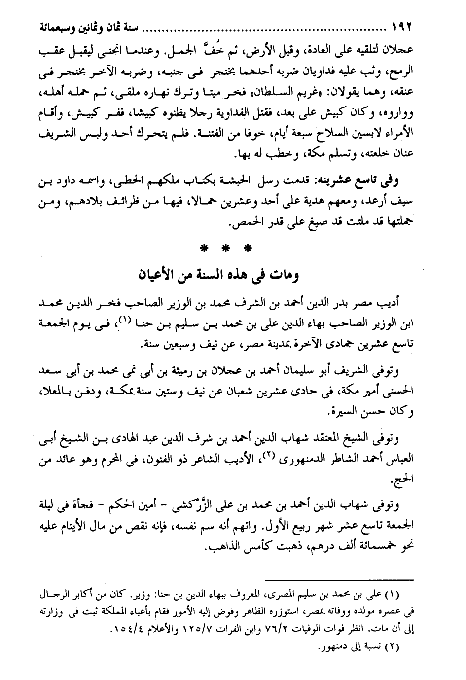 عجلَان لتلقيه على الْعَادة وَقبل الأَرْض ثمَّ خُفَّ الْجمل. وعندما انحنى ليقبل عقب الرمْح وثب عَلَيْهِ فداويان ضربه أَحدهمَا بخنجر فِي جنبه وضربه الآخر بخنجر فِي عُنُقه وهما يَقُولَانِ: غَرِيم السُّلْطَان فَخر مَيتا وَترك نَهَاره ملقى ثمَّ حمله أَهله وَوَاروهُ وَكَانَ كبيش على بعد فَقتل الفداوية رجلا يظنوه كبيشا ففر كبيش وَأقَام الْأُمَرَاء لابسين السِّلَاح سَبْعَة أَيَّام خوفًا من الْفِتْنَة. فَلم يَتَحَرَّك أحد وَلبس الشريف عنان خلعته وتسلم مَكَّة وخطب لَهُ بهَا. وَفِي تَاسِع عشرينه: قدمت رسل الْحَبَشَة بِكِتَاب ملكهم الحطي واسْمه دَاوُد بن سيف أرعد وَمَعَهُمْ هَدِيَّة على أحد وَعشْرين حمالا فِيهَا من ظرائف بِلَادهمْ وَمن جُمْلَتهَا قد ملئت قد صِيغ على قدرالحمص. وَمَات فِي هَذِه السّنة من الْأَعْيَان أديب مصر بدر الدّين أَحْمد بن الشّرف مُحَمَّد بن الْوَزير الصاحب فَخر الدّين مُحَمَّد بن الْوَزير الصاحب بهاء الدّين عَليّ بن مُحَمَّد بن سليم بن حنا فِي يَوْم الْجُمُعَة تَاسِع عشْرين جُمَادَى الْآخِرَة. بِمَدِينَة مصر عَن نَيف وَسبعين سنة. وَتُوفِّي الشريف أَبُو سُلَيْمَان أَحْمد بن عجلَان بن رميثة بن أبي نمي مُحَمَّد بن أبي سعد الحسني أَمِير مَكَّة فِي حادي عشْرين شعْبَان عَن نَيف وَسِتِّينَ سنة. بِمَكَّة وَدفن بالمعلا وَكَانَ حسن وَتُوفِّي الشَّيْخ المعتقد شهَاب الدّين أَحْمد بن شرف الدّين عبد الْهَادِي بن الشَّيْخ أبي الْعَبَّاس أَحْمد الشاطر الدمنهوري الأديب الشَّاعِر ذُو الْفُنُون فِي الْمحرم وَهُوَ عَائِد من الْحَج. وَتُوفِّي شهَاب الدّين أَحْمد بن مُحَمَّد بن على الزَّرْكَشِيّ - أَمن الحكم - فَجْأَة فِي لَيْلَة الْجُمُعَة تَاسِع عشر شهر ربيع الأول. واتهم أَنه سم نَفسه فَإِنَّهُ نقص من مَال الْأَيْتَام عَلَيْهِ نَحْو خَمْسمِائَة ألف دِرْهَم ذهبت كأمس الذَّاهِب.