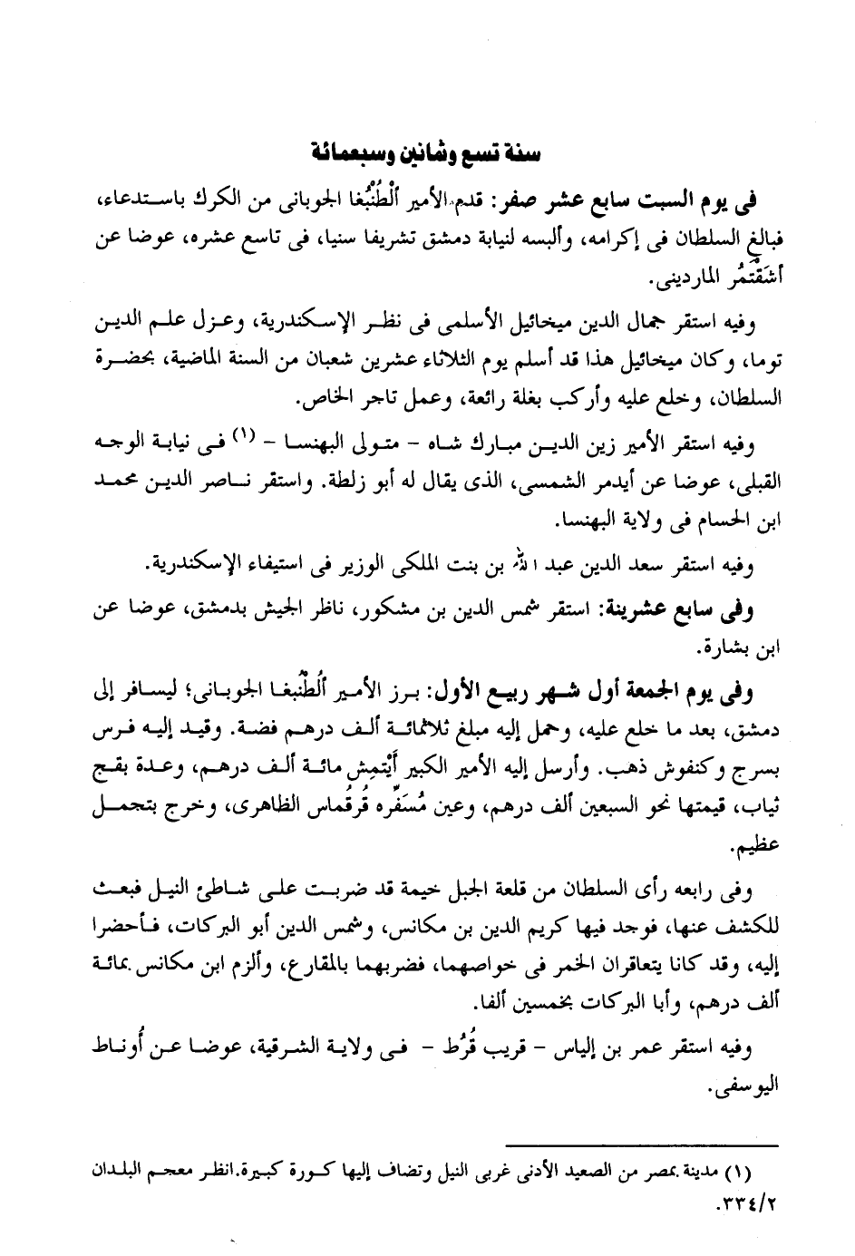 سنه تسع وَثَمَانِينَ وَسَبْعمائة فِي يَوْم السبت سَابِع عشر صفر: قدم الْأَمِير ألطُنْبغا الجوباني من الكرك باستدعاء فَبَالغ السُّلْطَان فِي إكرامه وَألبسهُ لنيابة دمشق تَشْرِيفًا سنيا فِي تَاسِع عشره عوضا عَن أشَقتمُر المارديني. وَفِيه اسْتَقر جمال الدّين ميخائيل الْأَسْلَمِيّ فِي نظر الْإسْكَنْدَريَّة وعزل علم الدّين توما وَكَانَ ميخائيل هَذَا قد أسلم يَوْم الثُّلَاثَاء عشْرين شعْبَان من السّنة الْمَاضِيَة بِحَضْرَة السُّلْطَان وخلع عَلَيْهِ وأركب بغلة رائعة وَعمل تَاجر الْخَاص. وَفِيه اسْتَقر الْأَمِير زين الدّين مبارك شاه - مُتَوَلِّي البهنسا - فِي نِيَابَة الْوَجْه القبلي عوضا عَن أيدمر الشمسي الَّذِي يُقَال لَهُ أَبُو زلطة. وَاسْتقر نَاصِر الدّين مُحَمَّد ابْن الحسام فِي ولَايَة البهنسا. وَفِي سَابِع عشرينه: اسْتَقر شمس الدّين بن مشكور نَاظر الْجَيْش بِدِمَشْق عوضا عَن ابْن بِشَارَة. وَفِي يَوْم الْجُمُعَة أول شهر ربيع الأول: برز الْأَمِير ألطنبغا الجوباني ليسافر إِلَى دمشق بعد مَا خلع عَلَيْهِ وَحمل إِلَيْهِ مبلغ ثَلَاثمِائَة ألف دِرْهَم فضَّة. وَقيد إِلَيْهِ فرس بسرج وكنفوش ذهب. وَأرْسل إِلَيْهِ الْأَمِير الْكَبِير أَيتمش مائَة ألف دِرْهَم وعدة بقج ثِيَاب قيمتهَا نَحْو السّبْعين ألف دِرْهَم وَعين مُسَفِّره قُرقُماس الظَّاهِرِيّ وَخرج بتجمل عَظِيم. وَفِي رابعه رأى السُّلْطَان من قلعة الْجَبَل خيمة قد ضربت على شاطىء النّيل فَبعث للكشف عَنْهَا فَوجدَ فِيهَا كريم الدّين بن مكانس وشمس الدّين أَبُو البركات فأحضرا إِلَيْهِ وَقد كَانَا يتعاقران الْخمر فِي خواصهما فضربهما بالمقارع وألزم ابْن مكانس. بِمِائَة ألف دِرْهَم وَأَبا البركات بِخَمْسِينَ ألفا. وَفِيه اسْتَقر عمر بن إلْيَاس - قريب قرُط - فِي ولَايَة الشرقية عوضا عَن أُوناط اليوسفي.