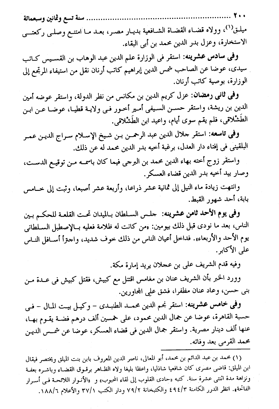 ميلق وولاه قَضَاء الْقُضَاة الشَّافِعِيَّة بديار مصر بعد مَا امْتنع وَصلى رَكْعَتي الاستخارة وعزل بدر الدّين مُحَمَّد بن أبي الْبَقَاء. وَفِي سادس عشرينه: اسْتَقر فِي الوزارة علم الدّين عبد الْوَهَّاب بن القسيس كَاتب سَيِّدي عوضا عَن الصاحب شمس الدّين إِبْرَاهِيم كَاتب أرنان نقل من اسْتِيفَاء المرتجع إِلَى الوزارة وَفِي ثَانِي رَمَضَان: عزل كريم الدّين بن مكانس من نظر الدولة وَاسْتقر عوضه أَمِين الدّين بن ريشة وَاسْتقر حسن السيفي أَمِير أخور فِي ولَايَة قطيا عوضا عَن ابْن الطَشلاقي فَلم يقم سوى أَيَّام واعيد ابْن الطَشلاقي. وَفِي تاسعه: اسْتَقر جلال الدّين عبد الرَّحْمَن بن شيخ الْإِسْلَام سراج الدّين عمر البُلْقِينِيّ فِي إِفْتَاء دَار الْعدْل برغبة أَخِيه بدر الدّين مُحَمَّد لَهُ عَن ذَلِك. وَاسْتقر زوج أُخْته بهاء الدّين مُحَمَّد بن الْبُرْجِي فِيمَا كَانَ باسمه من توقيع الدست وَصَارَ بيد أَخِيه بدر الدّين قَضَاء الْعَسْكَر. وانتهت زِيَادَة مَاء النّيل إِلَى ثَمَانِيَة عشر ذِرَاعا وَأَرْبَعَة عشر أصبعا وَثَبت إِلَى خَامِس بابة أحد شهور القبط. وَفِي يَوْم الْأَحَد ثامن عشرينه: جلس السُّلْطَان بالميدان تَحت القلعة للْحكم بَين النَّاس بعد مَا نُودي قبل ذَلِك بيومين: من كَانَت لَهُ ظلامة فَعَلَيهِ بالإصطبل السلطاني يَوْم الْأَحَد وَالْأَرْبِعَاء. فداخل أَعْيَان النَّاس من ذَلِك خوف شَدِيد واجترأ أسافل النَّاس على الأكابر. وَفِيه قدم الشريف على بن عجلَان يُرِيد إِمَارَة مَكَّة. وَورد الْخَبَر بِأَن الشريف عنان بن مغامس اقتتل مَعَ كبيش فَقتل كبيش فِي عدَّة من بني حسن وَفِي خَامِس عشرينه: اسْتَقر نجم الدّين مُحَمَّد الطنبدي - وَكيل بَيت المَال - فِي حسبَة الْقَاهِرَة عوضا عَن جمال الدّين مَحْمُود على خمسين ألف دِرْهَم فضَّة يقوم بهَا عَنْهَا ألف دِينَار مصريهَ. وَاسْتقر جمال الدّين فِي قَضَاء الْعَسْكَر عوضا عَن شمس الدّين مُحَمَّد القرمي بعد وَفَاته.