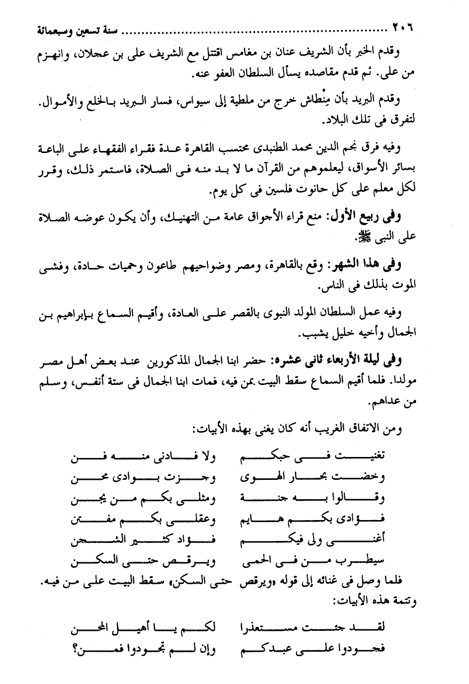 وَقدم الْخَبَر بِأَن الشريف عنان بن مغامس اقتتل مَعَ الشريف عَليّ بن عجلَان وَانْهَزَمَ من عَليّ. ثمَّ قدم مقاصده يسْأَل السُّلْطَان الْعَفو عَنهُ. وَقدم الْبَرِيد بِأَن مِنْطاش خرج من ملطية إِلَى سيواس فَسَار الْبَرِيد بِالْخلْعِ وَالْأَمْوَال. لتفرق فِي تَلك الْبِلَاد. وَفِيه فرق نجم الدّين مُحَمَّد الطنبدي محتسب الْقَاهِرَة عدق فُقَرَاء الْفُقَهَاء على الباعة بِسَائِر الْأَسْوَاق ليعلموهم من الْقُرْآن مَا لَا بُد مِنْهُ فِي الصَّلَاة فاستمر ذَلِك وَقرر لكل معلم على كل وَفِي ربيع الأول: منع قراء الأجواق عَامَّة من التهنيك وَأَن يكون عوضه الصَّلَاة على النَّبِي. وَفِي هَذَا الشَّهْر: وَقع بِالْقَاهِرَةِ ومصر وضواحيهم طاعون وحميات حادة وفشى الْمَوْت بذلك فِي النَّاس. وَفِيه عمل السُّلْطَان المولد النَّبَوِيّ بِالْقصرِ على الْعَادة وأقيم السماع بإبراهيم بن الْجمال وأخيهخليل يشبب. وَفِي لَيْلَة الْأَرْبَعَاء ثَمَانِي عشره: حضر ابْنا الْجمال الْمَذْكُورين عِنْد بعض أهل مصر مولدا. فَلَمَّا أقيم السماع سقط الْبَيْت. بِمن فِيهِ فَمَاتَ ابْنا الْجمال فِي سِتَّة أنفس وَسلم من عداهم. وَمن الِاتِّفَاق الْغَرِيب أَنه كَانَ يُغني بِهَذِهِ الأبيات: تَغَنَّيْت فِي حبكم وَلَا فادني مِنْهُ. فن وخضت بحار الْهوى وجزت بوادي محن. وَقَالُوا بِهِ جنَّة ومثلي بكم من يجن. فُؤَادِي بكم هايم وعقلي بكم مفتن أُغني ولي فِيكُم فؤاد كثير الشجن سيطرب من فِي الْحمى ويرقص حَتَّى السكن. فَلَمَّا وصل فِي غنائه إِلَى قَوْله ويرقص حَتَّى السكن سقط الْبَيْت على من فِيهِ وتتمة هَذِه الأبيات: لقد جِئْت مستِعذرا لكم يَا أهيل المحن. فجودوا على عبدكم وَإِن لم تجودوا فَمن