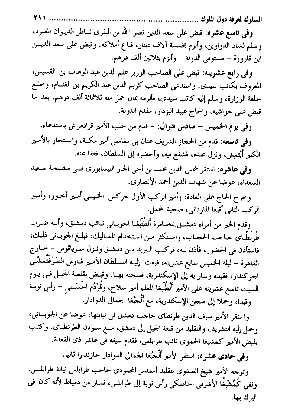 وَفِي تَاسِع عشره: قبض على سعد الدّين نصر الله بن البقري نَاظر الدِّيوَان الْمُفْرد وَسلم لشاد الدَّوَاوِين وألزم بِخَمْسَة آلَاف دِينَار فَبَاعَ أملاكه. وَقبض على سعد الدّين ابْن قَارُورَة مُسْتَوْفِي الدولة - وألزم بِثَلَاثِينَ ألف دِرْهَم. وَفِي رَابِع عشرينه: قبض على الصاحب الْوَزير علم الدّين عبد الْوَهَّاب بن القسيس الْمَعْرُوف بكاتب سَيِّدي. واستدعى الصاحب كريم الدّين عبد الْكَرِيم بن الغنام وخلع خلعة الوزارة وَسلم إِلَيْهِ كَاتب سَيِّدي فألزمه. بِمَال حمل مِنْهُ ثَلَاثمِائَة ألف دِرْهَم بعد مَا قبض على حَوَاشِيه والحاج عبيد البزدار مقدم الدولة. وَفِي يَوْم الْخَمِيس - سادس شَوَّال: قدم من حلب الْأَمِير قرادمراش باستدعاء. وَفِي تاسعه: قدم من الْحجاز الشريف عنان بن مغامس أَمِير مَكَّة واستجار بالأمير الْكَبِير أَيتمش وَنزل عِنْده فشفع فِيهِ وأحضره إِلَى السُّلْطَان فَعَفَا عَنهُ. وَفِي عاشره: اسْتَقر شمس الدّين مُحَمَّد بن أخي الْجَار النَّيْسَابُورِي فِي مشيخة سعيد السُّعَدَاء عوضا عَن شهَاب الدّين أَحْمد الْأنْصَارِيّ. وَخرج الْحَاج على الْعَادة وأمير الركب الأول جركس الخليلي أَمِير آخور وأمير الركب الثَّانِي أقبغا المارداني صُحْبَة الْمحمل. وَقدم الْخَبَر من أُمَرَاء دمشق. بمخامرة أَلطُنبُغا الجوباني نَائِب دمشق وَأَنه ضرب طُرنُطاي حَاجِب الْحجاب واستكثر من اسْتِخْدَام المماليك فَبلغ الجوباني ذَلِك فَاسْتَأْذن فِي الْحُضُور فَأذن لَهُ فَركب الْبَرِيد من دمشق وَنزل سرياقوس - خَارج الْقَاهِرَة - لَيْلَة الْخَمِيس سَابِع عشرينه فَبعث إِلَيْهِ السُّلْطَان الْأَمِير فَارس الصَرْغَتْمشُى الجوكندار فقيده وَسَار بِهِ إِلَى الْإسْكَنْدَريَّة فسجنه بهَا. وَقبض بقلعة الْجَبَل فِي يَوْم السبت تَاسِع عشرينه على الْأَمِير أَلْطُنْبغا الْمعلم أَمِير سلَاح وقردُم الحَسَنيِ - رَأس نوبَة - وقيدا وحملا إِلَى سجن الْإسْكَنْدَريَّة مَعَ أَلْجبُغا الجمالي الدوادار. وَاسْتقر الْأَمِير سيف الدّين طرنطاي حَاجِب دمشق فِي نيابتها عوضا عَن الجوباني وَحمل إِلَيْهِ التشريف والتقليد من قلعة الْجَبَل إِلَى دمشق مَعَ سودن الطرنطاي. وَكتب بِقَبض الْأَمِير كمشبغا الْحَمَوِيّ نَائِب طرابلس فَقدم سَيْفه فِي عَاشر ذِي الْقعدَة. وَفِي حادي عشره: اسْتَقر الْأَمِير ألجبُغا الجمالي الدوادار خازندارا ثَانِيًا. وَتوجه الْأَمِير شيخ الصفوي بتقليد أسندمر المحمودي حَاجِب طرابلس نِيَابَة طرابلس. وَنفي كُمُشبغُا الأشرفي الخاصكي رَأس نوبَة إِلَى طرابلس فَسَار من دمياط لِأَنَّهُ كَانَ فِي اليزك بهَا.