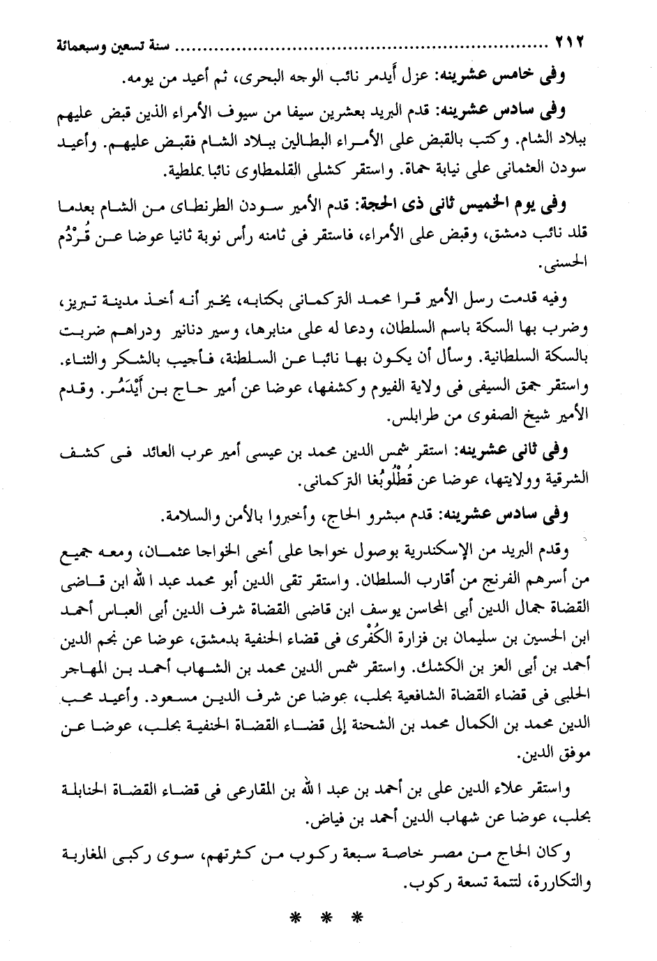 وَفِي خَامِس عشرينه: عزل أَيدمر نَائِب الْوَجْه البحري ثمَّ أُعِيد من يَوْمه. وَفِي سادس عشرينه: قدم الْبَرِيد بِعشْرين سَيْفا من سيوف الْأُمَرَاء الَّذين قبض عَلَيْهِم بِبِلَاد الشَّام. وَكتب بِالْقَبْضِ على الْأُمَرَاء البطالين بِبِلَاد الشَّام فَقبض عَلَيْهِم. وأعيد سودن العثماني على نِيَابَة حماة. وَاسْتقر كشلي القلمطاوي نَائِبا. بملطية. وَفِي يَوْم الْخَمِيس ثَانِي ذِي الْحجَّة: قدم الْأَمِير سودن الطرنطاي من الشَّام بَعْدَمَا قلد نَائِب وَفِيه قدمت رسل الْأَمِير قرا مُحَمَّد التركماني بكتابه يخبر أَنه أَخذ مَدِينَة تبريز وَضرب بهَا السِّكَّة باسم السُّلْطَان ودعا لَهُ على منابرها وسير دَنَانِير ودراهم ضربت بالسكة السُّلْطَانِيَّة. وَسَأَلَ أَن يكون بهَا نَائِبا عَن السلطة فَأُجِيب بالشكر وَالثنَاء. وَاسْتقر جمق السيفي فِي ولَايَة الفيوم وكشفها عوضا عَن أَمِير حَاج بن أَيدَمُر. وَقدم الْأَمِير شيخ الصفوي من طرابلس. وَفِي ثَانِي عشرينه: اسْتَقر شمس الدّين مُحَمَّد بن عِيسَى أَمِير عرب الْعَائِد فِي كشف الشرقية وولايتها عوضا عَن قُطْلُوبُغا التركماني. وَفِي سادس عشرينه: قدم مبشرو الْحَاج وأخبروا بالأمن والسلامة. وَقدم الْبَرِيد من الْإسْكَنْدَريَّة بوصول خواجا عَليّ أخي الخواجا عُثْمَان وَمَعَهُ جَمِيع من أسرهم الفرنج من أقَارِب السُّلْطَان. وَاسْتقر تَقِيّ الدّين أَبُو مُحَمَّد عبد الله ابْن قَاضِي الْقُضَاة جمال الدّين أبي المحاسن يُوسُف ابْن قَاضِي الْقُضَاة شرف الدّين أبي الْعَبَّاس أَحْمد بن الْحُسَيْن بن سُلَيْمَان بن فَزَارَة الكُفْري فِي قَضَاء الْحَنَفِيَّة بِدِمَشْق عوضا عَن نجم الدّين أَحْمد بن أبي الْعِزّ بن الكشك. وَاسْتقر شمس الدّين مُحَمَّد بن الشهَاب أَحْمد بن المُهَاجر الْحلَبِي فِي قَضَاء الْقُضَاة الشَّافِعِيَّة بحلب عوضا عَن شرف الدّين مَسْعُود. وأعيد محب الدّين مُحَمَّد بن الْكَمَال مُحَمَّد بن الشّحْنَة إِلَى قَضَاء الْقُضَاة الْحَنَفِيَّة بحلب عوضا عَن موفق الدّين. وَاسْتقر عَلَاء الدّين عَليّ بن أَحْمد بن عبد الله بن المقارعي فِي قَضَاء الْقُضَاة الْحَنَابِلَة بحلب عوضا عَن شهَاب الدّين أَحْمد بن فياض. وَكَانَ الْحَاج من مصر خَاصَّة سَبْعَة ركُوب من كثرتهم سوى ركبي المغاربة والتكاررة لتتمة تِسْعَة ركُوب.