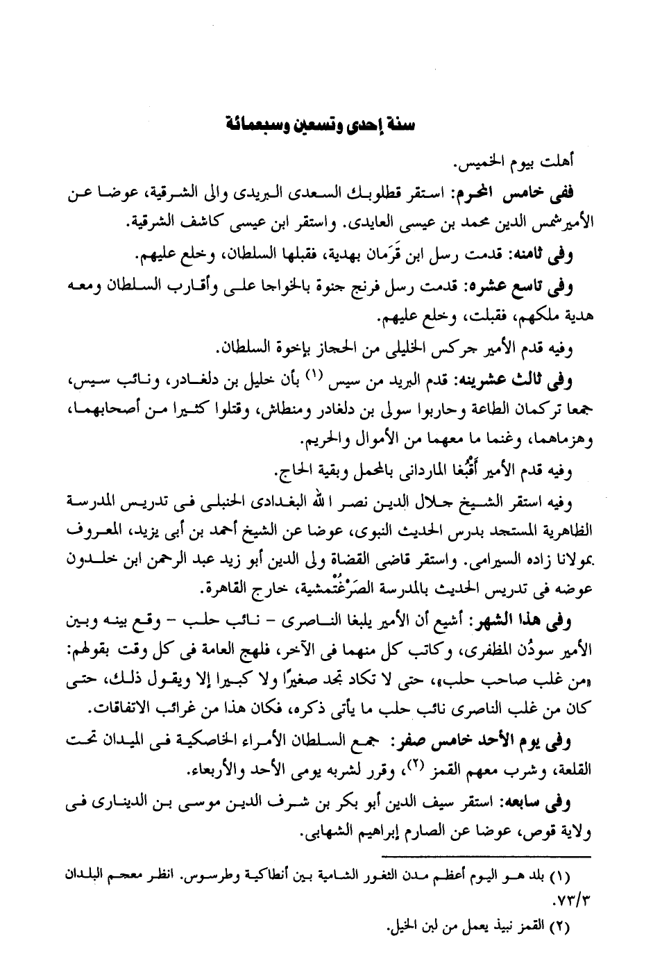 أهلت بِيَوْم الْخَمِيس فَفِي خَامِس الْمحرم: اسْتَقر قطلوبك السَّعْدِيّ البريدي وَالِي الشرقية عوضا عَن الْأَمِير شمس الدّين مُحَمَّد بن عِيسَى العايدي. وَاسْتقر ابْن عِيسَى كاشف الشرقية. وَفِي ثامنه: قدمت رسل ابْن قَرَمان بهدية فقبلها السُّلْطَان وخلع عَلَيْهِم. وَفِي تَاسِع عشره: قدمت رسل فرنج جنوة بالخواجا عَليّ وأقارب السُّلْطَان وَمَعَهُ هَدِيَّة ملكهم فَقبلت وخلع عَلَيْهِم. وَفِيه قدم الْأَمِير جركس الخليلي من الْحجاز بإخوة السُّلْطَان. وَفِي ثَالِث عشرينه: قدم الْبَرِيد من سيس بِأَن خَلِيل بن دلغادر ونائب سيس جمعا تركمان الطَّاعَة وحاربوا سولى بن دلغادر ومنطاش وَقتلُوا كثيرا من أصحابهما وهزماهما وَغنما مَا مَعَهُمَا من الْأَمْوَال والحريم. وَفِيه قدم الْأَمِير أقبغا المارداني بالمحمل وَبَقِيَّة الْحَاج. وَفِيه اسْتَقر الشَّيْخ جلال الدّين نصر الله الْبَغْدَادِيّ الْحَنْبَلِيّ فِي تدريس الْمدرسَة الظَّاهِرِيَّة المستجد بدرس الحَدِيث النَّبَوِيّ عوضا عَن الشَّيْخ أَحْمد بن أبي يزِيد الْمَعْرُوف بمولانا زَاده السيرامي. وَاسْتقر قَاضِي الْقُضَاة ولي الدّين أَبُو زيد عبد الرَّحْمَن ابْن خلدون عوضه فِي تدريس الحَدِيث بِالْمَدْرَسَةِ الصَرْغُتمشية خَارج الْقَاهِرَة. وَفِي هَذَا الشَّهْر: أشيع أَن الْأَمِير يلبغا الناصري - نَائِب حلب - وَقع بَينه وَبَين الْأَمِير سودُن المظفري وَكَاتب كل مِنْهُمَا فِي الآخر فلهج الْعَامَّة فِي كل وَقت بقَوْلهمْ: من غلب صَاحب حلب حَتَّى لَا تكَاد تَجِد صَغِيرا وَلَا كَبِيرا إِلَّا وَيَقُول ذَلِك حَتَّى كَانَ من غلب الناصري نَائِب حلب مَا يَأْتِي ذكره فَكَانَ هَذَا من غرائب الاتفاقات. وَفِي يَوْم الْأَحَد خَامِس صفر: جمع السُّلْطَان الْأُمَرَاء الخاصكية فِي الميدان تَحت القلعة وَشرب مَعَهم القمز وَقرر لشربه يومي الْأَحَد وَالْأَرْبِعَاء. وَفِي سابعه: اسْتَقر سيف الدّين أَبُو بكر بن شرف الدّين مُوسَى بن الديناري فِي ولَايَة قوص عوضا عَن الصارم إِبْرَاهِيم الشهابي.