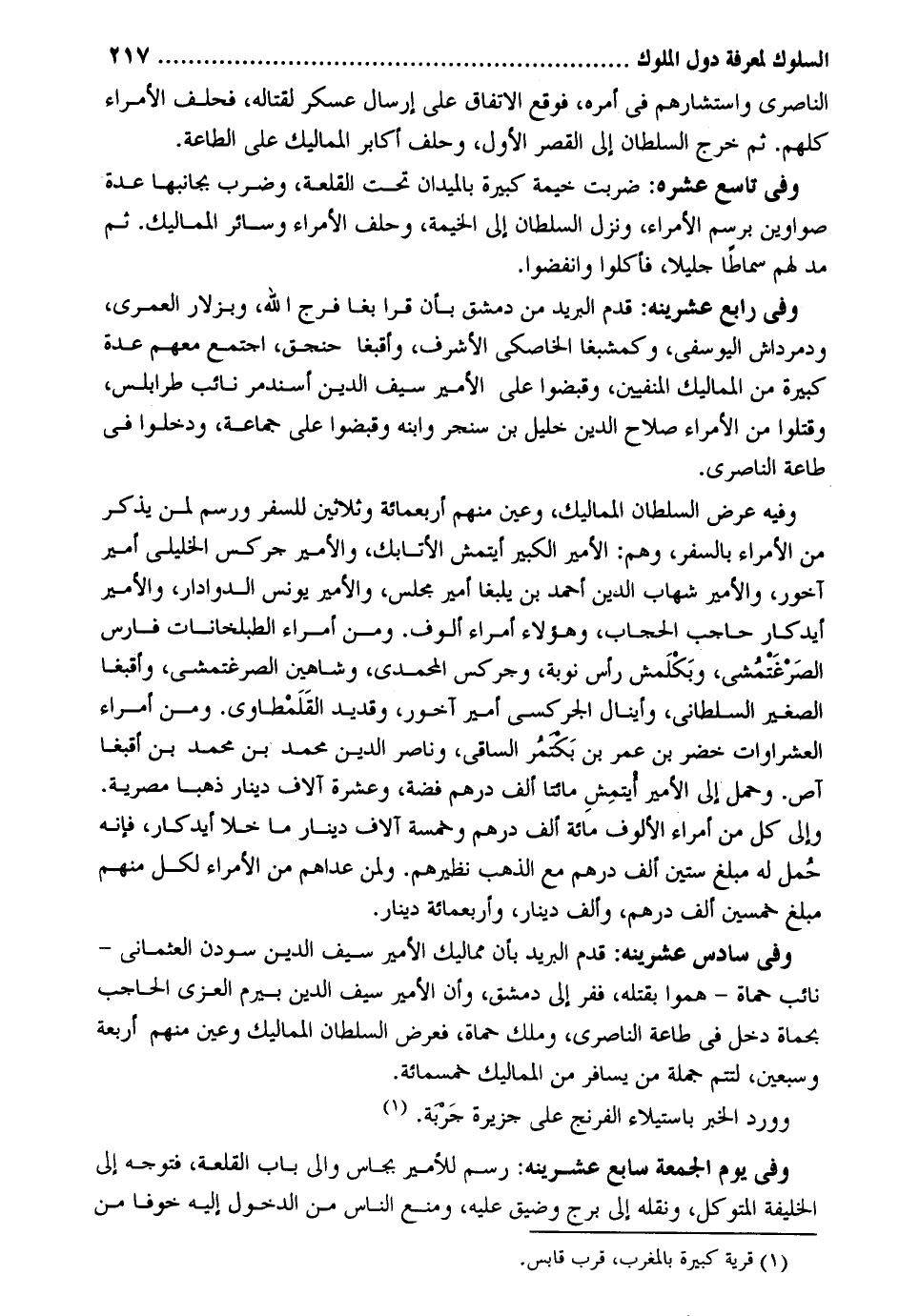 الناصري واستشارهم فِي أمره فَوَقع الِاتِّفَاق على إرْسَال عَسْكَر لقتاله فَحلف الْأُمَرَاء كلهم ثمَّ خرج السُّلْطَان إِلَى الْقصر الأول وَحلف أكَابِر المماليك على الطَّاعَة. وَفِي تَاسِع عشره: ضربت خيمة كَبِيرَة بالميدان تَحت القلعة وَضرب بجانبها عدَّة صواوين برسم الْأُمَرَاء وَنزل السُّلْطَان إِلَى الْخَيْمَة وَحلف الْأُمَرَاء وَسَائِر المماليك. ثمَّ مد لَهُم سماطاً جَلِيلًا فَأَكَلُوا وانفضوا. وَفِي رَابِع عشرينه: قدم الْبَرِيد من دمشق بِأَن قرا بغا فرج الله وبزلار الْعمريّ ودمرداش اليوسفي وكمشبغا الخاصكي الْأَشْرَف وأقبغا حنجق اتجمع مَعَهم عدَّة كَبِيرَة من المماليك المنفيين وقبضوا على الْأَمِير سيف الدّين أسندمر نَائِب طرابلس وَقتلُوا من الْأُمَرَاء صَلَاح الدّين خَلِيل بن سنجر وَابْنه وقبضوا على جمَاعَة ودخلوا فِي طَاعَة الناصري. وَفِيه عرض السُّلْطَان المماليك وَعين مِنْهُم أَرْبَعمِائَة وَثَلَاثِينَ للسَّفر ورسم لمن يذكر من الْأُمَرَاء بِالسَّفرِ وهم: الْأَمِير الْكَبِير أيتمش الأتابك والأمير جركس الخليلي أَمِير آخور والأمير شهَاب الدّين أَحْمد بن يلبغا أَمِير مجْلِس والأمير يُونُس الدوادار والأمير أيدكار حَاجِب الْحجاب وَهَؤُلَاء أُمَرَاء أُلُوف. وَمن أُمَرَاء الطبلخانات فَارس الصَرْغَتْمُشى وبَكْلمش رَأس نوبَة وجركس المحمدي وشاهين الصرغتمشى وأقبغا الصَّغِير السلطاني وأينال الجركسي أَمِير آخور وقديد القلمْطاوي. وَمن أُمَرَاء العشراوات خضر بن عمر بن بَكتمُر الساقي وناصر الدّين مُحَمَّد بن مُحَمَّد بن أقبغا آص وَحمل إِلَى الْأَمِير أيتمشِ مِائَتَا ألف دِرْهَم فضَّة وَعشرَة آلَاف دِينَار ذَهَبا مصرية. وَإِلَى كل من أُمَرَاء الألوف مائَة ألف دِرْهَم وَخَمْسَة آلَاف دِينَار مَا خلا أيدكار فَإِنَّهُ حُمل لَهُ مبلغ سِتِّينَ ألف دِرْهَم مَعَ الذَّهَب نظيرهم. وَلمن عداهم من الْأُمَرَاء لكل مِنْهُم بلغ خمسين ألف دِرْهَم وَألف دِينَار وَأَرْبَعمِائَة دِينَار. وَفِي سادس عشرينه: قدم الْبَرِيد بِأَن مماليك الْأَمِير سيف الدّين سودن العثماني - نَائِب حماة - هموا بقتْله ففر إِلَى دمشق وَأَن الْأَمِير سيف الدّين بيرم الْعزي الْحَاجِب بحماة دخل فِي طَاعَة الناصري وَملك حماة فَعرض السُّلْطَان المماليك وَعين مِنْهُم أَرْبَعَة وَسبعين لتتم جملَة من يُسَافر من المماليك خَمْسمِائَة. وَورد الْخَبَر باستيلاء الفرنج على جَزِيرَة جَربة. وَفِي يَوْم الْجُمُعَة سَابِع عشرينه: رسم للأمير بجاس وَالِي بَاب القلعة فَتوجه إِلَى الْخَلِيفَة المتَوَكل وَنَقله إِلَى برج وضيق عَلَيْهِ وَمنع النَّاس من الدُّخُول إِلَيْهِ خوفًا من