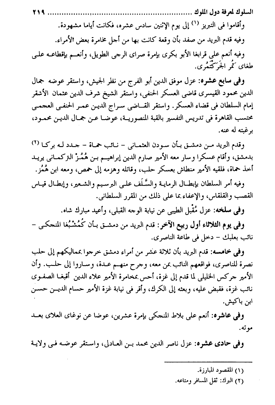 وَأَقَامُوا فِي التبريز إِلَى يَوْم الْإِثْنَيْنِ سادس عشره فَكَانَت أَيَّامًا مَشْهُودَة. وَفِيه قدم الْبَرِيد من صفد بِأَن وقْعَة كَانَت بهَا من أجل مخامرة بعض الْأُمَرَاء. وَفِيه أنعم على قرابغا الأبو بكري بإمرة صراي الرجي الطَّوِيل وأنعم بإقطاعه على طغايَ تمُر الجَرَكتمُرى. وَفِي سَابِع عشره: عزل موفق الدّين أَبُو الْفرج من نظر الْجَيْش وَاسْتقر عوضه جمال الدّين مَحْمُود القيسري قَاضِي الْعَسْكَر الْحَنَفِيّ وَاسْتقر الشَّيْخ شرف الدّين عُثْمَان الْأَشْقَر إِمَام السُّلْطَان فِي قَضَاء الْعَسْكَر. وَاسْتقر القَاضِي سراج الدّين عمر الْحَنَفِيّ العجمي محتسب الْقَاهِرَة فِي تدريس التَّفْسِير بالقبة المنصورية عوضا عَن جمال الدّين برغبته لَهُ عَنهُ. وَقدم الْبَرِيد من دمشق بِأَن سودن العثماني - نَائِب حماة - جدد لَهُ بركا بِدِمَشْق وَأقَام عسكرا وَسَار مَعَه الْأَمِير صارم الدّين إِبْرَاهِيم بن هُمُزْ التركماني يُرِيد أَخذ حماة فَلَقِيَهُ الْأَمِير منطاش بعسكر حلب وقاتله وهزمه إِلَى حمص وَمَعَهُ ابْن هُمُز. وَفِيه أَمر السُّلْطَان بِإِبْطَال الرماية والسلَف على البرسيم وَالشعِير وَإِبْطَال قِيَاس الفصب والقلقاس والإعفاء بِمَا على ذَلِك من الْمُقَرّر السلطاني. وَفِي سلخه: عزل مُقْبل الطَّيِّبِيّ عَن نِيَابَة الْوَجْه القبلي وأعيد مبارك شاه. وَفِي يَوْم الثُّلَاثَاء أول ربيع الآخر: قدم الْبَرِيد من دمشق بِأَن كُمُشْبُغا المنجكي - نَائِب بعلبك - دخل فِي طَاعَة الناصري. وَفِي خامسه: قدم الْبَرِيد بِأَن ثَلَاثَة عشر من أُمَرَاء دمشق خَرجُوا. بمماليكهم إِلَى حلب نصْرَة للناصري فواقعهم النَّائِب بِمن مَعَه وجرح مِنْهُم عدَّة وَسَارُوا إِلَى حلب. وَأَن الْأَمِير جركس الخليلي لما قدم إِلَى غَزَّة أحس. بمخامرة الْأَمِير عَلَاء الدّين أقبغا الصفوي نَائِب غَزَّة فَقبض عَلَيْهِ وَبَعثه إِلَى الكرك وَأقر فِي نِيَابَة غَزَّة الْأَمِير حسام الدّين حسن ابْن باكيش. وَفِي عاشره: أنعم على بلاط المنجكي بإمرة عشْرين عوضا عَن نوغاي العلاي بعد مَوته. وَفِي حادي عشره: عزل نَاصِر الدّين مُحَمَّد بن العادلي وَاسْتقر عوضه فِي ولَايَة