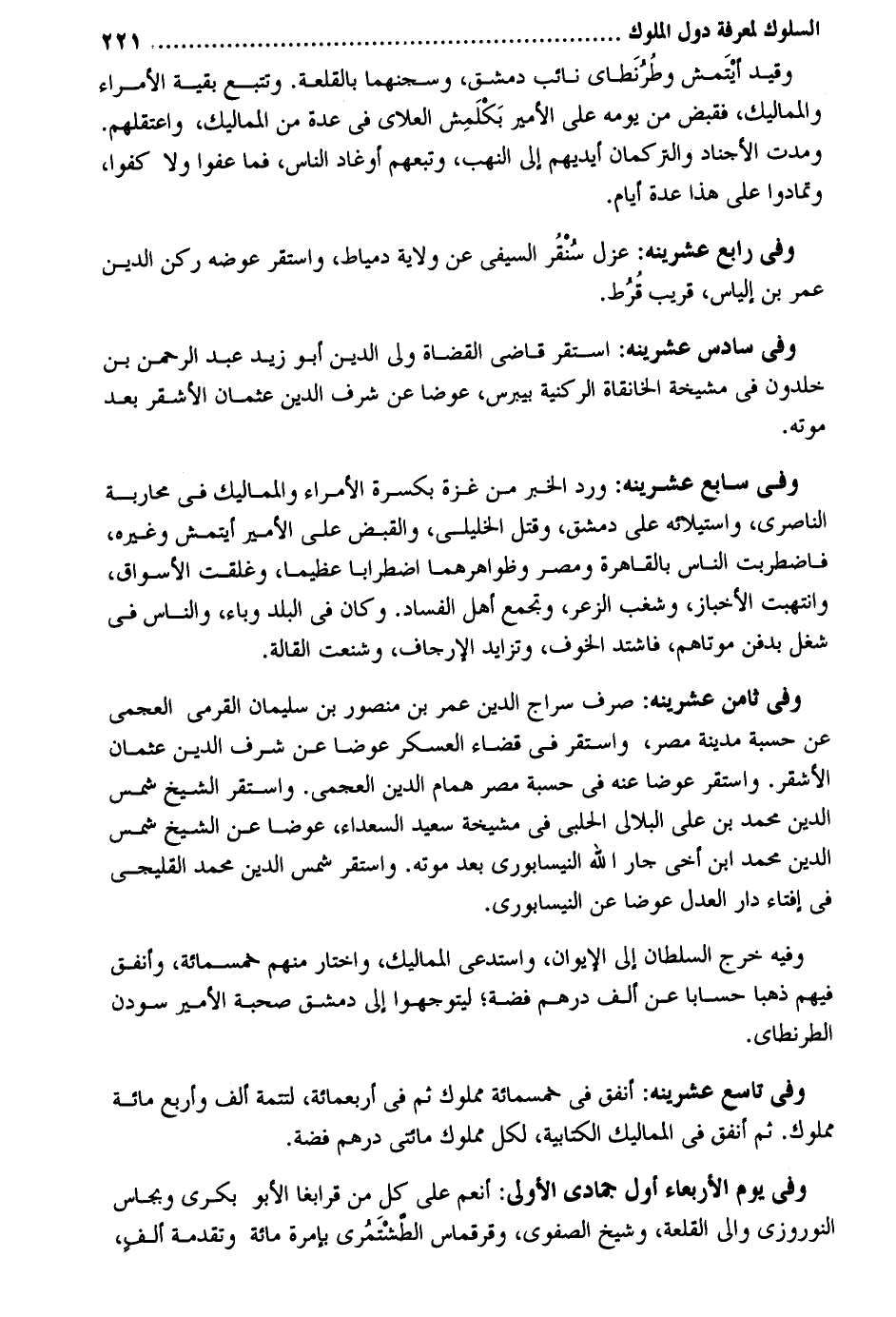 وَقيد أيْتَمش وطُرُنَطاي نَائِب دمشق وسجنهما بالقلعة. وتتبع بَقِيَّة الْأُمَرَاء والمماليك فَقبض من يَوْمه على الْأَمِير بَكلَمش العلاي فِي عدَّة من المماليك واعتقلهم. ومدت الأجناد والتركمان أَيْديهم إِلَى النهب وتبعهم أوغاد النَّاس فَمَا عفوا وَلَا كفوا وتمادوا على هَذَا عدَّة أَيَّام. وَفِي رَابِع عشرينه: عزل سُنْقُر السيفي عَن ولَايَة دمياط وَاسْتقر عوضه ركن الدّين عمر بن إلْيَاس قريب قُرُط. وَفِي سادس عشرينه: اسْتَقر قَاضِي الْقُضَاة ولي الدّين أَبُو زيد عبد الرَّحْمَن بن خلدون فِي مشيخة الخانقاة الركنية بيبرس عوضا عَن شرف الدّين عُثْمَان الْأَشْقَر بعد مَوته. وَفِي سَابِع عشرينه: ورد الْخَبَر من غَزَّة بكسرة الأسراء والممالك فِي محاربة الناصري واستيلائه على دمشق وَقتل الخليلي وَالْقَبْض على الْأَمِير أيتمش وَغَيره فاضطربت النَّاس بِالْقَاهِرَةِ ومصر وظواهرهما اضطرابا عَظِيما وغلقت الْأَسْوَاق وانتهبت الأخباز وشغب الزعر وَتجمع أهل الْفساد. وَكَانَ فِي الْبَلَد وباء وَالنَّاس فِي شغل بدفن موتاهم فَاشْتَدَّ الْخَوْف وتزايد الإرجاف وشنعت القالة. وَفِي ثامن عشرينه: صرف سراج الدّين عمر بن مَنْصُور بن سُلَيْمَان القرمي العجمي عَن حسبَة مَدِينَة مصر وَاسْتقر فِي قَضَاء الْعَسْكَر عوضا عَن شرف الدّين عُثْمَان الْأَشْقَر. اسْتَقر عوضا عَنهُ فِي حسبَة مصر همام الدّين العجمي. وَاسْتقر الشَّيْخ شمس الدّين مُحَمَّد بن عَليّ البلالي الْحلَبِي فِي مشيخة سعيد السُّعَدَاء عوضا عَن الشَّيْخ شمس الدّين مُحَمَّد ابْن أخي جَار الله النَّيْسَابُورِي بعد مَوته. وَاسْتقر شمس الدّين مُحَمَّد القليجي فِي إِفْتَاء دَار الْعدْل عوضا عَن النَّيْسَابُورِي. وَفِيه خرج السُّلْطَان إِلَى الإيوان واستدعى المماليك وَاخْتَارَ مِنْهُم خَمْسمِائَة وَأنْفق فيهم ذَهَبا حسابا عَن ألف دِرْهَم فضَّة ة ليتوجهوا إِلَى دمشق صُحْبَة الْأَمِير سودن الطرنطاي. وَفِي تَاسِع عشرينه: أنْفق فِي خَمْسمِائَة مَمْلُوك ثمَّ فِي أَرْبَعمِائَة لتتمة ألف وَأَرْبع مائَة مَمْلُوك. ثمَّ أنْفق فِي المماليك الْكِتَابِيَّة لكل مَمْلُوك مِائَتي دِرْهَم فضَّة. وَفِي يَوْم الْأَرْبَعَاء أول جُمَادَى الأولى: أنعم على كل من قرابغا الأبو بكري وبجاس النوروزي وَالِي القلعة وَشَيخ الصفوي وقرقماس الطشتمري بإمرة مائَة وتقدمة ألف