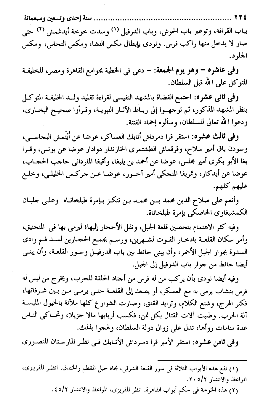 بياب القرافة وتوعير بَاب الحوش وَبَاب الدرفيل وسدت خوخة أيدغمش حَتَّى صَار لَا يدْخل مِنْهَا رَاكب فرس. وَنُودِيَ بِإِبْطَال مكس النشا ومكس النّحاس ومكس الْجُلُود. وَفِي عاشره - وَهُوَ يَوْم الْجُمُعَة: - دعى فِي الخطة بجوامع الْقَاهِرَة ومصر للخليفة المتَوَكل على الله قبل السُّلْطَان. وَفِي ثَانِي عشره: اجْتمع الْقُضَاة بالمشهد النفيسي لقِرَاءَة تَقْلِيد ولد الْخَلِيفَة المتَوَكل بِنَظَر المشهد الْمَذْكُور ثمَّ توجهوا إِلَى رِبَاط الْآثَار النَّبَوِيَّة وقرأوا صَحِيح البُخَارِيّ ودعوا الله تَعَالَى للسُّلْطَان وسألوه إخماد الْفِتْنَة. وَفِي ثَالِث عشره: اسْتَقر قرا دمرداش أتابك العساكر عوضا عَن أَيتَمش البجاسي وسودن بَاقٍ أَمِير سلَاح وقرقماش الطشتمري الخازندار دوادار عوضا عَن يُونُس وقرا بغا الأبو بكري أَمِير مجْلِس عوضا عَن أَحْمد بن يلبغا وأقبغا المارداني حَاجِب الْحجاب عوضا عَن أيدكار وتمربغا المنجكي أَمِير آخور عوضا عَن جركس الخليلي وخلع عَلَيْهِم كلهم. وأنعم على صَلَاح الدّين مُحَمَّد بن مُحَمَّد بن تنكز بإمرة طبلخاناه وعَلى جلبان الكمشبغاوي الخاصكي بإمرة طبلخاناة. وَفِيه كثر الاهتمام بتحصين قلعة الْجَبَل وَنقل الْأَحْجَار إِلَيْهَا ليرمى بهَا فِي المنجنيق وَأمر سكان القلعة بادخار الْقُوت لشهرين ورسم بِجمع الحجارين لسد فَم وَادي السِّدْرَة بجوار الْجَبَل الْأَحْمَر وَأَن يَبْنِي حَائِط بَين بَاب الدرفيل وسور القلعة وَأَن يبْنى أَيْضا حَائِط من جوَار بَاب الدرفيل إِلَى الْجَبَل. وَفِيه أَيْضا نُودي بِأَن يركب من لَهُ فرس من أجناد الْحلقَة للحرب وَيخرج من لَيْسَ لَهُ فرس بنشاب يَرْمِي بِهِ مَعَ الْعَسْكَر أَو يصعد إِلَى القلعة حَتَّى يَرْمِي من بَين شرفاتها فَكثر الْهَرج وشنع الْكَلَام وتزايد القلق وَصَارَت الشوارع كلهَا ملآنة بالخيول الملبسة آلَة الْحَرْب. وَطلبت آلَات الْقِتَال بِكُل ثمن فكسب أَرْبَابهَا مَالا جزيلا وتحاكى النَّاس عدَّة منامات روأها تدل على وَفِي ثامن عشره: اسْتَقر الْأَمِير قرا دمرداش الأتابك فِي نظر المارستان المنصوري