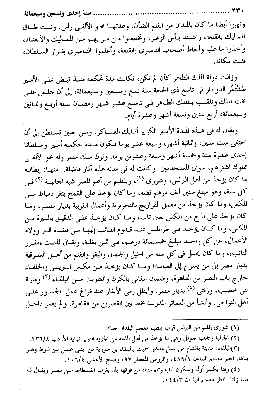 ونهبوا أَيْضا مَا كَانَ بالميدان من الْغنم الضَّأْن وعدتها نَحْو الألفي رَأس. وَنبت طباق المماليك بالقلعة وَاشْتَدَّ بَأْس الزعر وتخطفوا من مر بهم من المماليك والأجناد وَأخذُوا مَا عَلَيْهِ وأحاط أَصْحَاب الناصري بالقلعة وأعلموا الناصري بفرار السُّلْطَان فَثَبت مَكَانَهُ. وزالت دولة الْملك الظَّاهِر كَأَن لم تكن فَكَانَت مُدَّة تحكمه مُنْذُ قبض على الْأَمِير طَشْتَمُر الدوادار فِي تَاسِع ذِي الْحجَّة سنة تسع وَسبعين وَسَبْعمائة إِلَى أَن جلس على تخت الْملك وتلقب بِالْملكِ الظَّاهِر فِي تَاسِع عشر شهر رَمَضَان سنة أَربع وَثَمَانِينَ وَسَبْعمائة أَربع سِنِين وَتِسْعَة أشهر وَعشرَة أَيَّام. وَيُقَال لَهُ فِي هَذِه الْمدَّة الْأَمِير الْكَبِير أتابك العساكر. وَمن حِين تسلطن إِلَى أَن اختفي سِتّ سِنِين وَثَمَانِية أشهر وَسَبْعَة عشر يَوْمًا فَيكون مُدَّة حكمه أَمِيرا وسلطاناً إِحْدَى عشرَة سنة وَخَمْسَة أشهر وَسَبْعَة وَعشْرين يَوْمًا. وَترك ملك مصر وَله نَحْو الألفي مَمْلُوك اشتراهم سوى المستخدمين. وَكَانَت لَهُ فِي مدَّته هَذِه آثَار فاضلة مِنْهَا: إِبْطَاله مَا كَانَ يُؤْخَذ من أهل البرلس وشورى وبلطيم من أَعم الْمصر شبه الجالية فِي كل سنة وَهُوَ مبلغ سِتِّينَ ألف دِرْهَم فضَّة وَمَا كَانَ يُؤْخَذ على الْقَمْح بثغر دمياط من المكس وَمَا كَانَ يُؤْخَذ من معمل الفراريج بالنحريرية وأعمال الغربية بديار مصر وَمَا كَانَ يُؤْخَذ على الْملح من المكس بِعَين تَابَ وَمَا كَانَ يُؤْخَذ على الدَّقِيق بالبيرة من المكس وَمَا كَانَ يُؤْخَذ فِي طرابلس عِنْد قدوم النَّائِب إِلَيْهَا من قُضَاة الْبر وولاة الْأَعْمَال عَن كل وَاحِد مبلغ خَمْسمِائَة دِرْهَم فِي ثمن بغلة وَيُقَال لذَلِك مُقَرر النَّائِب وَمَا كَانَ يحمل فِي كل سنة من الْخَيل وَالْجمال وَالْبَقر وَالْغنم من أهل الشرقية بديار مصر إِلَى من يسرح إِلَى العباسة وَمَا كَانَ يُؤْخَذ من مكس الدريس والحلفاء خَارج بَاب النَّصْر من الْقَاهِرَة وَضَمان المغاني بالكرك والشوبك من البلقاء ومنية بني خصيب وزفتي بديار مصر. وأبطل رمي الأبقار عِنْد فرَاغ عمل الجسور على أهل النواحي. وَأَنْشَأَ من العمائر الْمدرسَة بِخَط بَين القصرين من الْقَاهِرَة. وَلم يعمر دَاخل