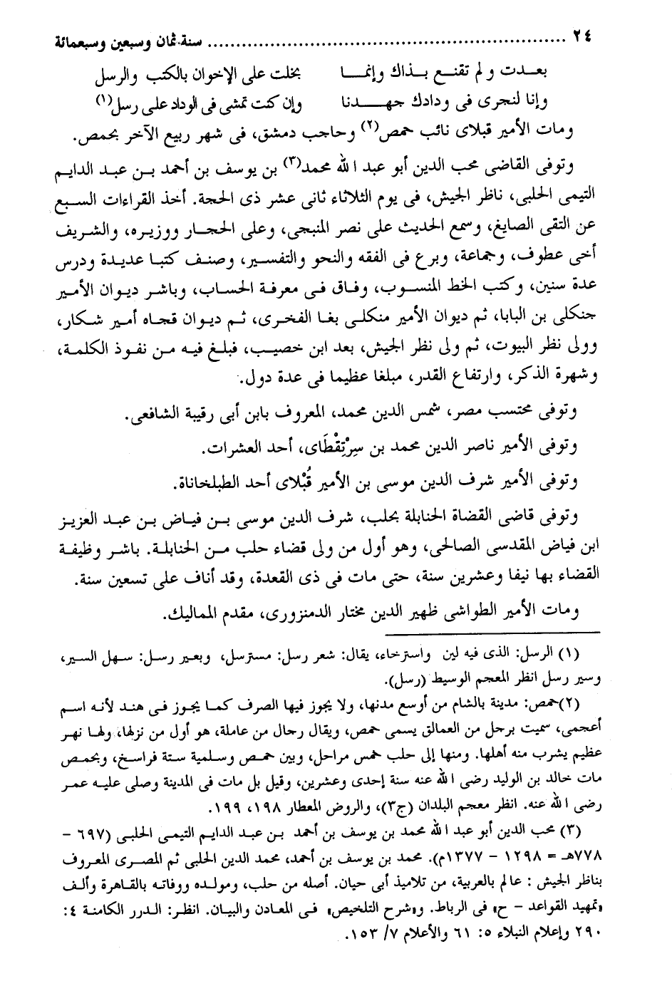 بَعدت وَلم تقنع بِذَاكَ وَإِنَّمَا بخلت على الإخوان بالكتب وَالرسل. وَإِنَّا لنجري فِي ودادك جهدنا وَإِن كنت تمشي فِي الوداد على رسل. وَمَات الْأَمِير قبلاي نَائِب حمص وحاجب دمشق فِي شهر ربيع الآخر بحمص. وَتُوفِّي القَاضِي محب الدّين أَبُو عبد الله مُحَمَّد بن يُوسُف بن أَحْمد بن عبد الدايم التَّيْمِيّ الْحلَبِي نَاظر الْجَيْش فِي يَوْم الثُّلَاثَاء ثَانِي عشر ذِي الْحجَّة. أَخذ الْقرَاءَات السَّبع عَن التقي الصايغ وَسمع الحَدِيث على نصر المنبجي وعَلى الْحجاز ووزيره والشريف أخى عطوف وَجَمَاعَة وبرع فِي الْفِقْه والنحو وَالتَّفْسِير وصنف كتبا عديدة ودرس عدَّة سِنِين وَكتب الْخط الْمَنْسُوب وفَاق فِي معرفَة الْحساب وباشر ديوَان الْأَمِير جنكلي بن البابا ثمَّ ديوَان الْأَمِير منكلي بغا الفخري ثمَّ ديوَان قجاه أَمِير شكار وَولي نظر الْبيُوت ثمَّ ولي نظر الْجَيْش بعد ابْن خصيب فَبلغ فِيهِ من نُفُوذ الْكَلِمَة وشهرة الذّكر وارتفاع الْقدر مبلغا عَظِيما فِي عدَّة دوَل. وَتُوفِّي محتسب مصر شمس الدّين مُحَمَّد الْمَعْرُوف بِابْن أبي رقيبة الشَّافِعِي. وَتُوفِّي الْأَمِير نَاصِر الدّين مُحَمَّد بن سرتقطاي أحد العشرات. وَتُوفِّي الْأَمِير شرف الدّين مُوسَى بن الْأَمِير قبلاى أحد الطبلخاناة. وَتُوفِّي قَاضِي الْقُضَاة الْحَنَابِلَة بحلب شرف الدّين مُوسَى بن فياض بن عبد الْعَزِيز بن فياض الْمَقْدِسِي الصَّالِحِي وَهُوَ أول من ولي قَضَاء حلب من الْحَنَابِلَة. بَاشر وَظِيفَة الْقَضَاء بهَا نيفا وَعشْرين سنة حَتَّى مَاتَ فِي ذِي الْقعدَة وَقد أناف على تسعين سنة. وَمَات الْأَمِير الطواشي ظهير الدّين مُخْتَار الدمنزوري مقدم المماليك.