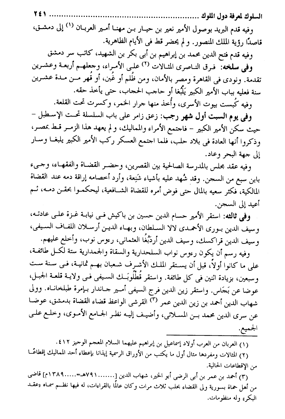 وَفِيه قدم الْبَرِيد بوصول الْأَمِير نعير بن حيار بن مهنا أَمِير العربان إِلَى دمشق قَاصِدا رُؤْيَة الْملك الْمَنْصُور. وَلم يحضر قطّ فِي الْأَيَّام الظَّاهِرِيَّة. وَفِيه قدم فتح الدّين مُحَمَّد بن إِبْرَاهِيم بن أبي بكر بن الشَّهِيد كَاتب سر دمشق. وَفِي سلخه: فرق الناصري المثالات على الْأُمَرَاء وجعلهم أَرْبَعَة وَعشْرين تقدمة. وَنُودِيَ فِي الْقَاهِرَة ومصر بالأمان وَمن ظُلم أَو غُبن أَو قُهر من مُدَّة عشْرين سنة فَعَلَيهِ بِبَاب الْأَمِير الْكَبِير يَلبغا أَو حَاجِب الْحجاب حَتَّى يَأْخُذ حَقه. وَفِيه كُبست بيُوت الأسرى وأُخذ مِنْهَا جرار الْخمر وَكسرت تَحت القلعة. وَفِي يَوْم السبت أول شهر رَجَب: زعق زامر على بَاب السلسلة تَحت الإسطبل - حَيْثُ سكن الْأَمِير الْكَبِير - فَاجْتمع الْأُمَرَاء والممالك وَلم يعْهَد هَذَا الزمر قطّ بِمصْر وَذكروا أَنَّهَا الْعَادة فِي بِلَاد وَفِيه عقد مجْلِس بِالْمَدْرَسَةِ الصالحية بَين القصرين وَحضر الْقُضَاة وَالْفُقَهَاء وَجِيء بِابْن سبع من السجْن. وَقد شُهد عَلَيْهِ بأَشْيَاء شَنِعة وأرد أخصامه إِرَاقَة دَمه عِنْد الْقُضَاة الْمَالِكِيَّة فَكثر سَعْيه بِالْمَالِ حَتَّى فوض أمره للقضاة الشَّافِعِيَّة ليحكموا بحقن دَمه ثمَّ أُعِيد إِلَى السجْن. وَفِي ثالثه: اسْتَقر الْأَمِير حسام الدّين حُسَيْن بن باكيش فِي نِيَابَة غَزَّة على عَادَته وَسيف الدّين بوري الأحمدي لالا السُّلْطَان وبهاء الدّين أرسلان اللفاف السيفي وَسيف الدّين قراكسك وَسيف الدّين أردبغُا العثماني رُؤُوس نوب وَا خلع عَلَيْهِم. وَفِيه رسم أَن يكون رُؤُوس نواب السلحدارية والسقاة والجمدارية سِتَّة لكل طَائِفَة على مَا كَانُوا أَولا قبل أَن يسْتَقرّ الْملك الْأَشْرَف شعْبَان بهم ثَمَانِيَة فِي سنة سِتّ وَسبعين بِزِيَادَة اثْنَيْنِ فِي كل طَائِفَة وَاسْتقر قُطْلُوبَك السيفي فِي ولَايَة قلعة الْجَبَل عوضا عَن بَجَاس. وَاسْتقر زين الدّين مْرج السيفي أَمِير جاندار بإمرة طبلخاناه. وَولى شهَاب الدّين أَحْمد بن زين الدّين عمر الْقرشِي الْوَاعِظ قَضَاء الْقُضَاة بِدِمَشْق عوضا عَن سري الدّين مُحَمَّد بن المسلاتي وأضيف إِلَيْهِ نظر الْجَامِع الْأمَوِي وخلع على الْجَمِيع.