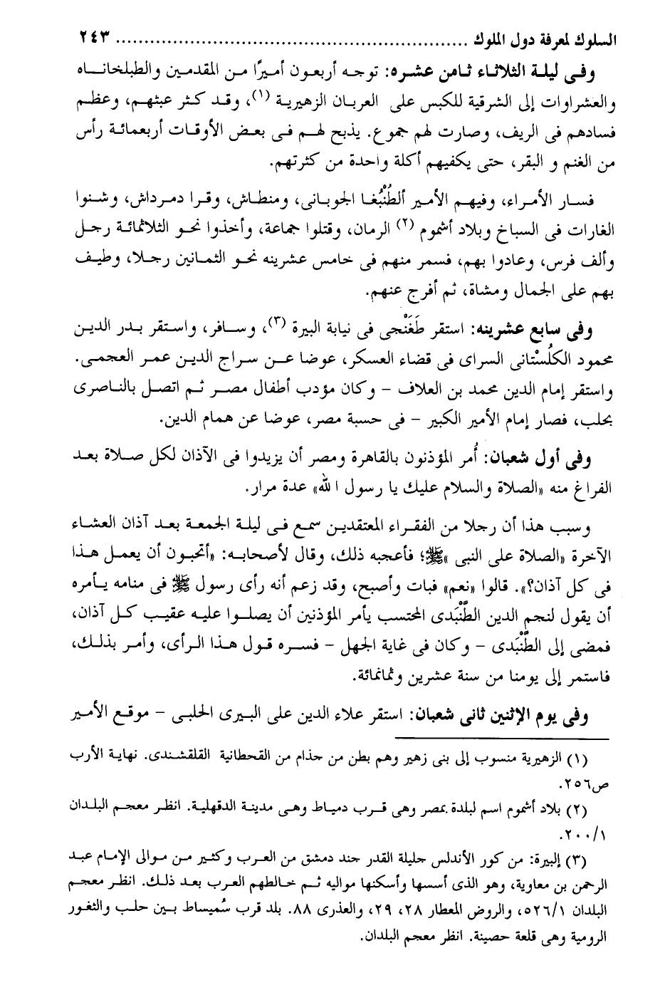 وَفِي لَيْلَة الثُّلَاثَاء ثامن عشره: توجه أَرْبَعُونَ أَمِيرا من المقدمين والطبلخاناه والعشراوات إِلَى الشرقية للكبس على العربان الزهيرية وَقد كثر عبثهم وَعظم فسادهم فِي الرِّيف وَصَارَت لَهُم جموع يذبح لَهُم فِي بعض الْأَوْقَات أَرْبَعمِائَة رَأس من الْغنم وَالْبَقر حَتَّى يكفيهم أَكلَة وَاحِدَة من كثرتهم. فَسَار الْأُمَرَاء وَفِيهِمْ الْأَمِير ألطُنْبُغا الجوماني ومنطاش وقرا دمرداش وشنوا الغارات فِي السباخ وبلاد أشموم الرُّمَّان وَقتلُوا جمَاعَة وَأخذُوا نَحْو الثلاثمائة رجل وَألف فرس وعادوا بهم فسمر مِنْهُم فِي خَامِس عشرينه نَحْو الثَّمَانِينَ رجلا وطيف بهم على الْجمال وَمُشَاة ثمَّ أفرج وَفِي سَابِع عشرينه: اسْتَقر طَغَنْجى فِي نِيَابَة البيرة وسافر وَاسْتقر بدر الدّين مَحْمُود الكلُسْتاني السراي فِي قَضَاء الْعَسْكَر عوضا عَن سراج الدّين عمر العجمي. وَاسْتقر إِمَام الدّين مُحَمَّد بن العلاف - وَكَانَ مؤدب أَطْفَال مصر ثمَّ اتَّصل بالناصري بحلب فَصَارَ إِمَام الْأَمِير الْكَبِير - فِي حسبَة مصر عوضا عَن همام الدّين. وَفِي أول شعْبَان: أُمر المؤذنون بِالْقَاهِرَةِ ومصر أَن يزِيدُوا فِي الآذان لكل صَلَاة بعد الْفَرَاغ مِنْهُ الصَّلَاة وَالسَّلَام عَلَيْك يَا رَسُول الله عدَّة مرار. وَسبب هَذَا أَن رجلا من الْفُقَرَاء المعتقدين جمع فِي لَيْلَة الْجُمُعَة بعد أَذَان الْعشَاء الْآخِرَة الصَّلَاة على النَّبِي صلى الله عَلَيْهِ وَسلم فأعجبه ذَلِك وَقَالَ لأَصْحَابه. أتحبون أَن يعْمل هَذَا فِي كل أَذَان. قَالُوا نعم فَبَاتَ وَأصْبح وَقد زعم أَنه رأى رَسُول صلى الله عَلَيْهِ وَسلم فِي مَنَامه يَأْمُرهُ أَن يَقُول لنجم الدّين الطنْبَدي الْمُحْتَسب بِأَمْر المؤذنين أَن يصلوا عَلَيْهِ عقيب كل أَذَان فَمضى إِلَى الطنبَدي - وَكَانَ فِي غَايَة الْجَهْل - فسره قَول هَذَا الرَّأْي وَأمر بذلك فاستمر إِلَى يَوْمنَا من سنة عشْرين وَثَمَانمِائَة. وَفِي يَوْم الِاثْنَيْنِ ثَانِي شعْبَان: اسْتَقر عَلَاء الدّين على البيري الْحلَبِي - موقع الْأَمِير