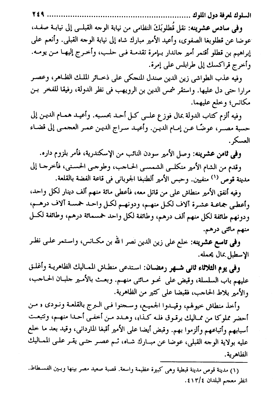 وفى سادس عشرينه: نقل قطلوبَكَ النظامي من نِيَابَة الْوَجْه القبلي إِلَى نِيَابَة صفد عوضا عَن قطلوبغا الصفوي وأعيد الْأَمِير مبارك شاه إِلَى نِيَابَة الْوَجْه القبلي. وأنعم على إِبْرَاهِيم بن قطلو أقتمر أَمِير جاندار بإمرة تقدمة فِي حلب وَأخرج إِلَيْهَا من يَوْمه. وَأخرج قراكسك إِلَى طرابلس على إمرة. وَفِيه عذب الطواشي زين الدّين صندل المنجكي على ذخائر الْملك الظَّاهِر وعصر مرَارًا حَتَّى دلّ عَلَيْهَا. وَاسْتقر شمس الدّين بن الرويهب فِي نظر الدولة رَفِيقًا للفخر بن مكانس وخلع عَلَيْهِمَا. وَفِيه ألزم كتاب الدولة بِمَال فوزع على كل أحد بِحَسبِهِ. وأعيد همام الدّين إِلَى حسبَة مصر عوضا عَن إِمَام الدّين وأعيد سراج الدّين عمر العجمي إِلَى قَضَاء الْعَسْكَر. وَفِي ثامن عشرينه: وصل الْأَمِير سودن النَّائِب من الْإسْكَنْدَريَّة فَأمر بِلُزُوم دَاره. وَقدم من الشَّام الْأَمِير منكلي الشمسي الحاحب وطوجي الحسني فأخرجا إِلَى مَدِينَة قوص منفيين. وَحبس الْأَمِير ألطنبغا الجوباني فِي قاعة الْفضة بالقلعة. وَفِيه أنْفق الْأَمِير منطاش على من قَاتل مَعَه فَأعْطى مائَة مِنْهُم ألف دِينَار لكل وَاحِد وَأعْطى جمَاعَة عشرَة آلَاف لكل مِنْهُم ودونهم لكل وَاحِد خَمْسَة آلَاف دِرْهَم ودونهم طَائِفَة لكل مِنْهُم ألف دِرْهَم وَطَائِفَة لكل وَاحِد خَمْسمِائَة دِرْهَم وَطَائِفَة لكل مِنْهُم مِائَتي دِرْهَم. وَفِي تَاسِع عشرينه: خلع على زين الدّين نصر الله بن مكانس وَاسْتمرّ على نظر الإسطبل. بِمَال يحملهُ. وَفِي يَوْم الثُّلَاثَاء ثَانِي شهر رَمَضَان: استدعى منطاش المماليك الظَّاهِرِيَّة وأغلق عَلَيْهِم بَاب السلسلة وَقبض على نَحْو مِائَتي مِنْهُم. وَبعث بالأمير جلبان الْحَاجِب والأمير بلاط الحاحب فقبضا على كثير من الظَّاهِرِيَّة. وَأخذ منطاش خيولهم وقيدوا الْجَمِيع وسجنوا فِي البرج بالقلعة وَنُودِيَ من أحضر مَمْلُوكا من مماليك برقوق فَلهُ كَذَا وهدد من أُخْفِي أحدا مِنْهُم وتتبعت أسبابهم وأتباعهم وألزموا بهم. وَقبض أَيْضا على الْأَمِير أقبغا المارداني وَقيد بعد مَا خلع عَلَيْهِ بِولَايَة الْوَجْه القبلي عوضا عَن مبارك شاه ثمَّ عصر حَتَّى يقر على المماليك الظَّاهِرِيَّة.