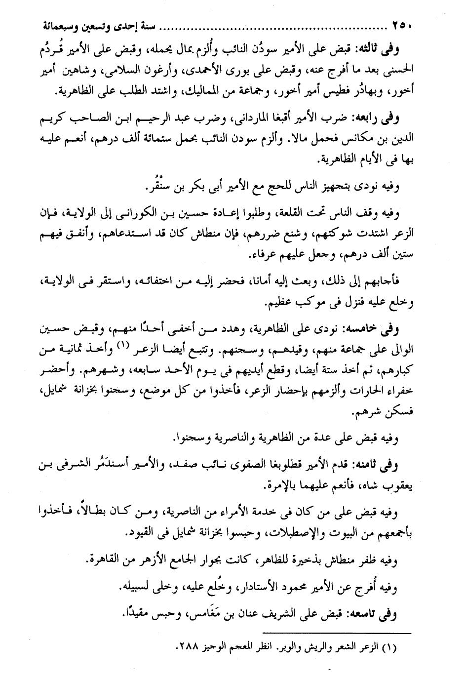 وَفِي ثالثه: قبض على الْأَمِير سودُن النَّائِب وأُلزم. ممال يحملهُ وَقبض على الْأَمِير تُردُم الحسني بعد مَا أفرج عَنهُ وَقبض على بوري الأحمدي وأرغون السلَامِي وشاهين أَمِير أخور وبهادر فطيس أَمِير أخور وَجَمَاعَة من المماليك وَاشْتَدَّ الطّلب على الظَّاهِرِيَّة. وَفِي رابعه: ضرب الْأَمِير أقبغا المارداني وَضرب عبد الرَّحِيم ابْن الصاحب كريم الدّين بن مكانس فَحمل مَالا. وألزم سودن النَّائِب بِحمْل سِتّمائَة ألف دِرْهَم أنعم عَلَيْهِ بهَا فِي الْأَيَّام الظَّاهِرِيَّة. وَفِيه نُودي بتجهيز النَّاس لِلْحَجِّ مَعَ الْأَمِير أبي بكر بن سنْقُر. وَفِيه وقف النَّاس تَحت القلعة وطلبوا إِعَادَة حُسَيْن بن الكوراني إِلَى الْولَايَة فَإِن الزعر اشتدت شوكتهم وشنع ضررهم فَإِن منطاش كَانَ قد استدعاهم وَأنْفق فيهم سِتِّينَ ألف دِرْهَم وَجعل عَلَيْهِم عرفاء. فأجابهم إِلَى ذَلِك وَبعث إِلَيْهِ أَمَانًا فَحَضَرَ إِلَيْهِ من اختفائه وَاسْتقر فِي الْولَايَة وخلع عَلَيْهِ فَنزل فِي موكب عَظِيم. وَفِي خامسه: نُودي على الظَّاهِرِيَّة وهدد من أُخْفِي أحدا مِنْهُم وَقبض حُسَيْن الْوَالِي على جمَاعَة مِنْهُم وقيدهم وسجنهم. وتتبع أَيْضا الزعر وَأخذ ثَمَانِيَة من كبارهم ثمَّ أَخذ سِتَّة أَيْضا وَقطع أَيْديهم فِي يَوْم الْأَحَد سابعه وشهرهم. وأحضر خفراء الحارات وألزمهم بإحضار الزعر فَأخذُوا من كل مَوضِع وسجنوا بخزانة شمايل فسكن شرهم. وَفِيه قبض على عدَّة من الظَّاهِرِيَّة والناصرية وسجنوا. وَفِي ثامنه: قدم الْأَمِير قطلوبغا الصفوي نَائِب صفد والأمير أسندَمُر الشرفي بن يَعْقُوب شاه فأنعم عَلَيْهِمَا بالإمرة. وَفِيه قبض على من كَانَ فِي خدمَة الْأُمَرَاء من الناصرية وَمن كَانَ بطالاً فَأخذُوا بأجمعهم من الْبيُوت والإصطبلات وحبسوا بخزانة شمايل فِي الْقُيُود. وَفِيه ظفر منطاش بذخيرة للظَّاهِر كَانَت بجوار الْجَامِع الْأَزْهَر من الْقَاهِرَة. وَفِيه أُفرج عَن الْأَمِير مَحْمُود الأستادار وخُلع عَلَيْهِ وخلى لسبيله. وَفِي تاسعه: قبض على الشريف عنان بن مَغَاس وَحبس مُقَيّدا.
