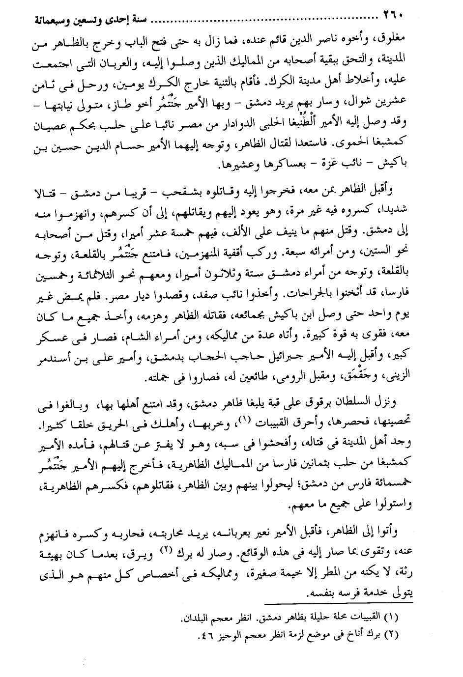 مغلوق وَأَخُوهُ نَاصِر الدّين قَائِم عِنْده فَمَا زَالَ بِهِ حَتَّى فتح الْبَاب وَخرج بِالظَّاهِرِ من الْمَدِينَة والتحق بِبَقِيَّة أَصْحَابه من المماليك الَّذين وصلوا اٍ ليه والعربان الَّتِى اجْتمعت عَلَيْهِ وأخلاط أهل مَدِينَة الكرك. فَأَقَامَ بالثنية خَارج الكرك يَوْمَيْنِ ورحل فِي ثامن عشْرين شَوَّال وَسَار بهم يُرِيد دمشق - وَبهَا الْأَمِير جَنتمُر أَخُو طاز مُتَوَلِّي نيابتها - وَقد وصل إِلَيْهِ الْأَمِير ألْطُنْبغا الْحلَبِي الدوادار من مصر نَائِبا على حلب بِحكم عصيان كمشبغا الْحَمَوِيّ. فاستعدا لقِتَال الظَّاهِر وَتوجه إِلَيْهِمَا الْأَمِير حسام الدّين حُسَيْن بن باكيش - نَائِب غَزَّة - بعساكرها وعشيرها. وَأَقْبل الظَّاهِر. مِمَّن مَعَه فَخَرجُوا إِلَيْهِ وقاتلوه بشقحب - قَرِيبا من دمشق - قتالاً شَدِيدا كسروه فِيهِ غير مرّة وَهُوَ يعود إِلَيْهِم ويقاتلهم إِلَى أَن كسرهم وانهزموا مِنْهُ إِلَى دمشق. وَقتل مِنْهُم مَا ينيف على الْألف فيهم خَمْسَة عشر أَمِيرا وَقتل من أَصْحَابه نَحْو السِّتين وَمن أمرائه سَبْعَة. وَركب اً قفية المنهزمين فَامْتنعَ جَنتمُر بالقلعة وَتوجه بالقلعة وَتوجه من أُمَرَاء دمشق سِتَّة وَثَلَاثُونَ أَمِيرا وَمَعَهُمْ نَحْو الثلاثمائة وَخمسين فَارِسًا قد أثخنوا بالجراحات. وَأخذُوا نَائِب صفد وقصدوا ديار مصر. فَلم يمض غير يَوْم وَاحِد حَتَّى وصل ابْن باكيش بجمائعه فقاتله الظَّاهِر وهزمه وَأخذ جَمِيع مَا كَانَ مَعَه فقوي بِهِ قُوَّة كَبِيرَة. وَأَتَاهُ عدَّة من مماليكه وَمن أُمَرَاء الشَّام فَصَارَ فِي عَسْكَر كَبِير وَأَقْبل إِلَيْهِ الْأَمِير جِبْرَائِيل حَاجِب الْحجاب بِدِمَشْق وأمير عَليّ بن وَنزل السُّلْطَان بوقوق على قبَّة يلبغا ظَاهر دمشق وَقد امْتنع أَهلهَا بهَا وبالغوا فِي تحصينها فحصرها وأحرق القبيبات وخربها وَأهْلك فِي الْحَرِيق خلقا كثيرا وجد أهل الْمَدِينَة فِي قِتَاله وأفحشوا فِي سبه وَهُوَ لَا يفتر عَن قِتَالهمْ فأمده الْأَمِير كمشبغا من حلب بِثَمَانِينَ فَارِسًا من المماليك الظَّاهِرِيَّة فَأخْرج إِلَيْهِم الْأَمِير جَنتمُر خَمْسمِائَة فَارس من دمشق ليحولوا بَينهم وَبَين الظَّاهِر فقاتلوهم فكسرهم الظَّاهِرِيَّة واستولوا على جَمِيع مَا مَعَهم. وَأتوا إِلَى الظَّاهِر فَأقبل الْأَمِير نعير بعربانه يُرِيد محاربته فحاربه وكسره فَانْهَزَمَ عَنهُ وتقوى. مِمَّا صَار إِلَيْهِ فِي هَذِه الوقائع. وَصَارَ لَهُ برك ويرق بَعْدَمَا كَانَ بهيئة رثَّة لَا يكنه من الْمَطَر إِلَّا خيمة صَغِيرَة ومماليكه فِي أخصاص كل مِنْهُم هُوَ الذى يتَوَلَّى خدمَة فرسه بِنَفسِهِ.