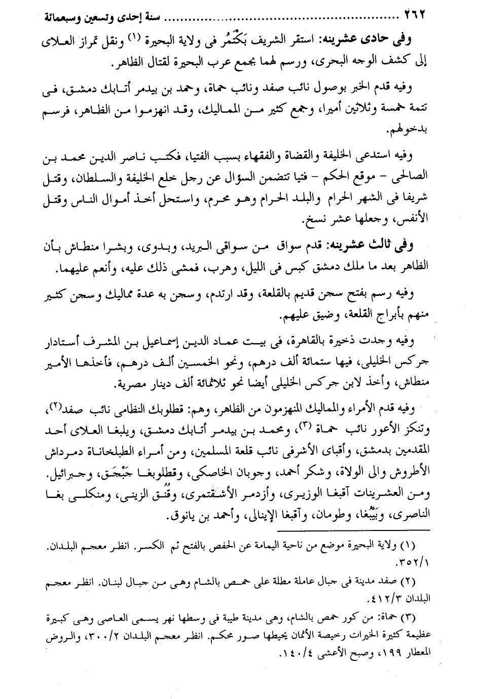 وَفِي حادي عشرينه: اسْتَقر الشريف بَكتمُر فِي ولَايَة البحرة وَنقل تمراز العلاي إِلَى كشف الْوَجْه البحري ورسم لَهما بِجمع عرب الْبحيرَة لقِتَال الظَّاهِر. وَفِيه قدم الْخَبَر بوصول نَائِب صفد ونائب حماة وَحمد بن بيدمر أتابك دمشق فِي تَتِمَّة خَمْسَة وَثَلَاثِينَ أَمِيرا وَجمع كثير من المماليك وَقد انْهَزمُوا من الظَّاهِر فرسم بدخولهم. وَفِيه استدعى الْخَلِيفَة والقضاة وَالْفُقَهَاء بِسَبَب الْفتيا فَكتب نَاصِر الدّين مُحَمَّد بن الصَّالِحِي - موقع الحكم - فتيا تَتَضَمَّن السُّؤَال عَن رجل خلع الْخَلِيفَة وَالسُّلْطَان وَقتل شريفاً فِي الشَّهْر الْحَرَام والبلد الْحَرَام وَهُوَ محرم واستحل أَخذ أَمْوَال النَّاس وَقتل الْأَنْفس وَجعلهَا عشر نسخ. وَفِي ثَالِث عشرينه: قدم سواق من سواقي الْبَرِيد وبدوي وبشرا منطاش بِأَن الظَّاهِر بعد مَا ملك دمشق كبس فِي اللَّيْل وهرب فَمشى ذَلِك عَلَيْهِ وأنعم عَلَيْهِمَا. وَفِيه رسم بِفَتْح سجن قديم بالقلعة وَقد ارتدم وسجن بِهِ عدَّة مماليك وسجن كثير مِنْهُم بأبراج القلعة وضيق عَلَيْهِم. وَفِيه وجدت ذخيرة بِالْقَاهِرَةِ فِي بَيت عماد الدّين إِسْمَاعِيل بن المشرف أستادار جركس الخليلي فِيهَا سِتّمائَة ألف دِرْهَم وَنَحْو الْخمسين ألف دِرْهَم فَأَخذهَا الْأَمِير منطاش وَأخذ وَفِيه قدم الْأُمَرَاء والمماليك المنهزمون من الظَّاهِر وهم: قطلوبك النظامي نَائِب صفد وتنكز الْأَعْوَر نَائِب حماة وَمُحَمّد بن بيدمر أتابك دمشق ويلبغا العلاي أحد المقدمين بِدِمَشْق وأقباي الأشرفي نَائِب قلعة الْمُسلمين وَمن أُمَرَاء الطبلخاناة دمرداش الأطروش وَالِي الْوُلَاة وشكر اً حمد وجوبان الخاصكي وقطلوبغا جَبْجَق وجبرائيل. وَمن العشرينات أقبغا الوزيري وأزدمر الأشقَتمري وقُنُق الزيني ومنكلي بغا الناصري وبَمبغا وطومان وأقبغا الإينالي وَأحمد بن يانوق.