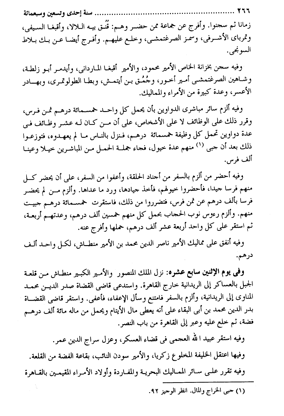 زَمَانا ثمَّ سجنوا. وَأَفْرج عَن جمَاعَة مِمَّن حضر وهم: قُنُق بيه اللالا وأقبغا السيفي وتمرباي الأشرفي وَعز الصرغتمشي وخلع عَلَيْهِم. وَأَفْرج أَيْضا عَن بك بلاط السونجي. وَفِيه سجن بخزانة الْخَاص الْأَمِير مَحْمُود والأمير أقبغا المارداني وأيدمر أَبُو زلطة وشاهين الصرغتمشي أَمِير أخور وجُمُق بن أيتمش وبطا الطولوتمرى وبهادر الأعسر وعدة كَبِيرَة من الْأُمَرَاء والمماليك. وَفِيه ألزم سَائِر مباشري الدَّوَاوِين بِأَن يحمل كل وَاحِد خَمْسمِائَة دِرْهَم ثمن فرس وَقرر ذَلِك على الْوَظَائِف لَا على الْأَشْخَاص على أَن من كَانَ لَهُ عشر وظائف فِي عدَّة دواوين تحمل كل وَظِيفَة خَمْسمِائَة دِرْهَم فَنزل بِالنَّاسِ مَا لم يعهدوه فتوزعوا ذَلِك بعد أَن جبى مِنْهُم عدَّة خُيُول فجَاء جملَة الْحمل من المباشرين خيلاً وعينا ألف فرس. وَفِيه أحضر من ألزم بِالسَّفرِ من أجناد الْحلقَة وأعفوا من السّفر على أَن يحضر كل مِنْهُم فرسا جيدا فأحضروا خيولهم فَأخذ جيادها ورد مَا عَداهَا. وألزم من لم يحضر فرسا بِأَلف دِرْهَم عَن ثمن فرس فتضرروا من ذَلِك فاستقرت خَمْسمِائَة دِرْهَم جبيت مِنْهُم. وألزم رُؤُوس نوب الْحجاب بِحمْل كل مِنْهُم خمسين ألف دِرْهَم وعدتهم أَرْبَعَة ثمَّ اسْتَقر على كل وَاحِد أَرْبَعَة عشر ألف دِرْهَم حملهَا وَأَفْرج عَنهُ. وَفِيه أنْفق على مماليك الْأَمِير نَاصِر الدّين مُحَمَّد بن الْأَمِير منطاش لكل وَاحِد ألف دِرْهَم. وَفِي يَوْم الِاثْنَيْنِ سَابِع عشره: نزل الْملك الْمَنْصُور والأمير الْكَبِير منطاش من قلعة الْجَبَل بالعساكر إِلَى الريدانية خَارج الْقَاهِرَة. واستدعى قَاضِي الْقُضَاة صدر الدّين مُحَمَّد الْمَنَاوِيّ إِلَى الريدانية وألزم بِالسَّفرِ فَامْتنعَ وَسَأَلَ الإعفاء فأعفى. وَاسْتقر قَاضِي الْقُضَاة بدر الدّين مُحَمَّد بن أبي الْبَقَاء على أَنه يعْطى مَال الْأَيْتَام وَيحمل من مَاله مائَة ألف دِرْهَم فضَّة ثمَّ خلع عَلَيْهِ وَعبر إِلَى الْقَاهِرَة من بَاب النَّصْر. وَفِيه اسْتَقر عبيد الله العجمي فِي قَضَاء الْعَسْكَر وعزل سراج الدّين عمر. وفيهَا اعتقل الْخَلِيفَة المخلوع زَكَرِيَّا والأمير سودن النَّائِب بقاعة الْفضة من القلعة. وَفِيه تقرر على سَائِر المماليك البحرية والمفاردة وَأَوْلَاد الْأُمَرَاء المقيمين بِالْقَاهِرَةِ