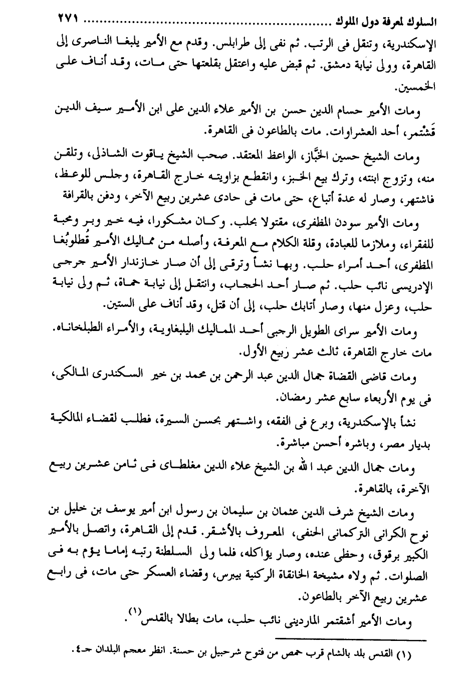 الْإسْكَنْدَريَّة وتنقل فِي الرتب. ثمَّ نفي إِلَى طرابلس. وَقدم مَعَ الْأَمِير يلبغا الناصري إِلَى الْقَاهِرَة وَولى نِيَابَة دمشق. ثمَّ قبض عَلَيْهِ واعتقل بقلعتها حَتَّى مَاتَ وَقد أناف على الْخمسين. وَمَات الْأَمِير حسام الدّين حسن بن الْأَمِير عَلَاء الدّين على ابْن الْأَمِير سيف الدّين قَشْتمر أحد العشراوات. مَاتَ بالطاعون فِي الْقَاهِرَة. وَمَات الشَّيْخ حُسَيْن الخبَّاز الْوَاعِظ المعتقد. صحب الشَّيْخ ياقوت الشاذلي وتلقن مِنْهُ وَتزَوج ابْنَته وَترك بيع الْخبز وَانْقطع بزاويته خَارج الْقَاهِرَة وَجلسَ للوعظ فاشتهر وَصَارَ لَهُ عدَّة أَتبَاع حَتَّى مَاتَ فِي حادي عشْرين ربيع الآخر وَدفن بالقرافة وَمَات الْأَمِير سودن المظفري مقتولاً بحلب. وَكَانَ مشكوراً فِيهِ خير وبر ومحبة للْفُقَرَاء وملازماً لِلْعِبَادَةِ وَقلة الْكَلَام مَعَ الْمعرفَة وَأَصله من مماليك الْأَمِير قُطلوبُغا المظفري أحد أُمَرَاء حلب. وَبهَا نَشأ وترقى إِلَى أَن صَار خازندار الْأَمِير جرجي الإدريسى نَائِب حلب. ثمَّ صَار أحد الْحجاب وانتقل إِلَى نِيَابَة حماة ثمَّ ولي نِيَابَة حلب وعزل مِنْهَا وَصَارَ أتابك حلب إِلَى أَن قتل وَقد أناف على السِّتين. وَمَات الْأَمِير سراي الطَّوِيل الرَّحبِي أحد المماليك اليلبغاوية والأمراء الطبلخاناه. مَاتَ خَارج الْقَاهِرَة ثَالِث عشر ربيع الأول. وَمَات قَاضِي الْقُضَاة جمال الدّين عبد الرَّحْمَن بن مُحَمَّد بن خير الإسكندري الْمَالِكِي فِي يَوْم الْأَرْبَعَاء سَابِع عشر رَمَضَان. نَشأ بالإسكندرية وبرع فِي الْفِقْه واشتهر بِحسن السِّيرَة فَطلب لقَضَاء الْمَالِكِيَّة بديار مصر وباشره أحسن مُبَاشرَة. وَمَات جمال الدّين عبد الله بن الشَّيْخ عَلَاء الدّين مغلطاي فِي ثامن عشْرين ربيع الْآخِرَة بِالْقَاهِرَةِ. وَمَات الشَّيْخ شرف الدّين عُثْمَان بن سُلَيْمَان بن رَسُول ابْن أَمِير يُوسُف بن خَلِيل بن نوح الكراني التركماني الْحَنَفِيّ الْمَعْرُوف بالأشقر. قدم إِلَى الْقَاهِرَة واتصل بالأمير الْكَبِير برقوق وحظي عِنْده وَصَارَ يؤاكله فَلَمَّا ولي السلطنة رتبه إِمَامًا يؤم بِهِ فِي الصَّلَوَات. ثمَّ ولاه مشيخة الخانقاة الركنية بيبرس وَقَضَاء الْعَسْكَر حَتَّى مَاتَ فِي رَابِع عضرين ربيع الآخر بالطاعون. وَمَات الْأَمِير أشقتمر المارديني نَائِب حلب مَاتَ بطالاً بالقدس.