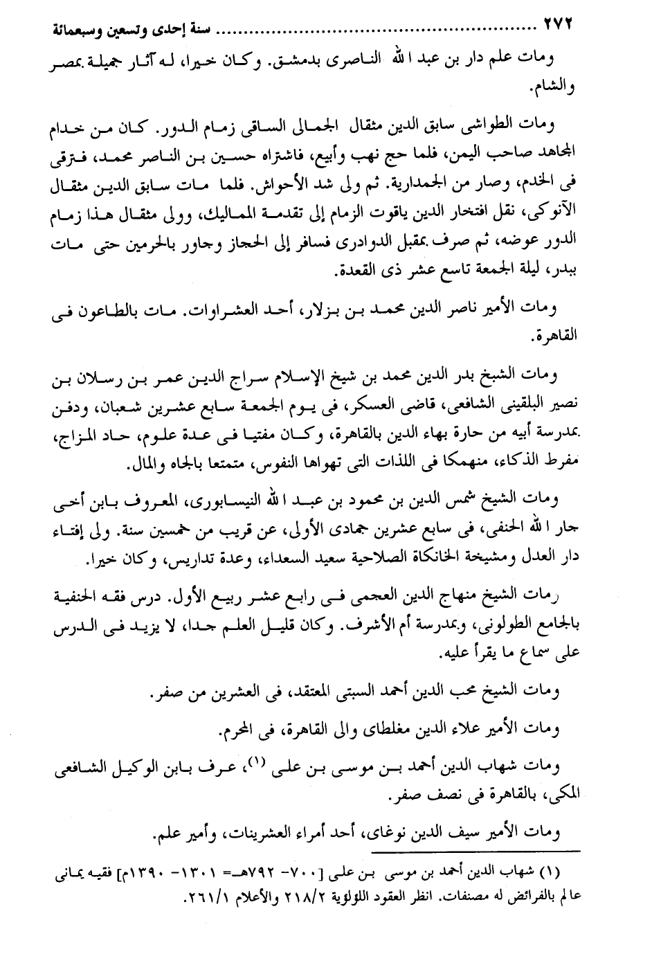 وَمَات علم دَار بن عبد الله الناصري بِدِمَشْق. وَكَانَ خيرا لَهُ مثار جميلَة بِمصْر وَالشَّام. وَمَات الطواشي سَابق الدّين مِثْقَال الجمالي الساقي زِمَام الدّور. كَانَ من خدام الْمُجَاهِد صَاحب الْيمن فَلَمَّا حج نهب وأبيع فَاشْتَرَاهُ حُسَيْن بن النَّاصِر مُحَمَّد فترقى فِي الخدم وَصَارَ من الجمدارية. ثمَّ ولى شدّ الأحواش. فَلَمَّا مَاتَ سَابق الدّين مِثْقَال الآنوكي نقل افتخار الدّين ياقوت الزِّمَام إِلَى تقدمة المماليك وَولى مِثْقَال هَذَا زِمَام الدّور عوضه ثمَّ صرف بمقبل الدوادري فسافر إِلَى الْحجاز وجاور بالحرمين حَتَّى مَاتَ ببدر لَيْلَة الْجُمُعَة تَاسِع عشر ذِي الْقعدَة. وَمَات الْأَمِير نَاصِر الدّين مُحَمَّد بن بزلار أحد العشراوات. مَاتَ بالطاعون فِي الْقَاهِرَة. وَمَات الشَّيْخ بدر الدّين مُحَمَّد بن شيخ الْإِسْلَام سراج الدّين عمر بن رسْلَان بن نصير البُلْقِينِيّ الشَّافِعِي قَاضِي الْعَسْكَر فِي يَوْم الْجُمُعَة سَابِع عشْرين شعْبَان وَدفن بمدرسة أَبِيه من حارة بهاء الدّين بِالْقَاهِرَةِ وَكَانَ مفتياً فِي عدَّة عُلُوم حاد المزاج مفرط الذكاء منهمكاً فِي اللَّذَّات الَّتِي تهواها النُّفُوس مُتَمَتِّعا بالجاه وَالْمَال. وَمَات الشَّيْخ شمس الدّين بن مَحْمُود بن عبد الله النَّيْسَابُورِي الْمَعْرُوف بِابْن أخي جَار الله الْحَنَفِيّ فِي سَابِع عشْرين جُمَادَى الأولى عَن قريب من خمسين سنة. ولي إِفْتَاء دَار الْعدْل ومشيخة الخانكاة الصلاحية سعيد السُّعَدَاء وعدة تداريس وَكَانَ خيرا. وَمَات الشَّيْخ منهاج الدّين العجمي فِي رَابِع عشر ربيع الأول. درس فقه الْحَنَفِيَّة بالجامع الطولوني وبمدرسة أم الْأَشْرَف. وَكَانَ قَلِيل الْعلم جدا لَا يزِيد فِي الدَّرْس على سَماع مَا يقْرَأ عَلَيْهِ. وَمَات الشَّيْخ محب الدّين أَحْمد السبتي المعتقد فِي الْعشْرين من صفر. وَمَات الْأَمِير عَلَاء الدّين مغلطاي وَالِي الْقَاهِرَة فِي الْمحرم. وَمَات شهَاب الدّين أَحْمد بن مُوسَى بن عَليّ عرف بِابْن الْوَكِيل الشَّافِعِي الْمَكِّيّ بِالْقَاهِرَةِ فِي نصف صفر. وَمَات الْأَمِير سيف الدّين نوغاي أحد أُمَرَاء العشرينات وأمير علم.