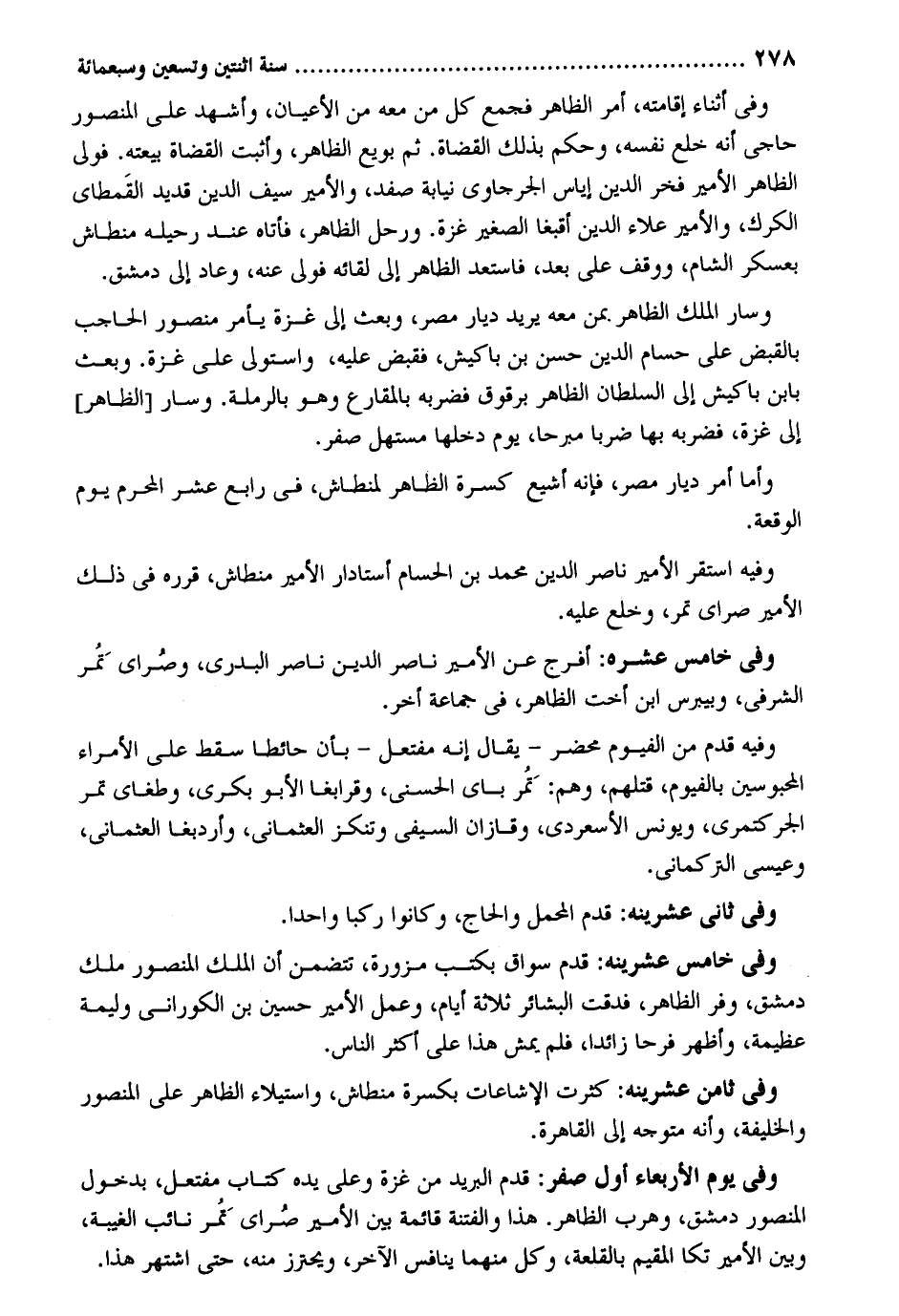 وَفِي أثْنَاء إِقَامَته أَمر الظَّاهِر فَجمع كل من مَعَه من الْأَعْيَان وَأشْهد على الْمَنْصُور حاجي أَنه خلع نَفسه وَحكم بِتِلْكَ الْقُضَاة. ثمَّ بُويِعَ الظَّاهِر وَأثبت الْقُضَاة بيعَته. فولى الظَّاهِر الْأَمِير فَخر الدّين إِيَاس الجرجاوي نِيَابَة صفد والأمير سيف الدّين قديد القَمطاي الكرك والأمير عَلَاء الدّين أقبغا الصَّغِير غَزَّة. ورحل الظَّاهِر فَأَتَاهُ عِنْد رحيله منطاش بعسكر الشَّام ووقف على بعد فاستعد الظَّاهِر إِلَى لِقَائِه فولى عَنهُ وَعَاد إِلَى دمشق. وَسَار الْملك الظَّاهِر عَن مَعَه يُرِيد ديار مصر وَبعث إِلَى غَزَّة يَأْمر مَنْصُور الْحَاجِب بِالْقَبْضِ على حسام الدّين حسن بن باكيش فَقبض عَلَيْهِ وَاسْتولى على غَزَّة. وَبعث بِابْن باكيش إِلَى السُّلْطَان الظَّاهِر برقوق فَضَربهُ بالمقارع وَهُوَ بالرملة. وَسَار الظَّاهِر إِلَى غَزَّة فَضَربهُ بهَا ضربا مبرحاً يَوْم دَخلهَا مستهل صفر. وَأما أَمر ديار مصر فَإِنَّهُ أشيع كسرة الظَّاهِر لمنطاش فِي رَابِع عشر الْمحرم يَوْم الْوَقْعَة. وَفِيه اسْتَقر الْأَمِير نَاصِر الدّين مُحَمَّد بن الحسام أستادار الْأَمِير منطاش قَرَّرَهُ فِي ذَلِك الْأَمِير صراي تمر وخلع عَلَيْهِ. وَفِي خَامِس عشره: أفرج عَن الْأَمِير نَاصِر الدّين نَاصِر البدري وصُراي تمُر الشرفي وبييرس ابْن أُخْت الظَّاهِر فِي جمَاعَة أخر. وَفِيه قدم من الفيوم محْضر - يُقَال إِنَّه مفتَعل - بِأَن حَائِطا سقط على الْأُمَرَاء المحبوسين بالفيوم فَقَتلهُمْ وهم: تمُر باي الحسني وقرابغا الأبو بكري وطغاي تمر الجركتمري وَيُونُس الأسعردي وقازان السيفي وتنكز العثماني وأردبغا العثماني وَعِيسَى التركماني. وَفِي ثَانِي عشرينه: قدم الْمحمل والحاج وَكَانُوا ركباً وَاحِدًا. وَفِي خَامِس عشرينه: قدم سواق بكتب مزورة تَتَضَمَّن أَن الْملك الْمَنْصُور ملك دمشق وفر الظَّاهِر فدقت البشائر ثَلَاثَة أَيَّام وَعمل الْأَمِير حُسَيْن بن الكوراني وَلِيمَة عَظِيمَة وَأظْهر فَرحا زَائِدا فَلم يمش هَذَا على أَكثر النَّاس. وَفِي ثامن عشرينه: كثرت الإشاعات بكسرة منطاش واستيلاء الظَّاهِر على الْمَنْصُور والخليفة وَأَنه مُتَوَجّه إِلَى الْقَاهِرَة. وَفِي يَوْم الْأَرْبَعَاء أول صفر: قدم الْبَرِيد من غَزَّة وعَلى يَده كتاب مفتعل بِدُخُول الْمَنْصُور دمشق وهرب الظَّاهِر. هَذَا والفتنة قَائِمَة بَين الْأَمِير صُراي تمُر نَائِب الْغَيْبَة وَبَين الْأَمِير تكا الْمُقِيم بالقلعة وكل مِنْهُمَا ينافس الآخر ويحترز مِنْهُ حَتَّى اشْتهر هَذَا.