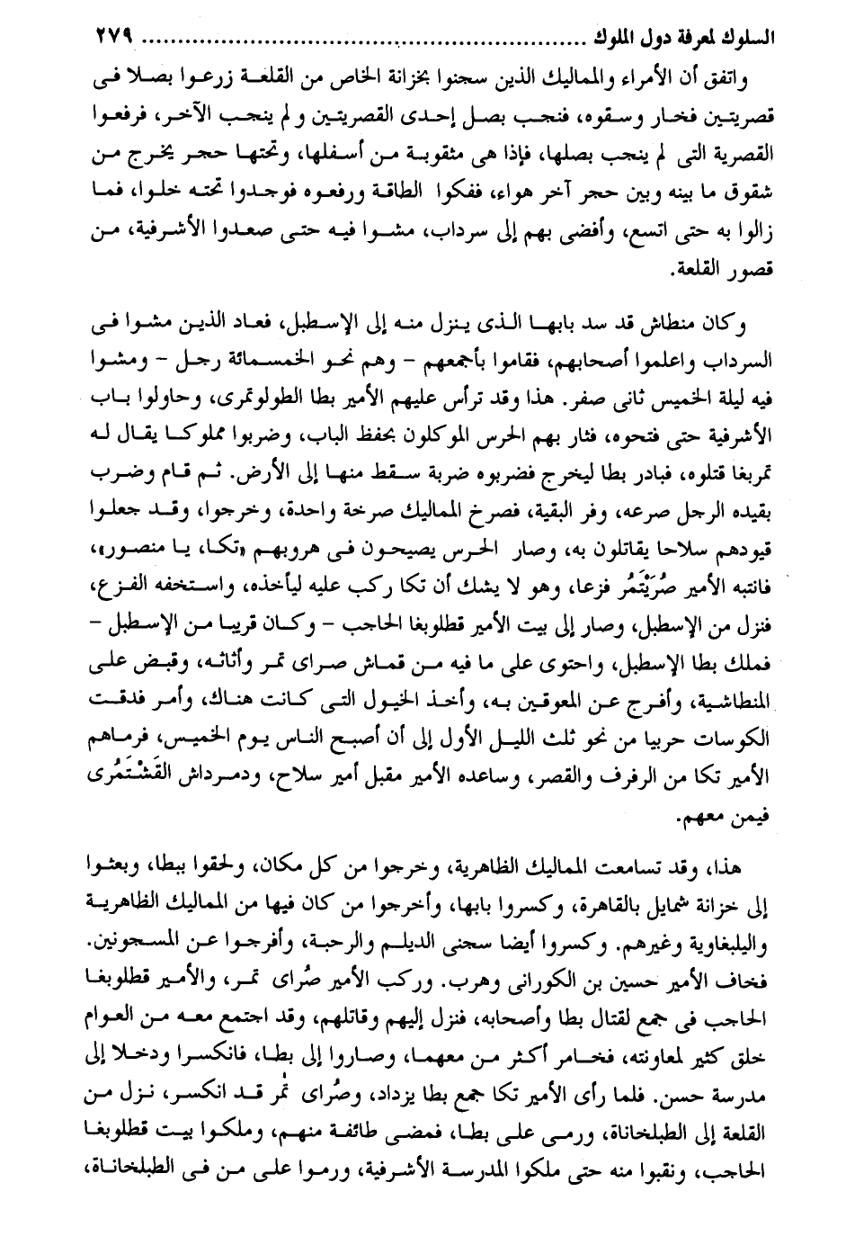 وَاتفقَ أَن الْأُمَرَاء والمماليك الَّذين سجنوا بخزانة الْخَاص من القلعة زرعوا بصلاً فِي قصريتين فخار وسقوه فنجب بصل إِحْدَى القصريتين وَلم ينحب الآخر فَرفعُوا القصرية الَّتِي لم ينحب بصلها فَإِذا هِيَ مثقوبة من أَسْفَلهَا وتحتها حجر يخرج من شقوق مَا بَينه وَبَين حجر آخر هَوَاء ففكوا الطَّاقَة ورفعوه فوجدوا تحتَه خلوا فَمَا زَالُوا حَتَّى اتَّسع وأفضى بهم إِلَى سرداب مَشوا فِيهِ حَتَّى صعدوا الأشرفية من القلعة. وَكَانَ منطاش قد سد بَابهَا الَّذِي ينزل مِنْهُ إِلَى الإسطبل فَعَاد الَّذين مَشوا فِي السرادب وأعلموا أَصْحَابهم فَقَامُوا بأجمعهم - وهم نَحْو الْخَمْسمِائَةِ رجل - وَمَشوا فِيهِ لَيْلَة الْخَمِيس ثَانِي صفر. هَذَا وَقد ترأس عَلَيْهِم الْأَمِير بطا الطولوتمري وحاولوا بَاب الأشرفية حَتَّى فتحوه فثار بهم الحرس الموكلون بِحِفْظ الْبَاب وضربوا مَمْلُوكا يُقَال لَهُ تمربغا قَتَلُوهُ فبادر بطا ليخرج فضربوه ضَرْبَة سقط مِنْهَا إِلَى الأَرْض. ثمَّ قَامَ وَضرب بِقَيْد الرجل صرعه وفر الْبَقِيَّة فَصَرَخَ المماليك صرخة وَاحِدَة وَخَرجُوا وَقد جعلُوا قيودهم سِلَاحا يُقَاتلُون بِهِ وَصَارَ الحرس يصيحون فِي هروبهم تكا يَا مَنْصُور فانتبه الْأَمِير صريتمر فَزعًا وَهُوَ لَا يشك أَن تكا ركب عَلَيْهِ ليأخذه واستخفه الْفَزع فَنزل من الإسطبل وَصَارَ إِلَى بَيت الْأَمِير قطلوبغا الْحَاجِب - وَكَانَ قَرِيبا من الإسطبل فَملك بطا الإسطبل واحتوى على مَا فِيهِ من قماش صراي تمر وأثاثه وَقبض على المنطاشية وَأَفْرج عَن المعوقين بِهِ وَأخذ الْخُيُول الَّتِي كَانَت هُنَاكَ وَأمر فحقت الكوسات حَرْبِيّا من نَحْو ثلث اللَّيْل الأول إِلَى أَن أصبح النَّاس يَوْم الْخَمِيس فَرَمَاهُمْ الْأَمِير تكا من الرفرف وَالْقصر وساعده الْأَمِير مقبل أَمِير سلَاح ودمرداش القَشْتَمُري بيمن مَعَهم. هَذَا وَقد تسامعت المماليك الظَّاهِرِيَّة وَخَرجُوا من كل مَكَان وَلَحِقُوا ببطا وبعثوا بهم! خزانَة شمايل بِالْقَاهِرَةِ وكسروا بَابهَا وأخرجوا من كَانَ فِيهَا من المماليك الظَّاهِرِيَّة واليلبغاوية ويخربهم. وكسروا أَيْضا سجني الديلم والرحبة وأفرجوا عَن المسجونين. فخاف الْأَمِير حُسَيْن بن الكوراني وهرب. وَركب الْأَمِير صراي تمر والأمير قطلوبغا الْحَاجِب فِي جمع لقِتَال بطا وَأَصْحَابه فَنزل إِلَيْهِم وَقَاتلهمْ وَقد اجْتمع مَعَه من الْعَوام خلق كثير لمعاونته فخامر أَكثر من مَعَهُمَا وصاروا إِلَى بطا فانكسرا ودخلا إِلَى مدرسة حسن. فَلَمَّا رأى الْأَمِير تكا جمع بطا يزْدَاد وصُراي تمر قد انْكَسَرَ نزل من القلعة إِلَى الطبلخاناة وَرمى على بطا فَمضى طَائِفَة مِنْهُم وملكوا بَيت قطلوبغا الْحَاجِب ونقبوا مِنْهُ حَتَّى ملكوا الْمدرسَة الأشرفية ورموا على من فِي الطبلخاناة