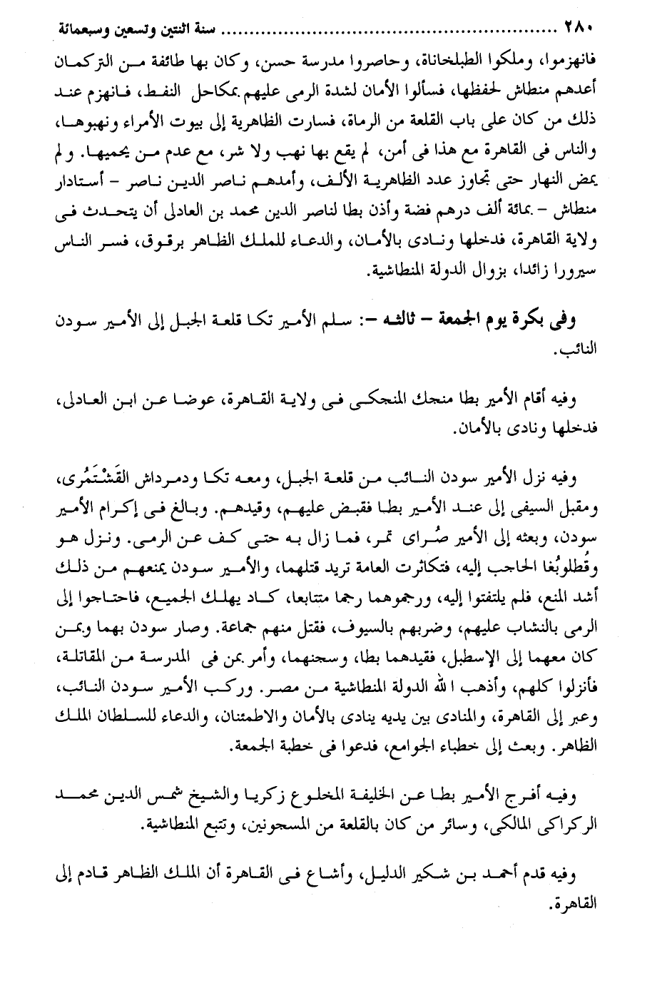 فَانْهَزَمُوا وملكوا الطبلخاناة وحاصروا مدرسة حسن وَكَانَ بهَا طَائِفَة من التركمان أعدهم منطاش لحفظها فسألوا الْأمان لشدَّة الرَّمْي عَلَيْهِم. بمكاحل النفط فَانْهَزَمَ عِنْد ذَلِك من كَانَ على بَاب القلعة من الرُّمَاة فسارت الظَّاهِرِيَّة إِلَى بيُوت الْأُمَرَاء ونهبوها وَالنَّاس فِي الْقَاهِرَة مَعَ هَذَا فِي أَمن لم يَقع بهَا نهب وَلَا شَرّ مَعَ عدم من يحميها. وَلم يمض النَّهَار حَتَّى تجَاوز عدد الظَّاهِرِيَّة الأ! ف وأمدهم نَاصِر الدّين نَاصِر - أستادار منطاش - بِمِائَة ألف دِرْهَم فضَّة وَأذن بطا لناصر الدّين مُحَمَّد بن العادلي أَن يتحدث فِي ولَايَة الْقَاهِرَة فَدَخلَهَا ونادى بالأمان وَالدُّعَاء للْملك الظَّاهِر برقوق فسر النَّاس سيروراً زَائِدا بِزَوَال الدولة المنطاشية. وَفِي بكرَة يَوْم الْجُمُعَة - ثالثه -: سلم الْأَمِير تكا قلعة الْجَبَل إِلَى الْأَمِير سودن النَّائِب. وَفِيه أَقَامَ الْأَمِير بطا منجك المنجكي فِي ولَايَة الْقَاهِرَة عوضا عَن ابْن العادلي فَدَخلَهَا ونادى بالأمان. وَفِيه نزل الْأَمِير سودن النَّائِب من قلعة الْجَبَل وَمَعَهُ تكا ودمرداش القَشْتَمري ومقبل السيفي إِلَى عِنْد الْأَمِير بطا فَقبض عَلَيْهِم وقيدهم. وَبَالغ فِي إكرام الْأَمِير سودن وَبَعثه إِلَى الْأَمِير صُراي تمر فَمَا زَالَ بِهِ حَتَّى كف عَن الرَّمْي. وَنزل هُوَ وقُطلوبُغا الْحَاجِب إِلَيْهِ فتكاثرت الْعَامَّة تُرِيدُ قتَلهما والأمير سودن يمنعهُم من ذَلِك أَشد الْمَنْع فَلم يلتفتوا إِلَيْهِ ورجوهما رجماً مُتَتَابِعًا كَاد يهْلك الْجَمِيع فاحتاجوا إِلَى الرَّمْي بالنشاب عَلَيْهِم وضربهم بِالسُّيُوفِ فَقتل مِنْهُم جمَاعَة. وَصَارَ سودن بهما وبمن كَانَ مَعَهُمَا إِلَى الإسطبل فقيدهما بطا وسجنهما وَأمر بِمن فِي الْمدرسَة من الْمُقَاتلَة فأنزلوا كلهم وأذهب الله الدولة المنطاشية من مصر. وَركب الْأَمِير سودن النَّائِب وَعبر إِلَى الْقَاهِرَة والمنادي بَين يَدَيْهِ يُنَادي بالأمان والاطمئنان وَالدُّعَاء للسُّلْطَان الْملك الظَّاهِر. وَبعث إِلَى خطباء الْجَوَامِع فدعوا فِي خطة الْجُمُعَة. وَفِيه أفرج الْأَمِير بطا عَن الْخَلِيفَة المخلوع زَكَرِيَّا وَالشَّيْخ شمس الدّين مُحَمَّد الركراكي الْمَالِكِي وَسَائِر من كَانَ بالفلعة من المسجونين وتتبع المنطاشية. وَفِيه قدم أَحْمد بن شكير الْخَلِيل وأشاع فِي الْقَاهِرَة أَن الْملك الظَّاهِر قادم إِلَى الْقَاهِرَة.