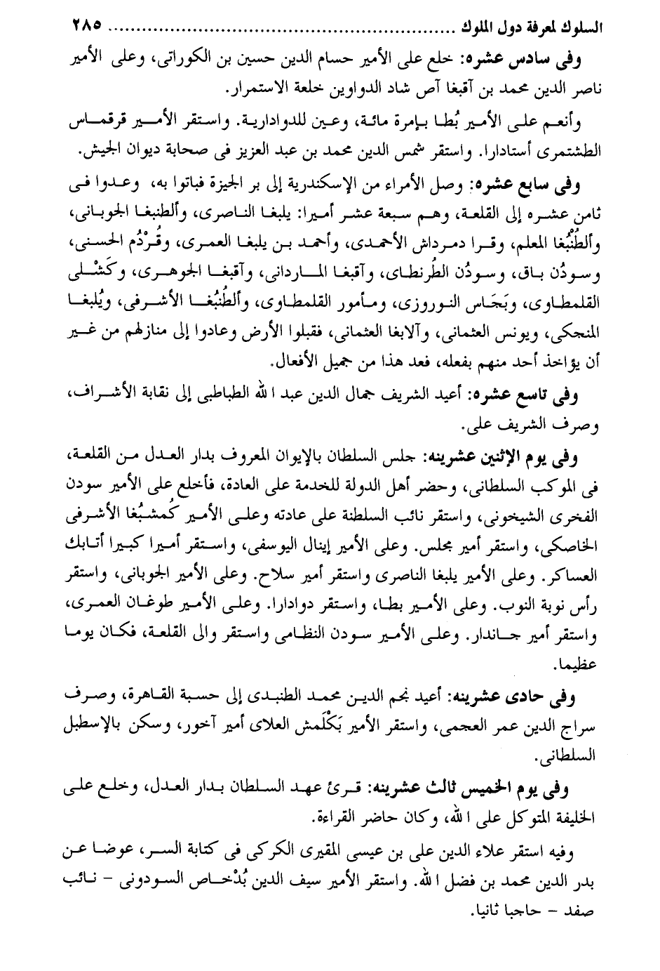 وَفِي سادس عشره: خلع على الامير حسام الدّين حُسَيْن بن الكورني وعَلى الْأَمِير نَاصِر الدّين مُحَمَّد بن أقبغا آص شاد الدَّوَاوِين خلعة الِاسْتِمْرَار. وأنعم على الْأَمِير بُطا بإمرة مائَة وَعين للدوادارية. وَاسْتقر الْأَمِير قرقماس الطشتمري أستاداراً. وَاسْتقر شمس الدّين مُحَمَّد بن عبد الْعَزِيز فِي صحابة ديوَان الْجَيْش. وَفِي سَابِع عشره: وصل الْأُمَرَاء من الْإسْكَنْدَريَّة إِلَى بر الجيزة فَبَاتُوا بِهِ وعدوا فِي ثامن عشره إِلَى القلعة وهم سَبْعَة عشر أَمِيرا: يلبغا الناصري وألطبغا الجوباني وألطبُغا الْمعلم وقرا دمرداش الأسعدي وَأحمد بن يلبغا الْعمريّ وقُرْدُم الحسني وسودُن بَاقٍ وسودُن الطُرنطاي وأقبغا المارداني وأقبغا الْجَوْهَرِي وكَشْلي القلمطاوي وبَجَاس النوروزي ومأمور القلمطاوي وألطُنبُغا الأشرفي ويُلبغا المنجكي وَيُونُس العثماني وألابغا العثماني فقبلوا الأَرْض وعادوا إِلَى مَنَازِلهمْ من غير أَن يُؤَاخذ أحد مِنْهُم بِفِعْلِهِ فعد هَذَا من جميل الْأَفْعَال. وَفِي تَاسِع عشره: أُعِيد الشريف جمال الدّين عبد الله الطاطبي إِلَى نقابة الْأَشْرَاف وَصرف الشريف عَليّ. وَفِي يَوْم الِاثْنَيْنِ عشرينه: جلس السُّلْطَان بالإيوان الْمَعْرُوف بدار الْعدْل من القلعة فِي الموكب السلطاني وَحضر أهل الدولة للْخدمَة على الْعَادة فأخلع على الْأَمِير سودن الفخري الشيخوني وَاسْتقر نَائِب السلطنة على عَادَته وعَلى الْأَمِير كُمشبغا الأشرفي الخاصكي وَاسْتقر أَمِير مجْلِس. وعَلى الْأَمِير إينال اليوسفي وَاسْتقر أَمِيرا كَبِيرا أتابك العساكر. وعَلى الْأَمِير يلبغا الناصري وَاسْتقر أَمِير سلَاح. وعَلى الْأَمِير الجوباني وَاسْتمرّ رَأس نوبَة النوب. وعَلى الْأَمِير بطا وَاسْتقر دواداراً. وعَلى الْأَمِير طوغان الْعمريّ وَاسْتقر أَمِير جاندار. وعَلى الْأَمِير سودن النظامي وَاسْتقر وَالِي القلعة فَكَانَ يَوْمًا عَظِيما. وَفِي حادي عشرينه: أُعِيد نجم الدّين مُحَمَّد الطنبدي إِلَى حسبَة الْقَاهِرَة وَصرف سراج الدّين عمر العجمي وَاسْتقر الْأَمِير بَكْلَمش العلاي أَمِير أخور وَسكن بالإسطبل السلطاني. وَفِي يَوْم الْخَمِيس ثَالِث عشرينه: قرئَ عهد السُّلْطَان بدار الْعدْل وخلع على الْخَلِيفَة المتَوَكل على الله وَكَانَ حَاضر الْقِرَاءَة. وَفِيه اسْتَقر عَلَاء الدّين على بن عِيسَى المقيري الكركي فِي كِتَابَة السِّرّ عوضا عَن بدر الدّين مُحَمَّد بن فضل الله. وَاسْتقر الْأَمِير سيف الدّين بدخاص السودوني - نَائِب صفد - حاجباً ثَانِيًا.