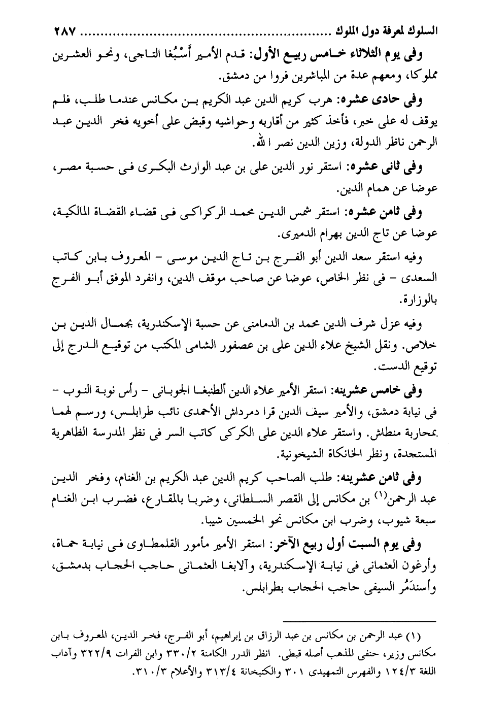 وَفِي يَوْم الثُّلَاثَاء خَامِس ربيع الأول: قدم الْأَمِير أَسْبُغا التاجي وَنَحْو الْعشْرين مَمْلُوكا وَمَعَهُمْ عدَّة من المباشرين فروا من دمشق. وَفِي حادي عشره: هرب كريم الدّين عبد الْكَرِيم بن مكانس عِنْدَمَا طلب فَلم يُوقف لَهُ على خبر فَأخذ كثير من أَقَاربه وحواشيه وَقبض على أَخَوَيْهِ فَخر الدّين عبد الرَّحْمَن نَاظر الدولة وزين الدّين نصر الله. وَفِي ثَانِي عشره: اسْتَقر نور الدّين عَليّ بن عبد الْوَارِث الْبكْرِيّ فِي حسبَة مصر عوضا عَن همام الدّين. وَفِي ثامن عشره: اسْتَقر شمس الدّين مُحَمَّد الركراكي فِي قَضَاء الْقُضَاة الْمَالِكِيَّة عوضا عَن تَاج الدّين بهْرَام الْحِمْيَرِي. وَفِيه اسْتَقر سعد الدّين أَبُو الْفرج بن تَاج الدّين مُوسَى - الْمَعْرُوف بِابْن كَاتب السَّعْدِيّ - فِي نظر الْخَاص عوضا عَن صَاحب موقف الدّين وَانْفَرَدَ الْمُوفق أَبُو الْفرج بالوزارة. وَفِيه عزل شرف الدّين مُحَمَّد بن الدمامني عَن حسبَة الْإسْكَنْدَريَّة بِجَمَال الدّين بن خلاص. وَنقل الشَّيْخ عَلَاء الدّين عَليّ بن عُصْفُور الشَّامي الْمكتب من توقيع الدرج إِلَى توقيع الدست. وَفِي خَامِس عشرينه: اسْتَقر الْأَمِير عَلَاء الدّين ألطبغا الجوباني - رَأس نوبَة النوب - فِي نِيَابَة دمشق والأمير سيف الدّين قرا دمرداش الأسعدي نَائِب طرابلس ورسم لَهما بمحاربة منطاش. وَاسْتقر عَلَاء الدّين عَليّ الكركي كَاتب السِّرّ فِي نظر الْمدرسَة الظَّاهِرِيَّة المستجدة وَفِي ثامن عشرينه: طلب الصاحب كريم الدّين عبد الْكَرِيم بن الغنام وفخر الدّين عبد الرَّحْمَن بن مكانس إِلَى الْقصر السلطاني وَضَربا بالمقارع فَضرب ابْن الغنام سَبْعَة شيوب وَضرب ابْن مكانس نَحْو الْخمسين شيباً. وَفِي يَوْم السبت أول ربيع الآخر: اسْتَقر الْأَمِير مَأْمُور القلمطاوي فِي نِيَابَة حماة وأرغون العثماني فِي نِيَابَة الْإسْكَنْدَريَّة وألابغا العثماني حَاجِب الْحجاب بِدِمَشْق وأسندَمُر السيفي حَاجِب الْحجاب بطرابلس.