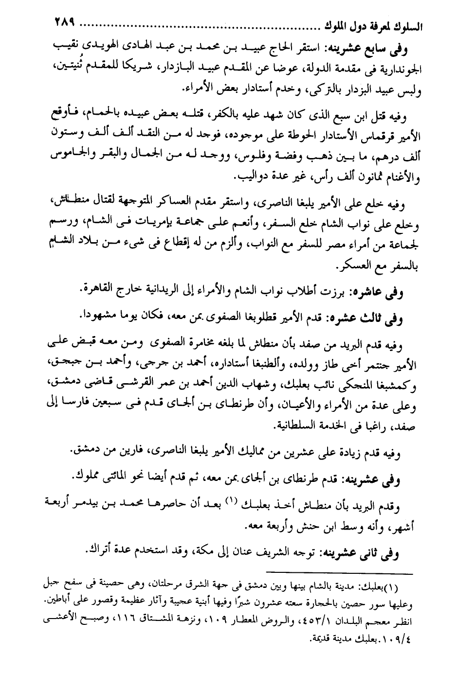 وَفِي سَابِع عشرينه: اسْتَقر الْحَاج عبيد بن مُحَمَّد بن عبد الْهَادِي الهويدي نقيب الجوندارية فِي مُقَدّمَة الدولة عوضا عَن الْمُقدم عبيد البازدار شَرِيكا للمقدم ثُنيتين وَلبس عبيد البزدار وَفِيه قتل ابْن سبع الَّذِي كَانَ شهد عَلَيْهِ بالْكفْر قَتله بعض عبيده بالحمام فأوقع الْأَمِير قرقماس الأستادار الحوطة على موجوده فَوجدَ لَهُ من النَّقْد ألف ألف وَسِتُّونَ ألف دِرْهَم مَا بَين ذهب وَفِضة وفلوس وَوجد لَهُ من الْجمال وَالْبَقر والجاموس والأغنام ثَمَانُون ألف رَأس غير عدَّة دواليب. وَفِيه خلع على الْأَمِير يلبغا الناصري وَاسْتقر مقدم العساكر المتوجهة لقِتَال منطاش وخلع على نواب الشَّام خلع السّفر وأنعم على جمَاعَة بإمريات فِي الشَّام ورسم لجَماعَة من أُمَرَاء مصر للسَّفر مَعَ النواب وألزم من لَهُ إقطاع فِي شَيْء من بِلَاد الشَّام بِالسَّفرِ مَعَ الْعَسْكَر. وَفِي عاشره: برزت أطلاب نواب الشَّام والأمراء إِلَى الريحانية خَارج الْقَاهِرَة. وَفِي ثَالِث عشره: قدم الْأَمِير قطلوبغا الصفوي. بِمن مَعَه فَكَانَ يَوْمًا مشهوداً. وَفِيه قدم الْبَرِيد من صفد بِأَن منطاش لما بلغه مخامرة الصفوي وَمن مَعَه قبض على الْأَمِير جنتمر أخي طاز وَولده وألطبغا أستاداره أَحْمد بن جرجي وَأحمد بن جبجق وكمشبغا المنجكي نَائِب بعلبك وشهاب الدّين أَحْمد بن عمر الْقرشِي قَاضِي دمشق وعَلى عدَّة من الْأُمَرَاء والأعيان وَا ن طرنطاي بن ألجاي قدم فِي سبعين فَارِسًا إِلَى صفد رَاغِبًا فِي الْخدمَة السُّلْطَانِيَّة. وَفِيه قدم زِيَادَة على عشْرين من مماليك الْأَمِير يلبغا الناصري فارين من دمشق. وَقدم الْبَرِيد بِأَن منطاش أَخذ بعلبك بعد أَن حاصرها مُحَمَّد بن بيدمر أَرْبَعَة أشهر وَأَنه وسط ابْن حَنش وَأَرْبَعَة مَعَه. وَفِي ثَانِي عشرينه: توجه الشريف عنان إِلَى مَكَّة وَقد استخدم عدَّة أتراك.